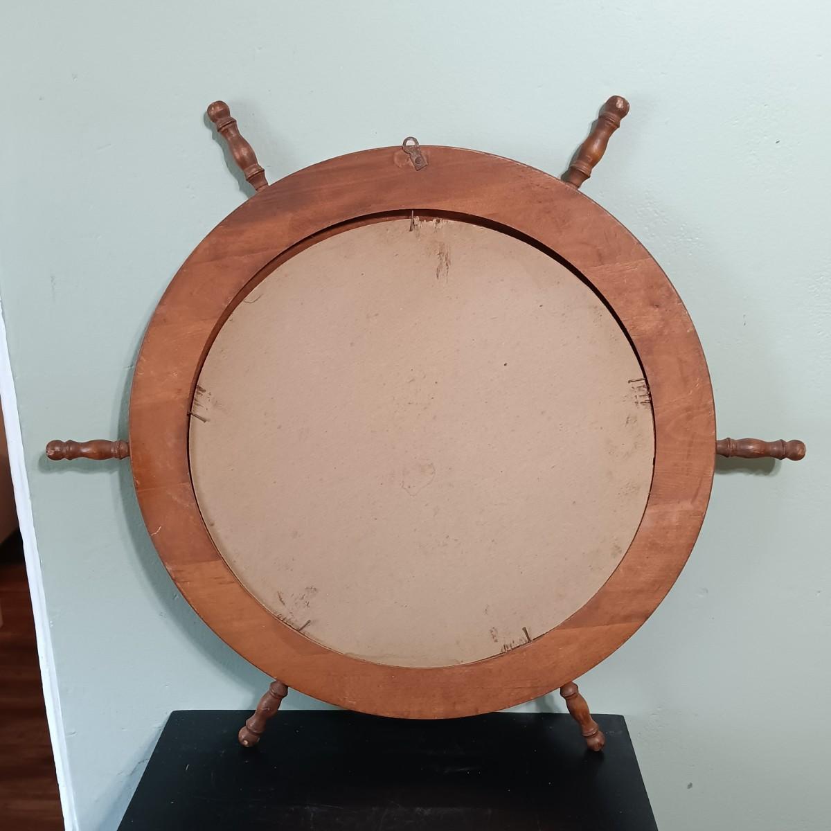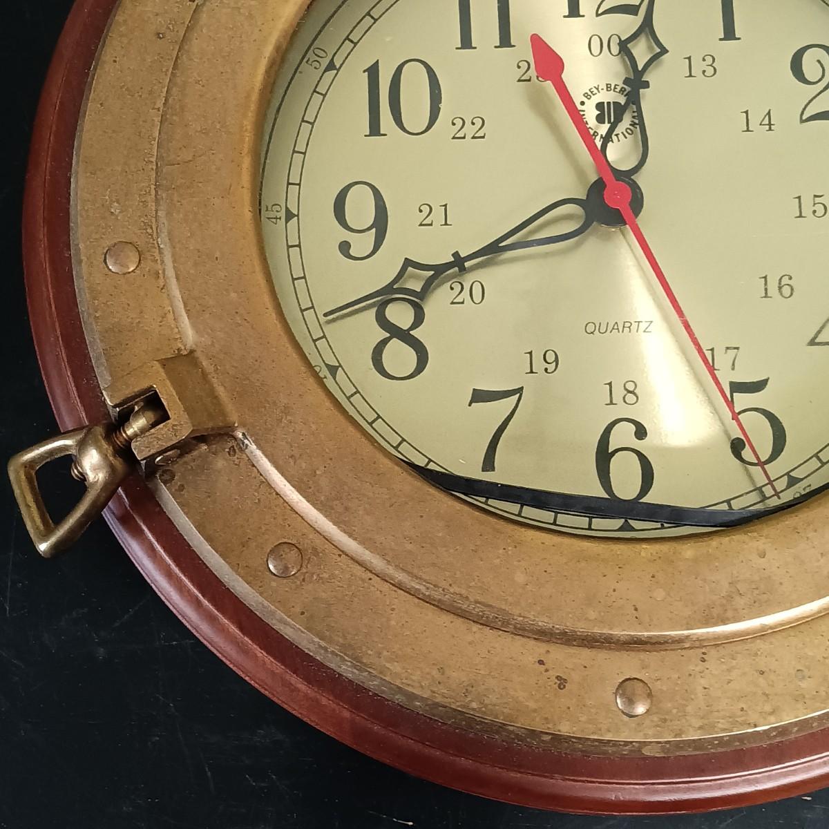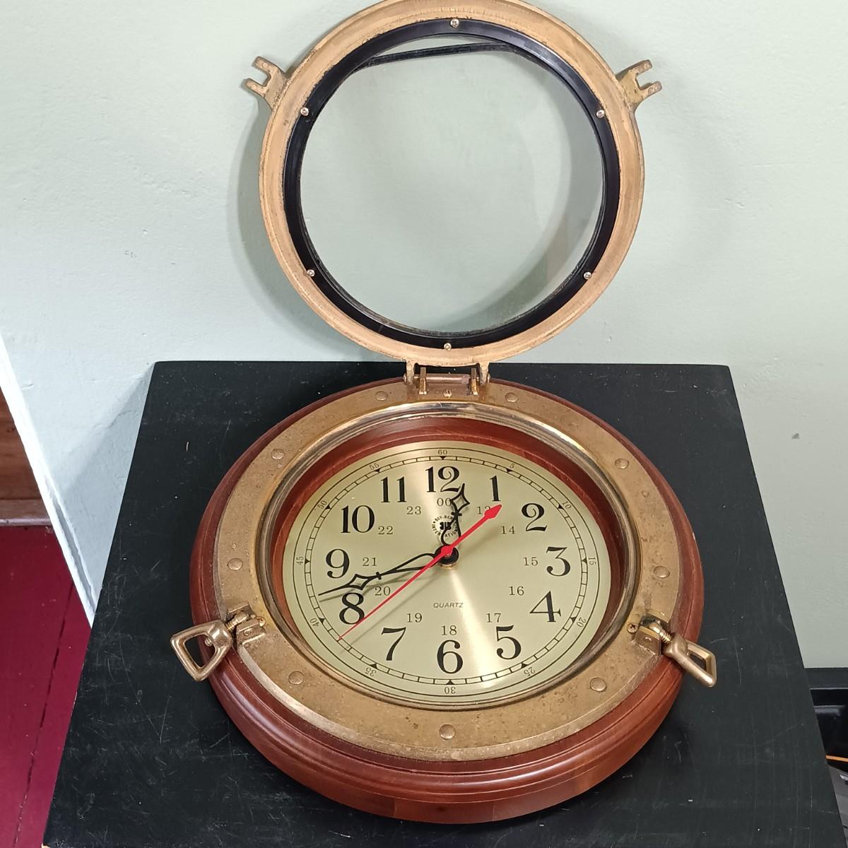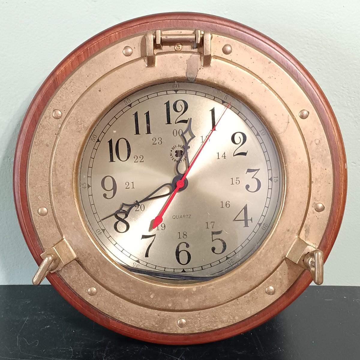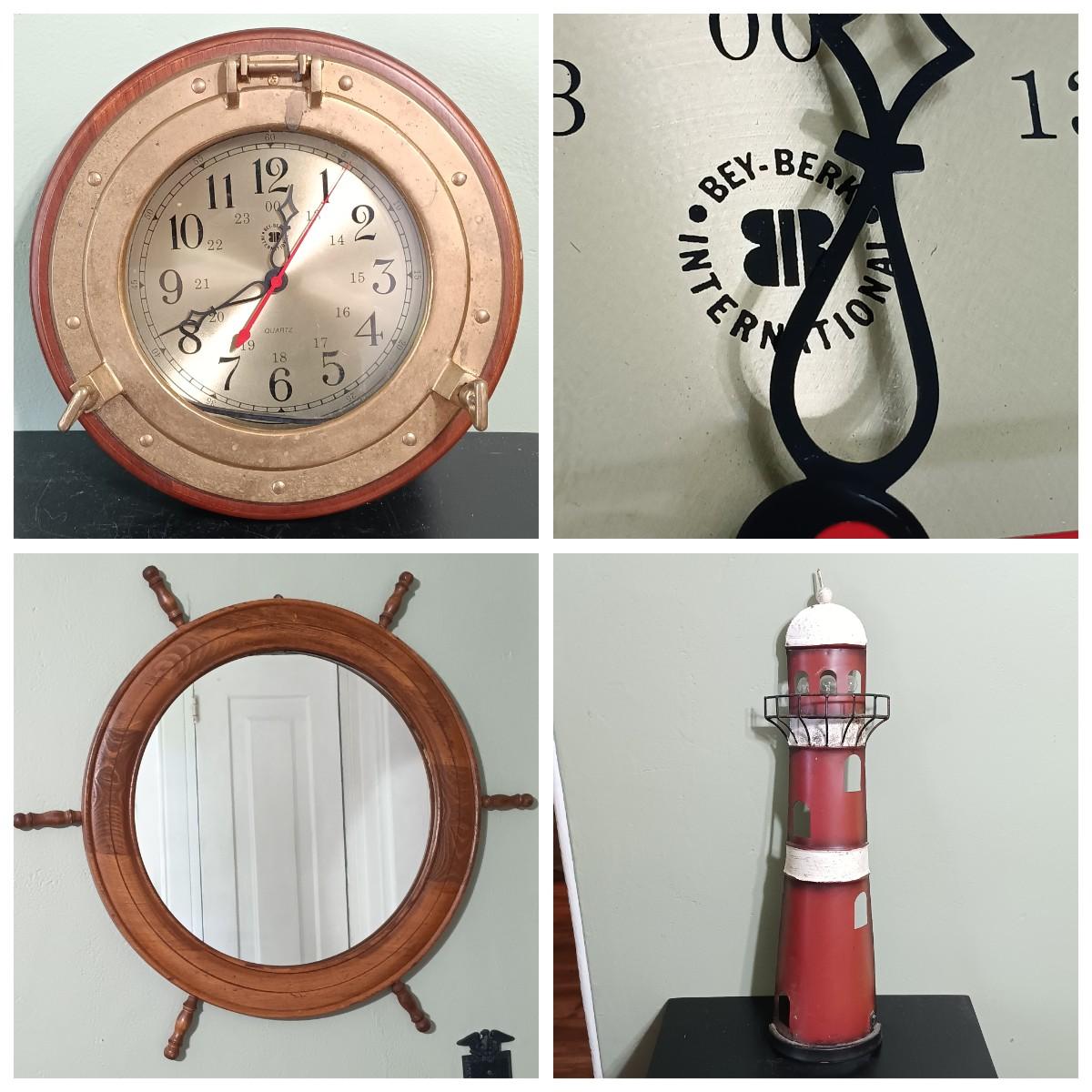 LOT 13: Bey Berk Brass Porthole Clock with Wooden Ship's Wheel Mirror & Lighthouse Wall Decor