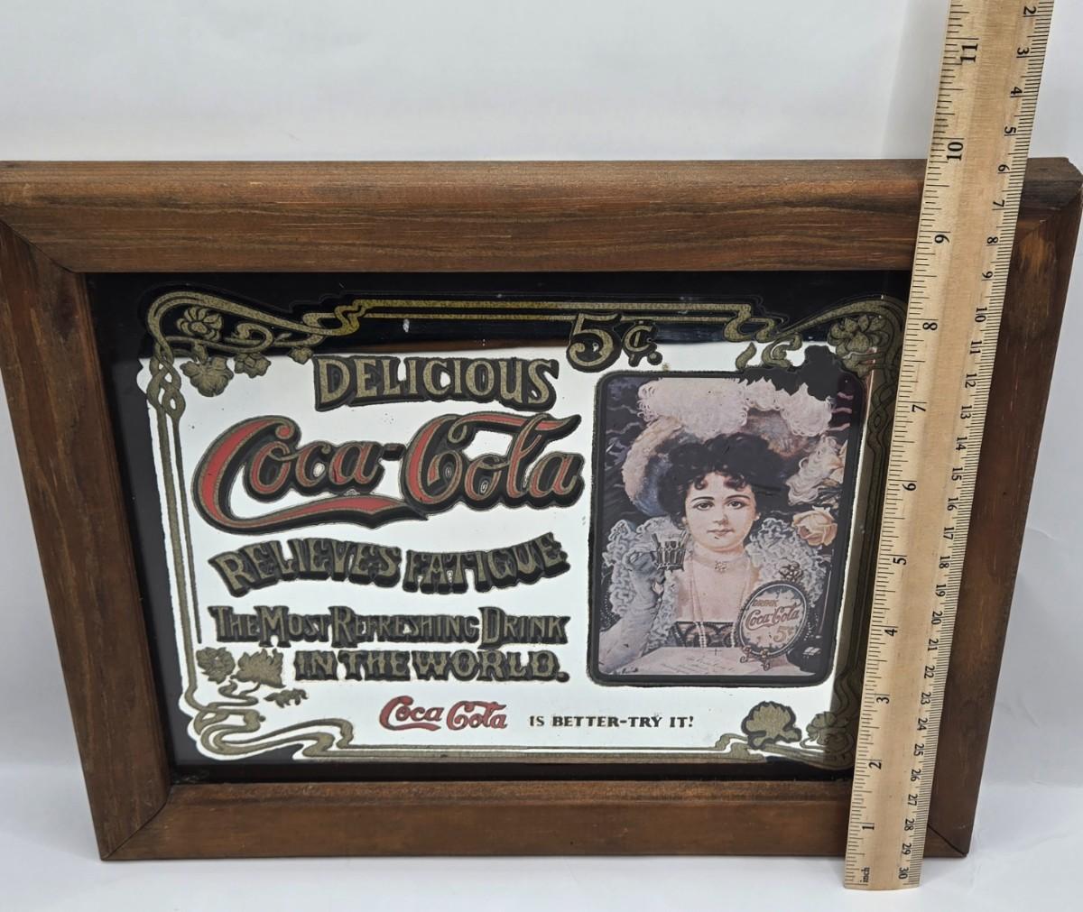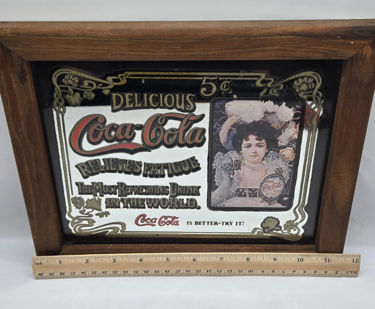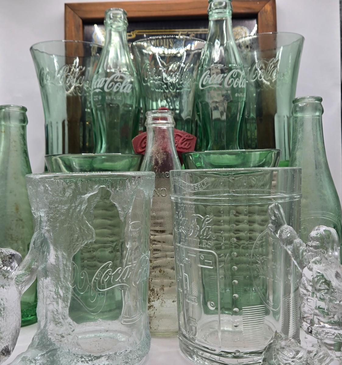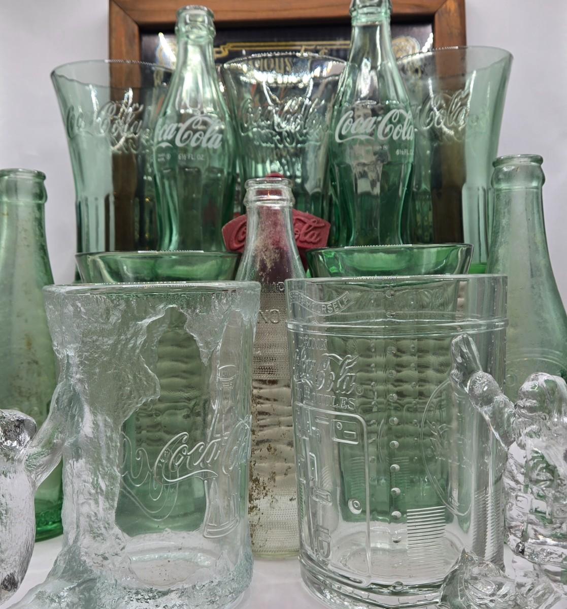 LOT 28: Have a Coke and a Smile/ Coca-Cola Glasses, Bottles, Metal Bottle Opener, and Framed Mirror
