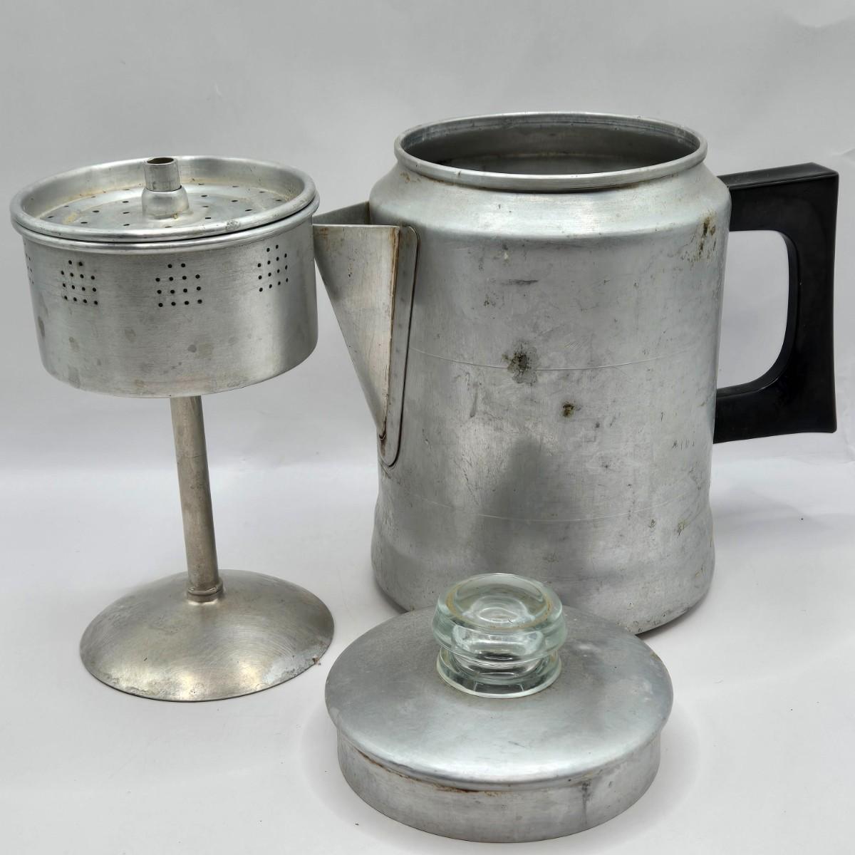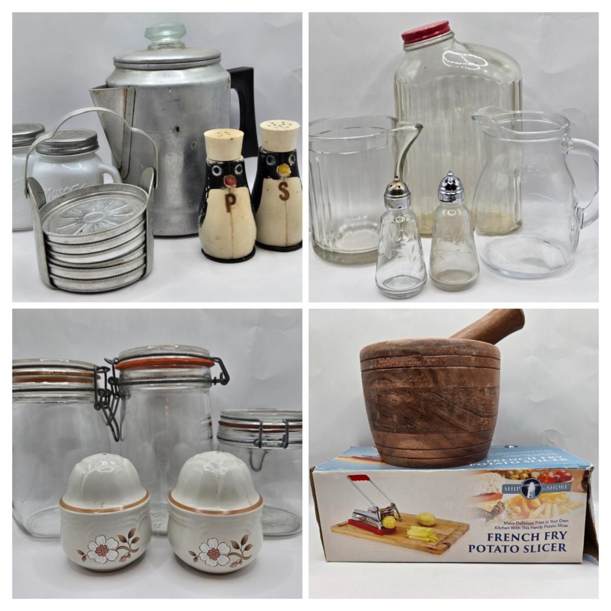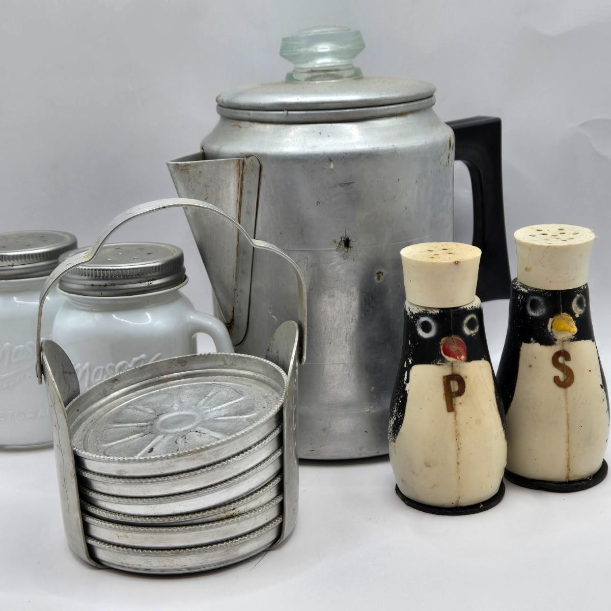 LOT 37: Kitchen Cabinet Lot Including Salt and Pepper Shakers, Vintage Coffee Pot, Coasters, Mortar and Pestle, and More