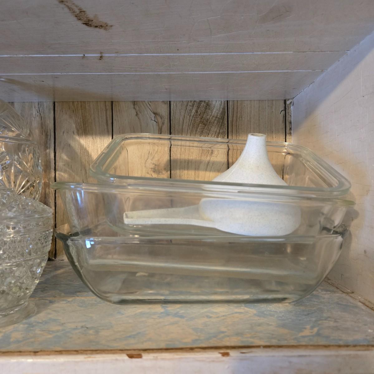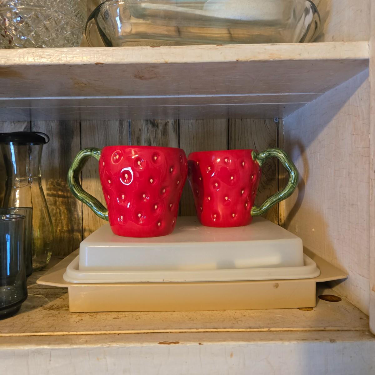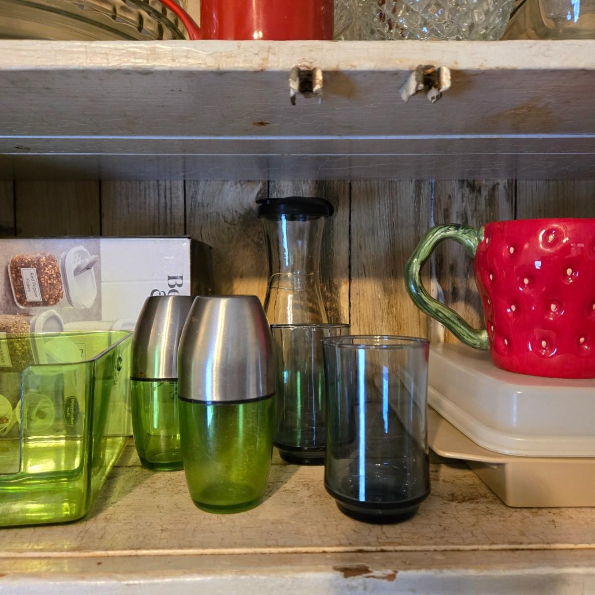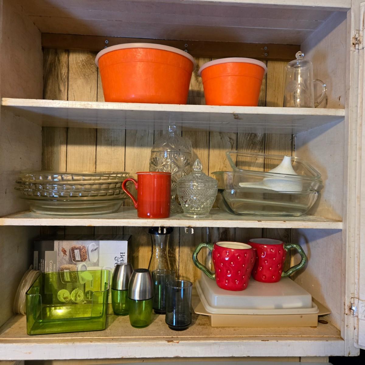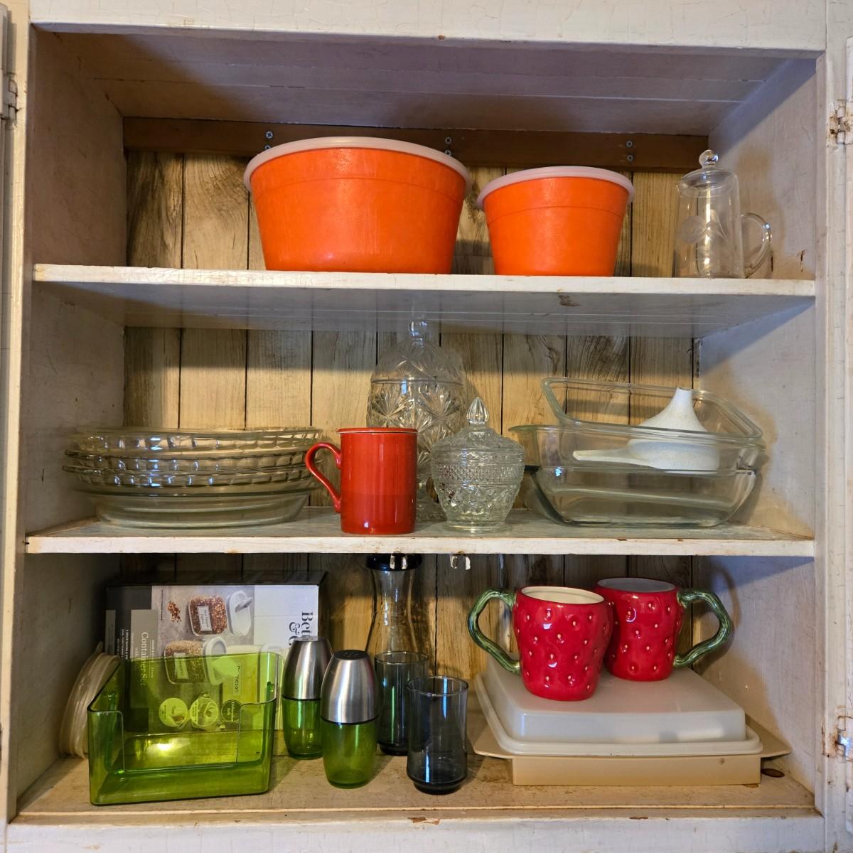 LOT 38: Kitchen Cabinet Lot: Tupperware Egg Tray, Avocado Green Napkin Holder & Salt/Pepper Shakers Strawberry Mugs, Glass Pie Pans, and More