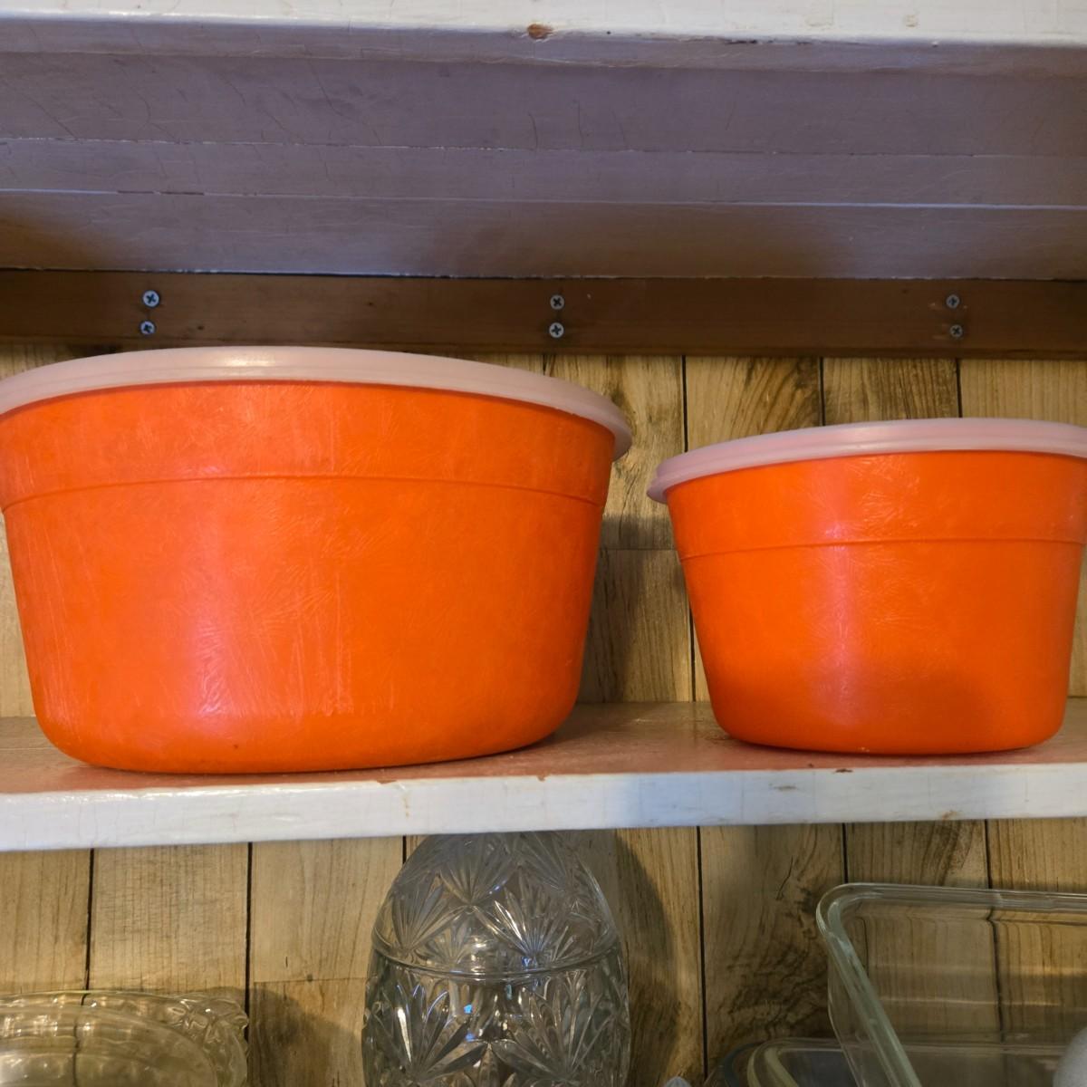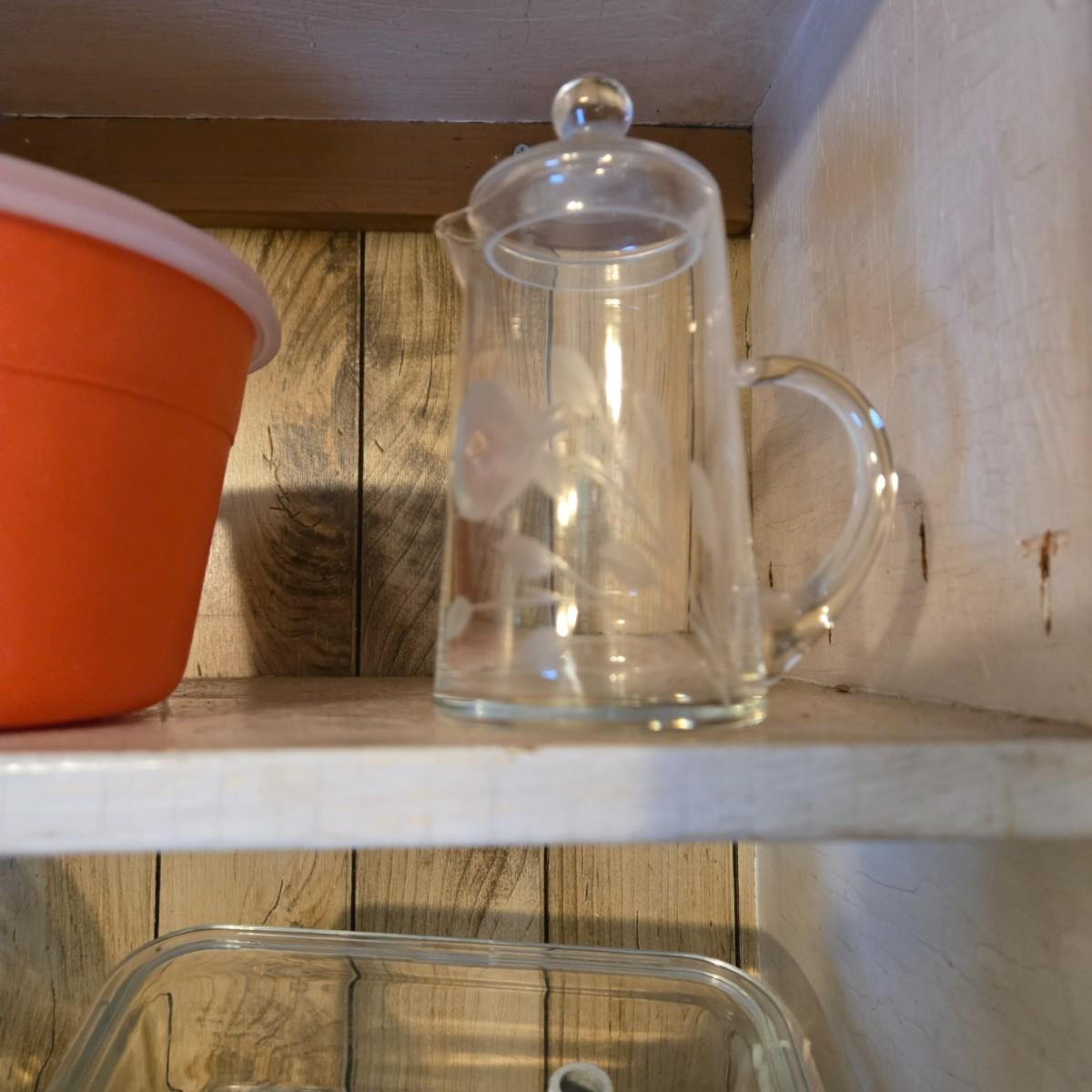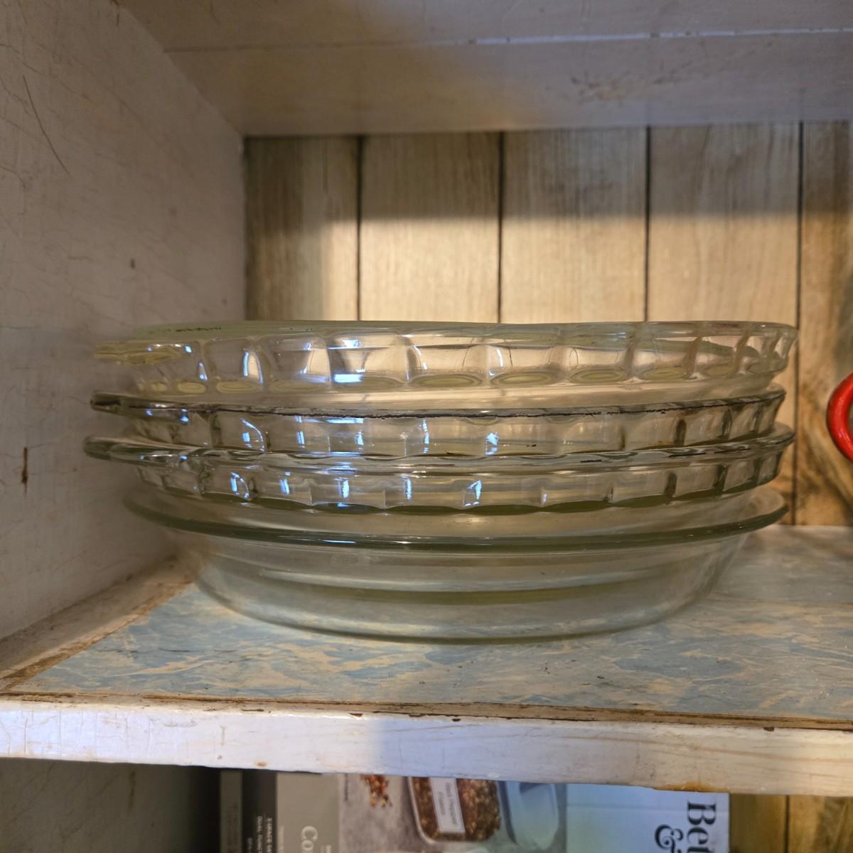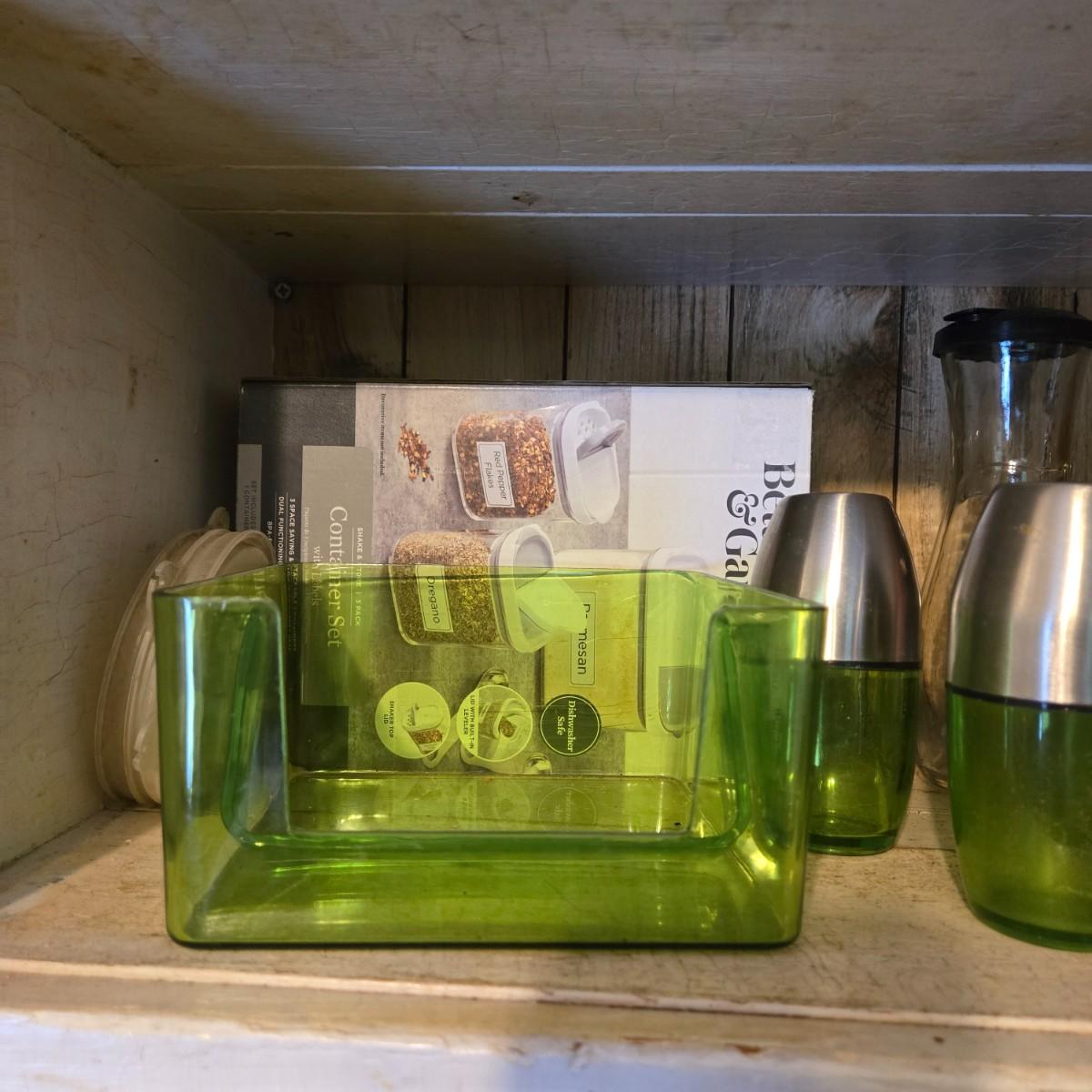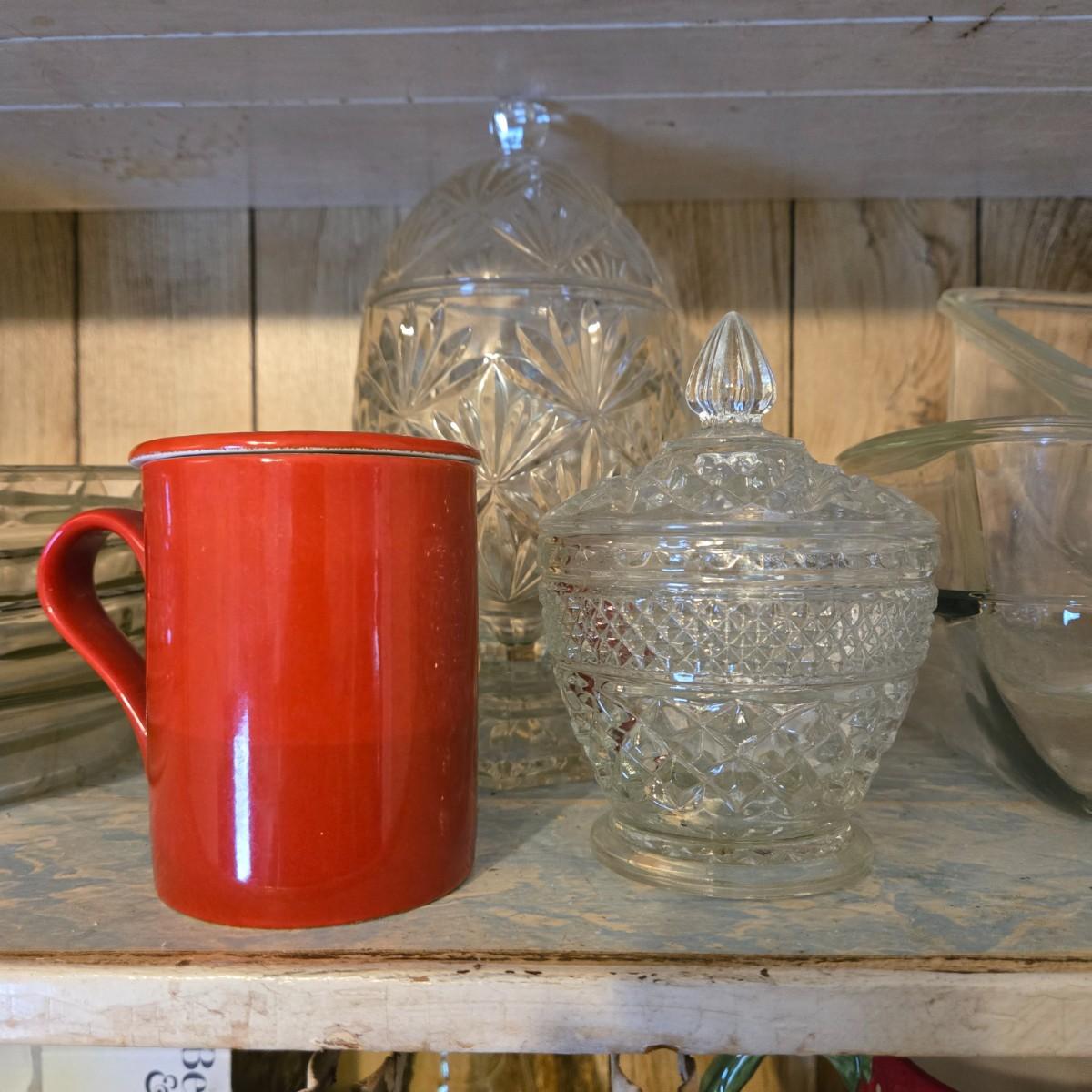 LOT 38: Kitchen Cabinet Lot: Tupperware Egg Tray, Avocado Green Napkin Holder & Salt/Pepper Shakers Strawberry Mugs, Glass Pie Pans, and More