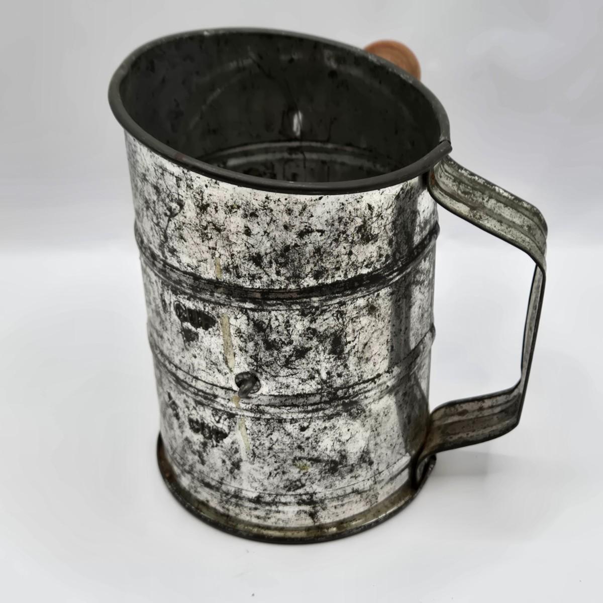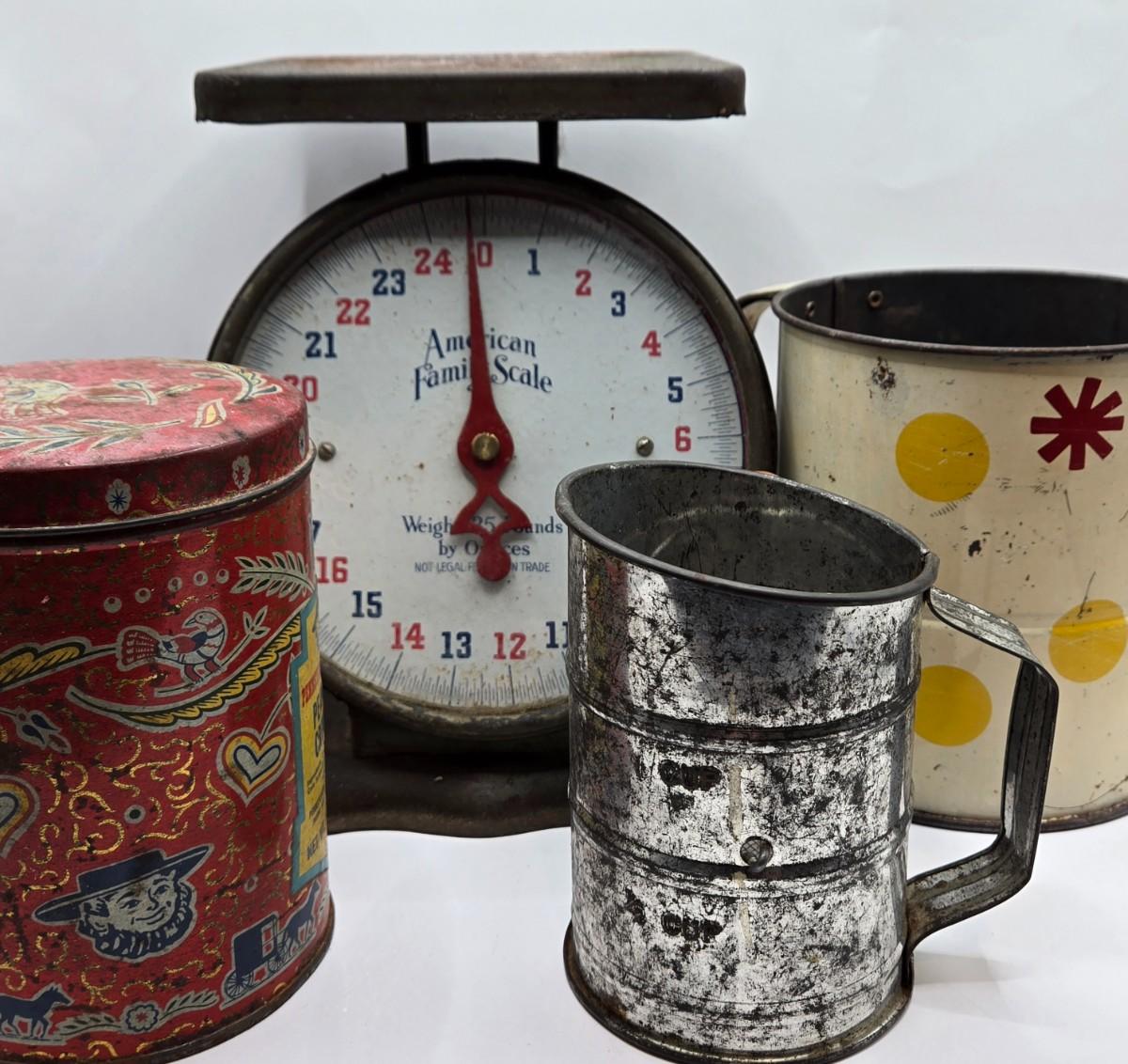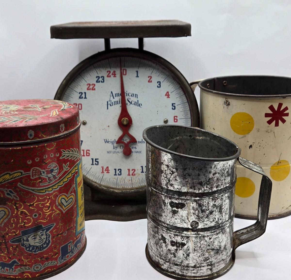 LOT 40: Vintage American Family Kitchen Scale, Androck Flour Sifter, Pennsylvania Dutch Peanut Crunch Tin & More