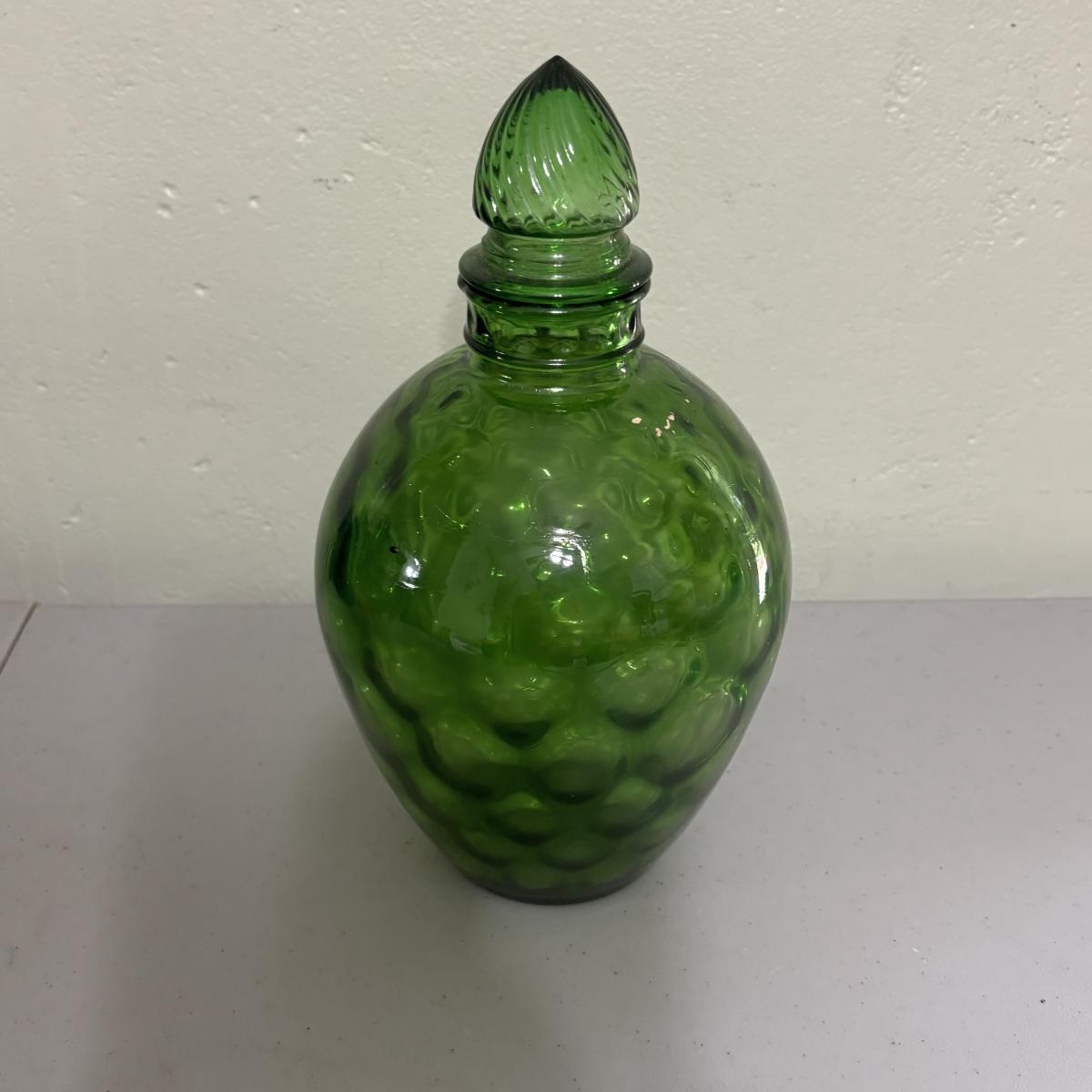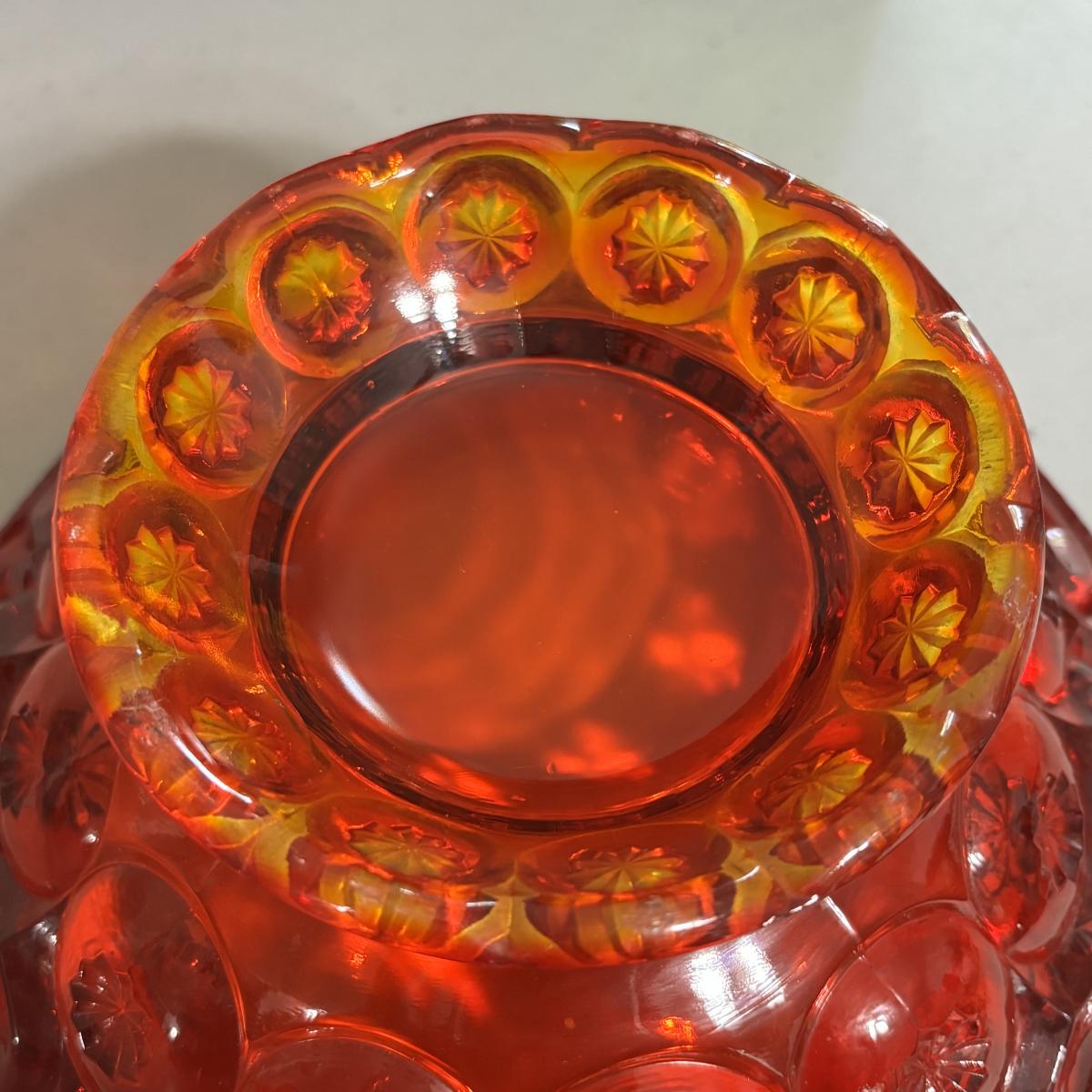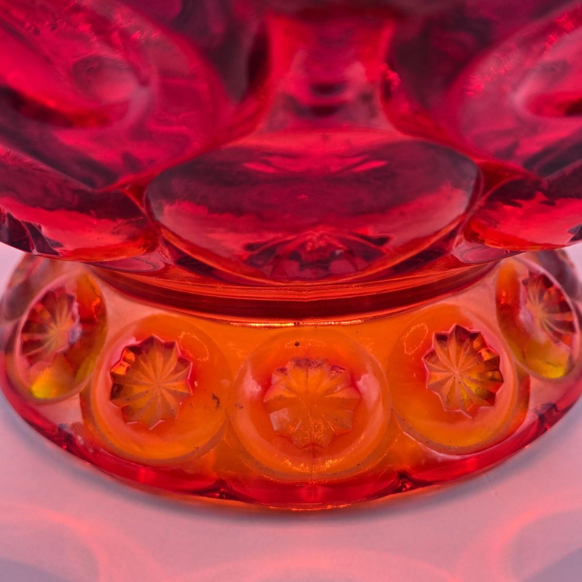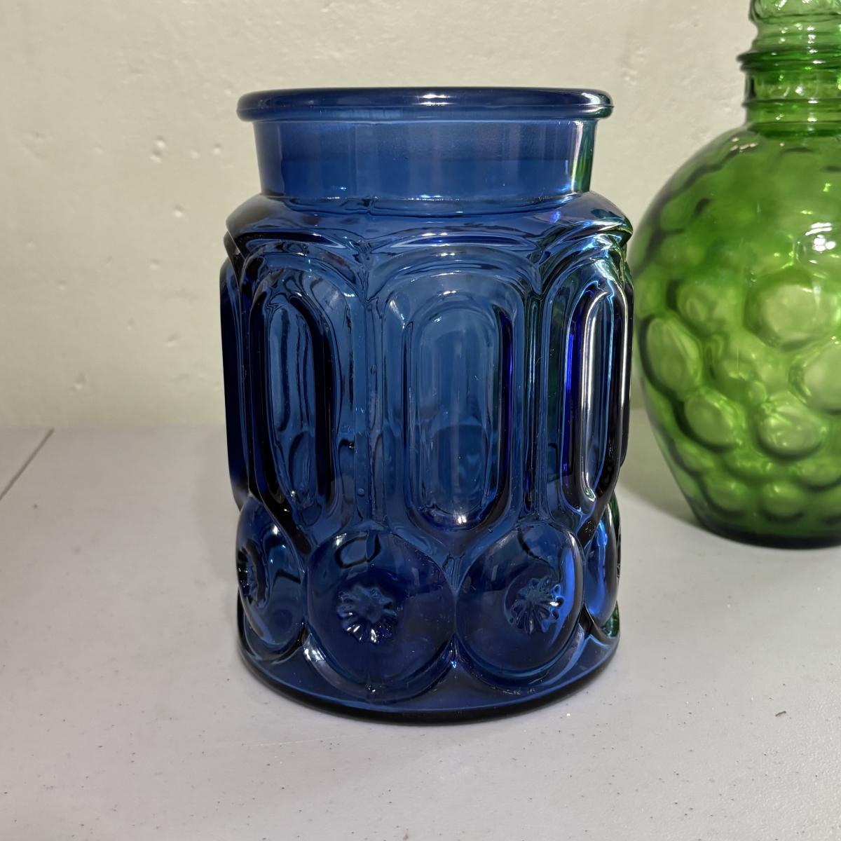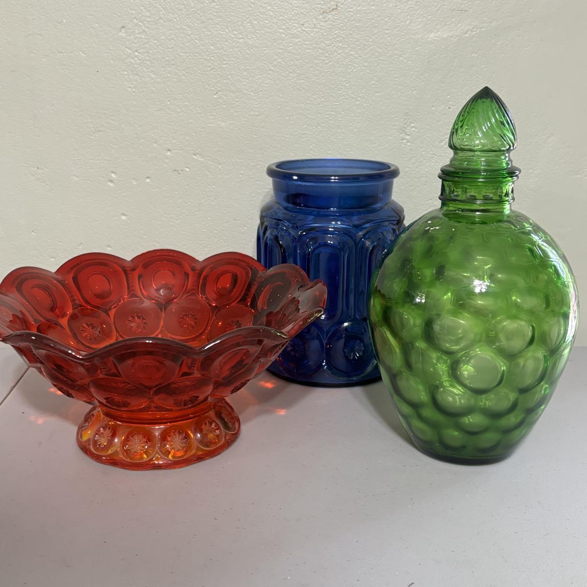 LOT 43: Look at Those Colors! Vintage Amberina Glass Scalloped Edge Pedestal Candy Dish/Bowl, Green Glass Raised Bubble Vase Bottle/Vase, Cobalt Blue Canister/Jar (maybe missing lid)