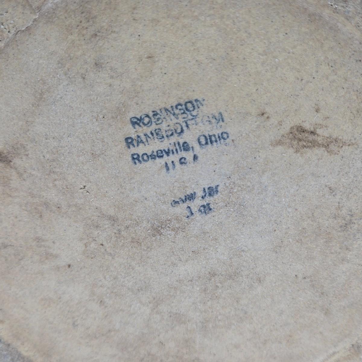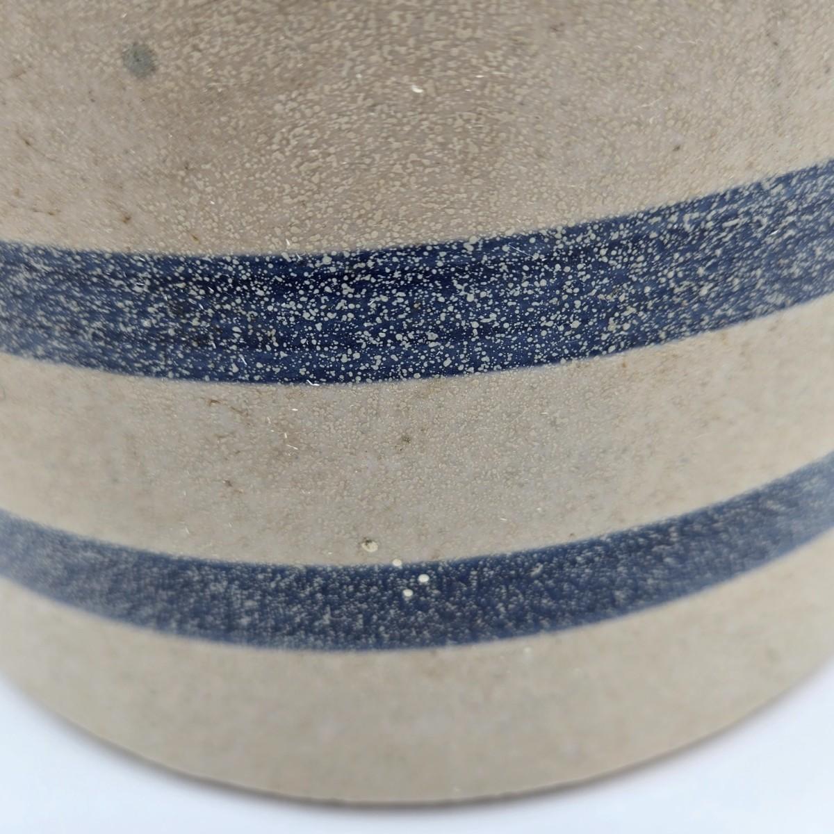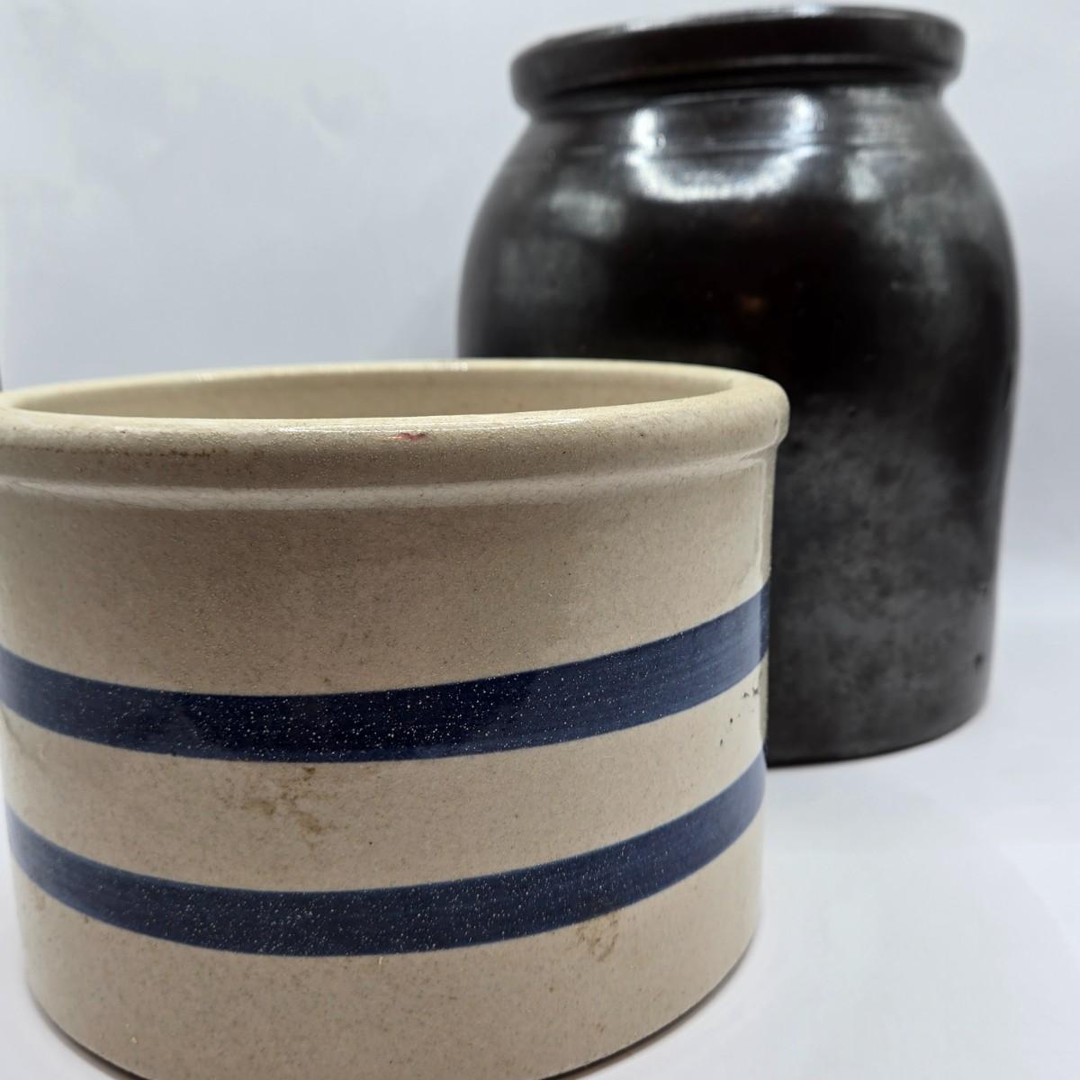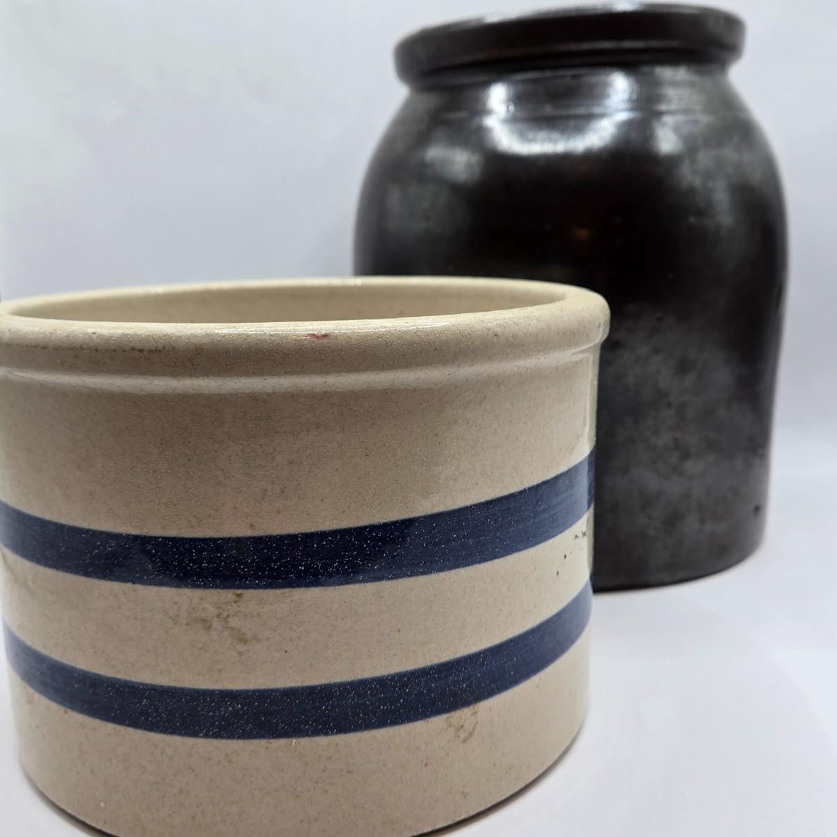 LOT 46: Vintage Robinson Ransbottom, Roseville Ohio 1qt. Blue Stripped Crock/Jar along with a Brown Glazed Crock