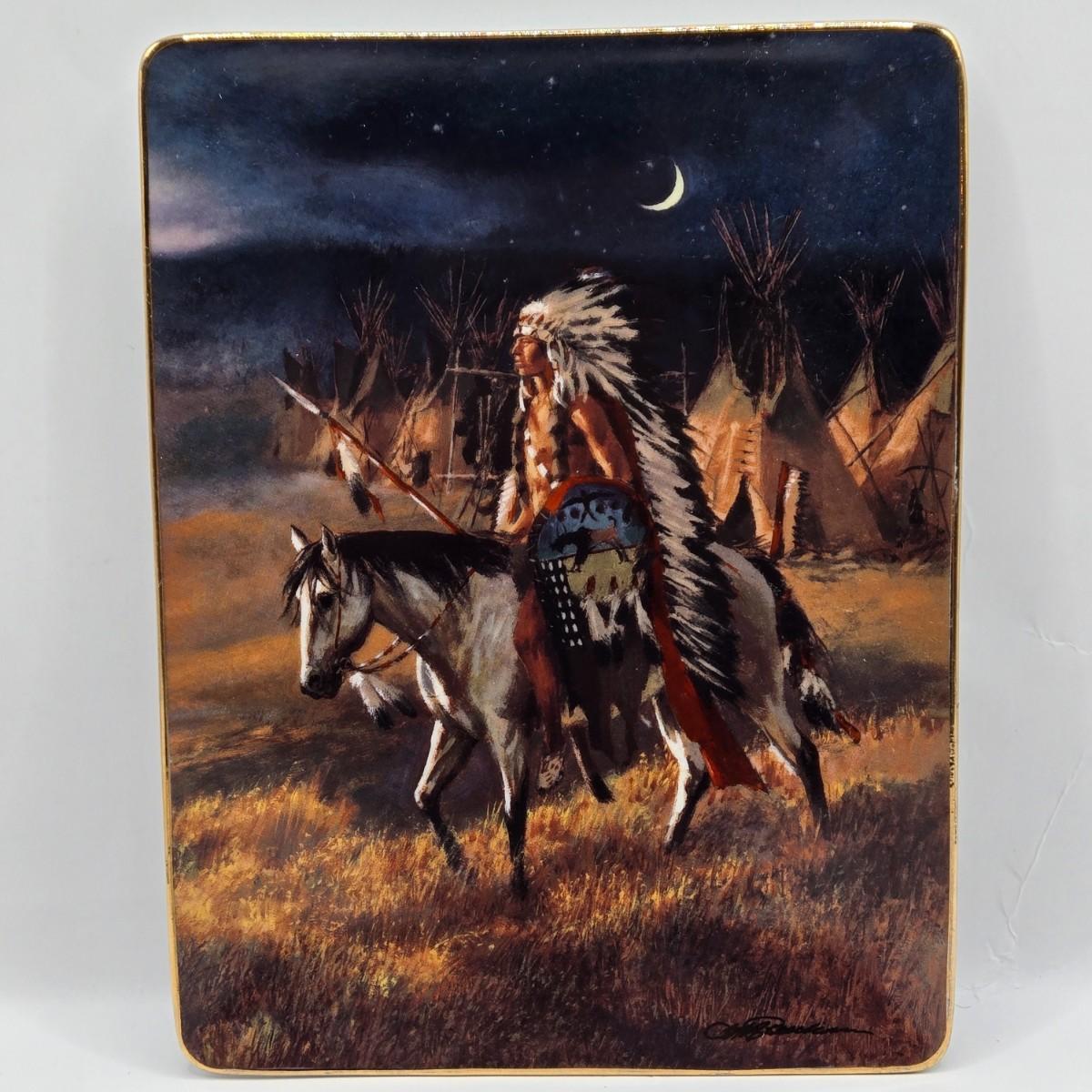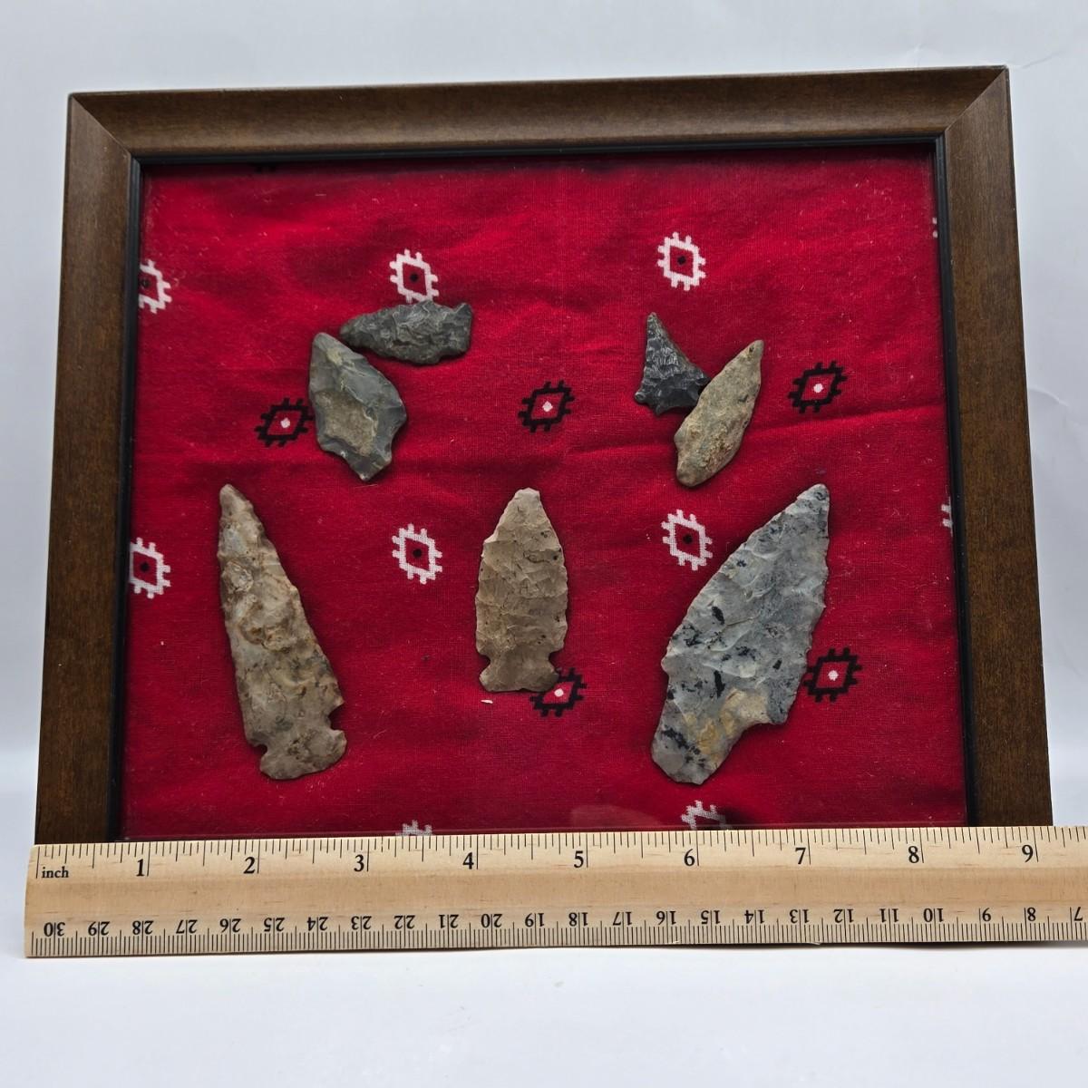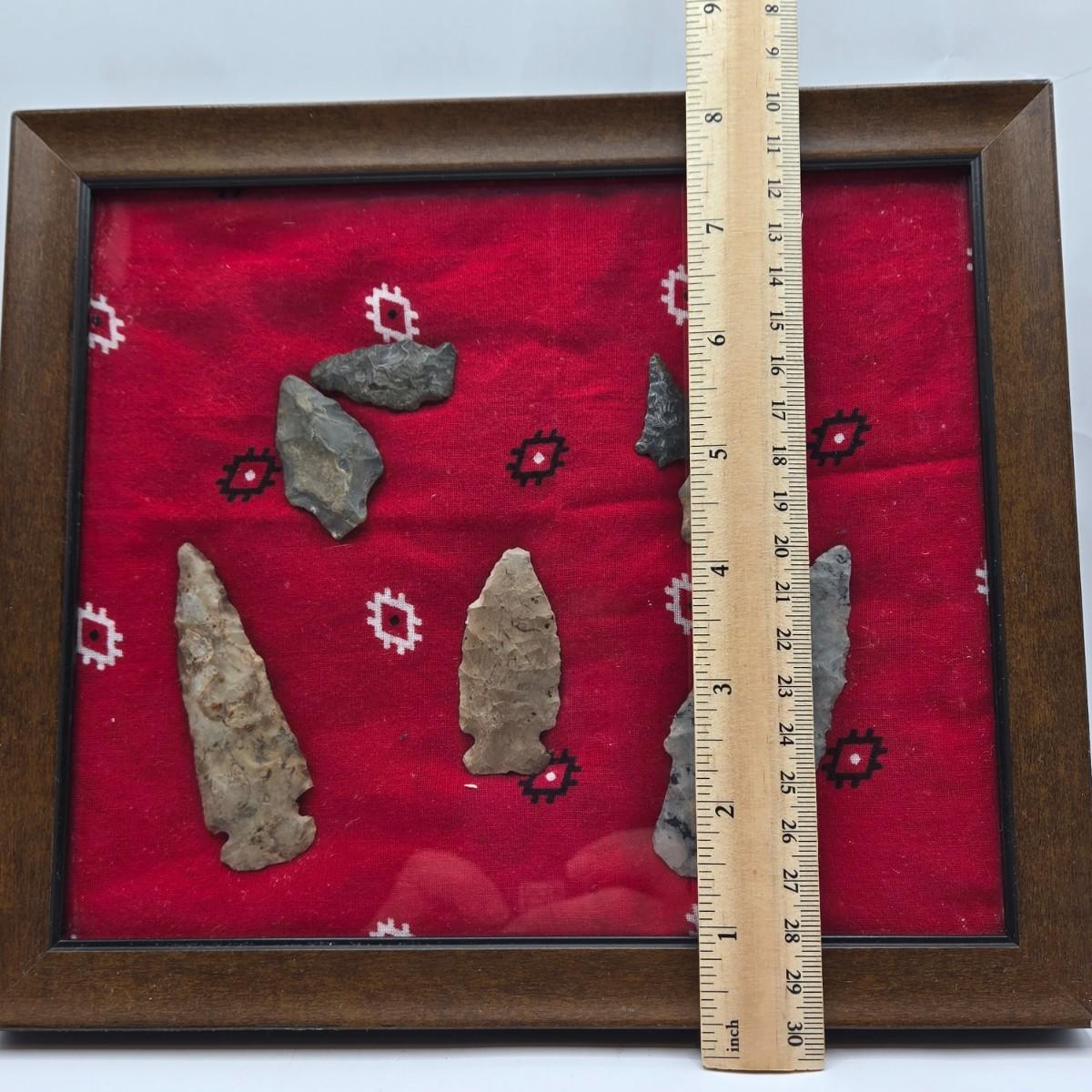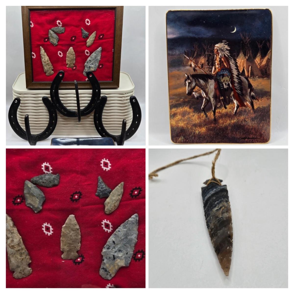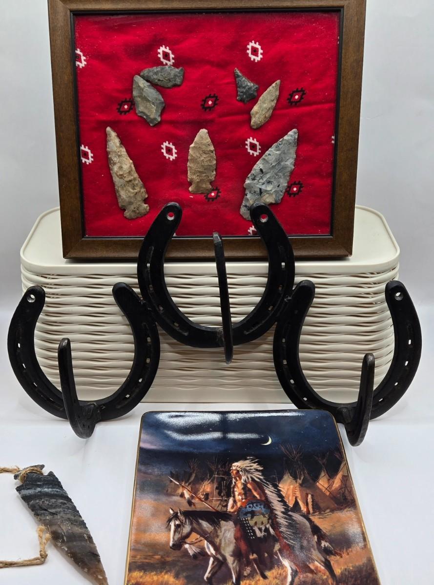 LOT 47: Framed Arrowheads, Horseshoe Coat Rack. Franklin Mint Moonlight Watch Numbered Plate, and Large Arrowhead