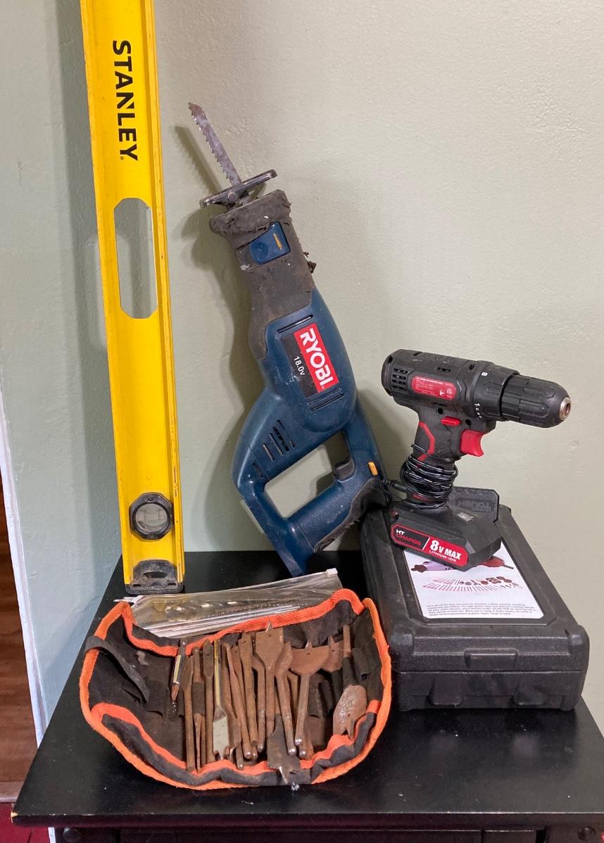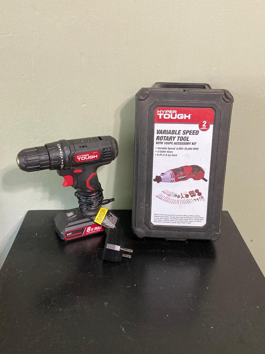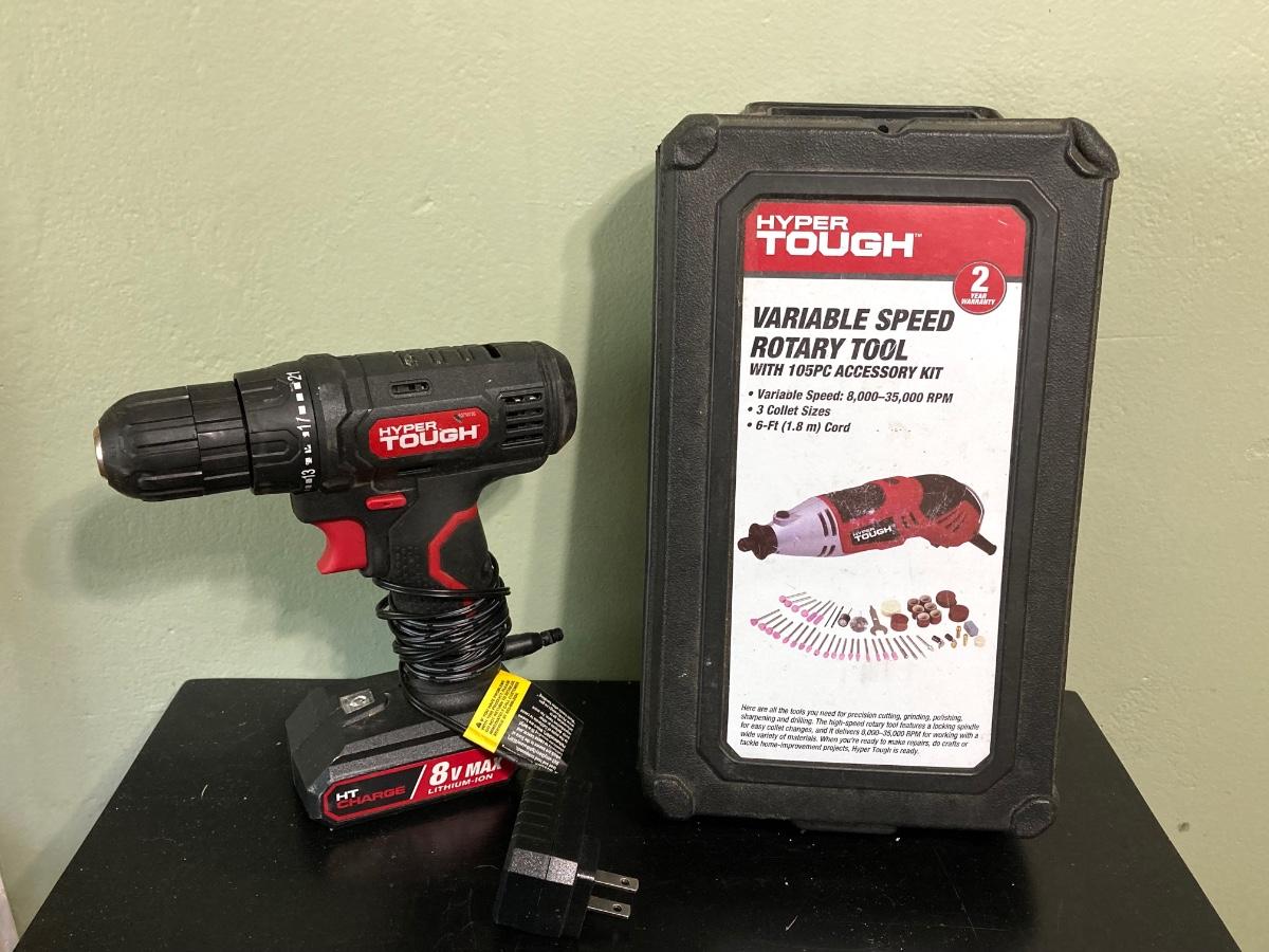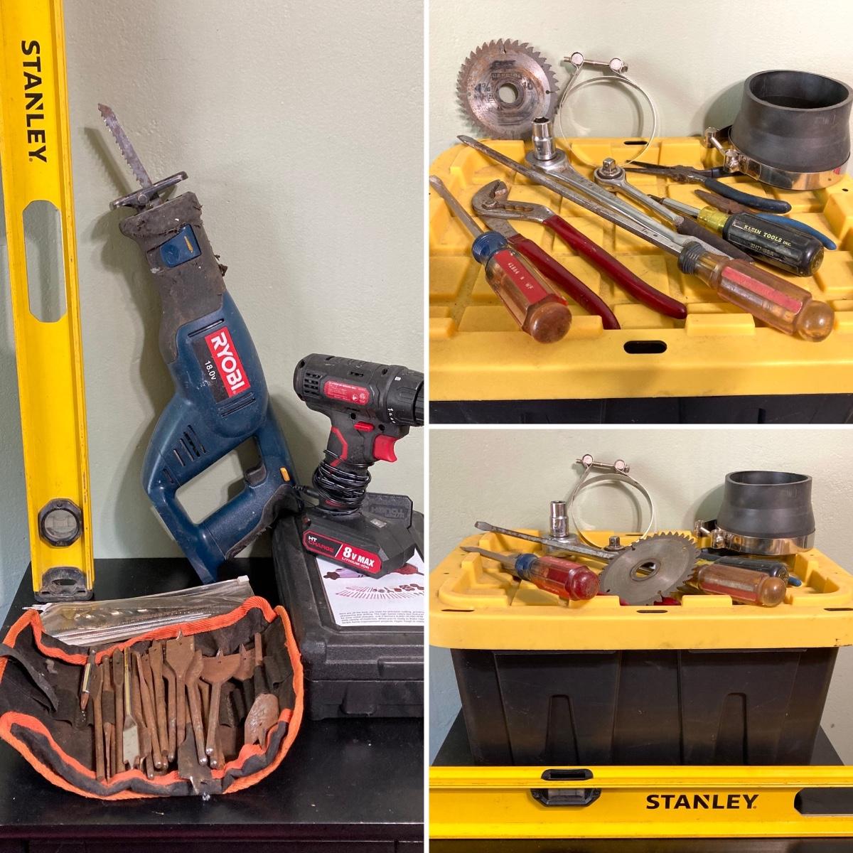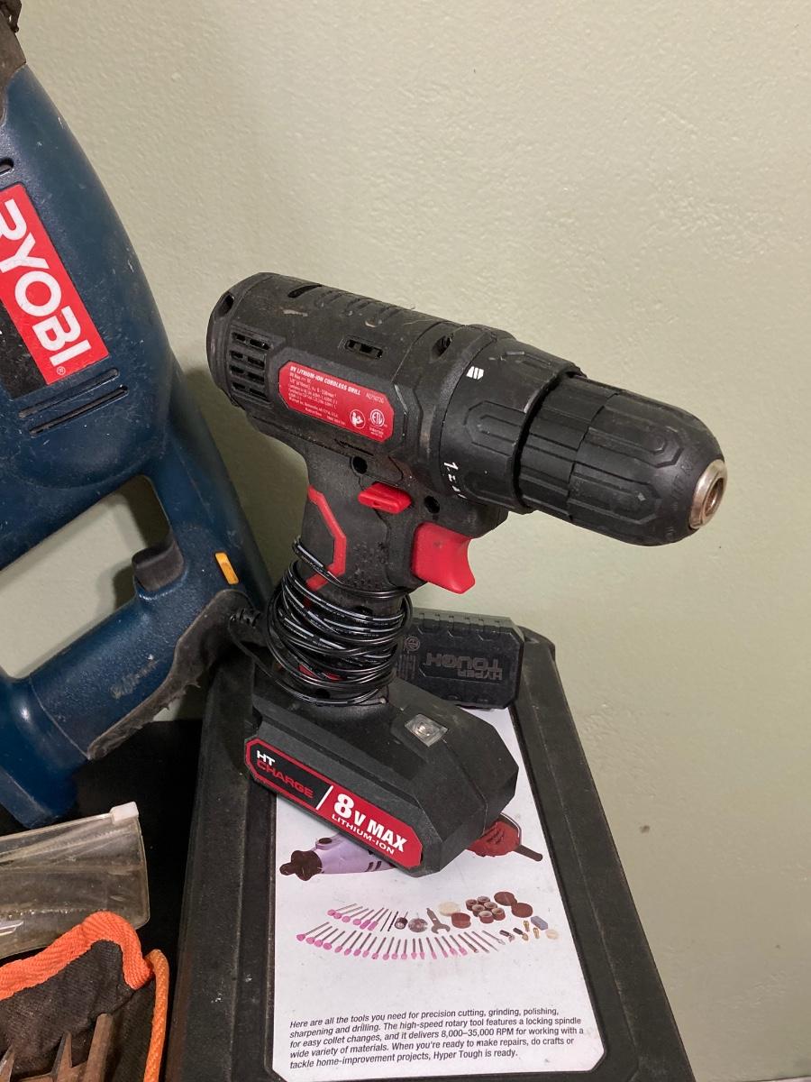 LOT 59: Assorted Tools - Hyper Tough Drill, Dremel Rotary Tool, Tough Box Storage Tote, Ryobi Reciprocating Saw, Hand Tools and More