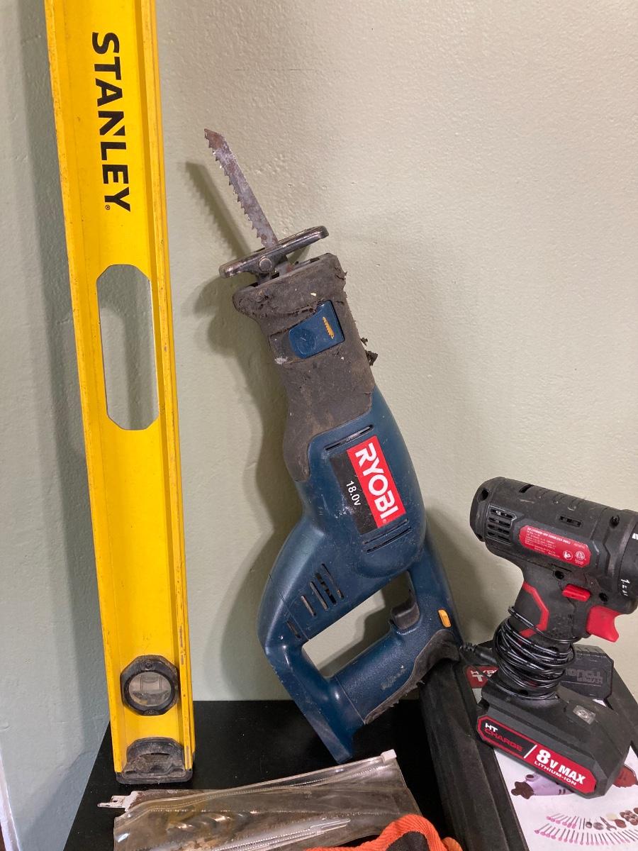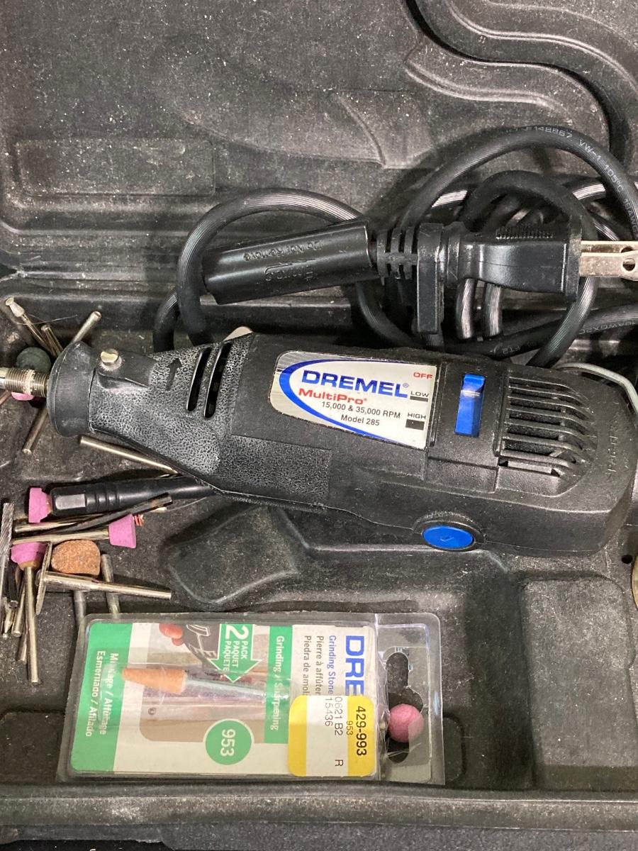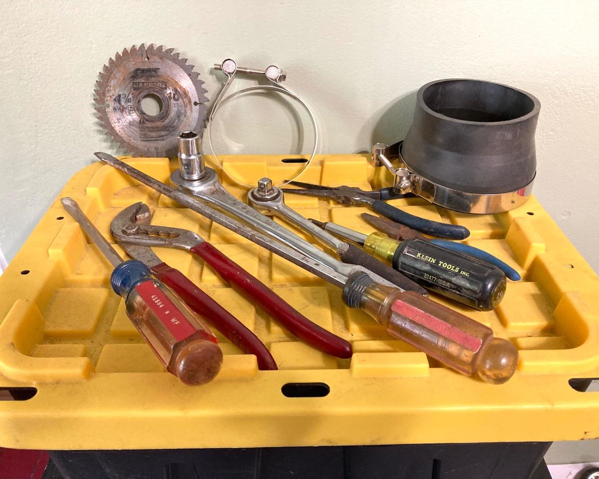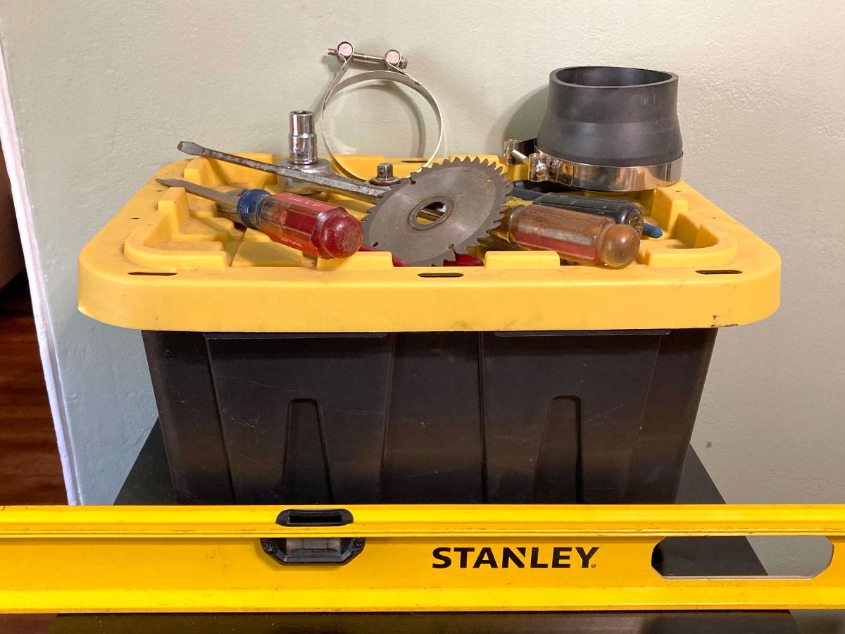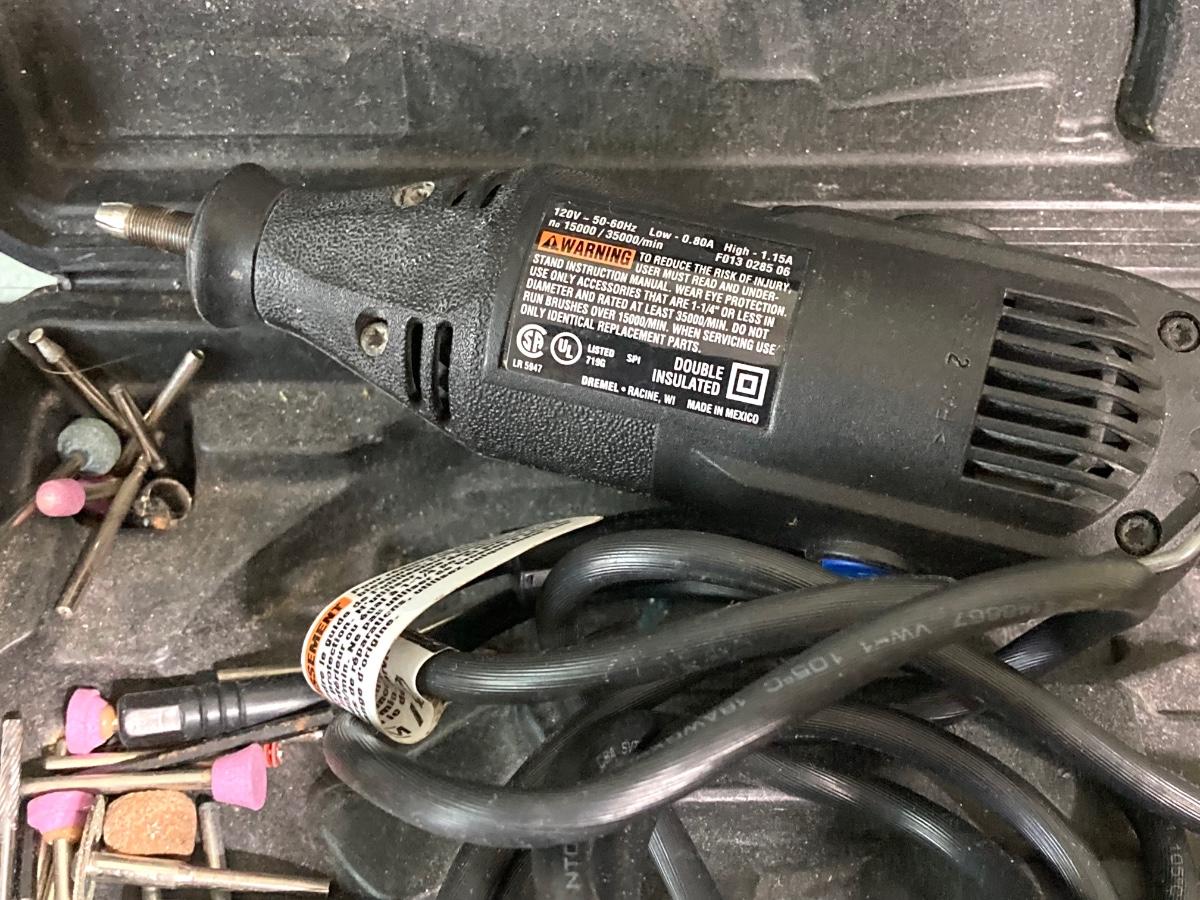 LOT 59: Assorted Tools - Hyper Tough Drill, Dremel Rotary Tool, Tough Box Storage Tote, Ryobi Reciprocating Saw, Hand Tools and More