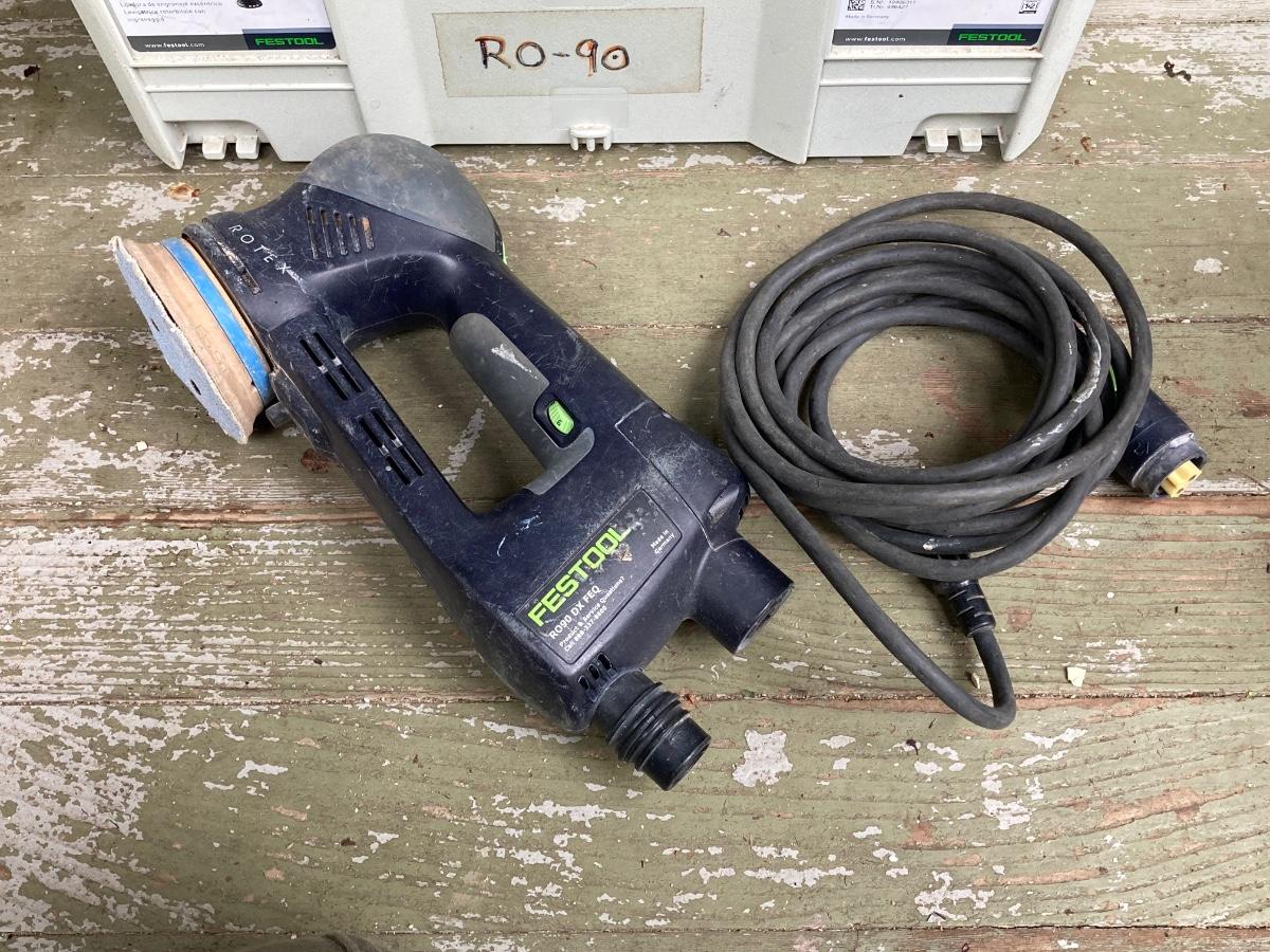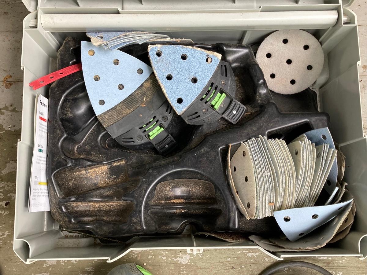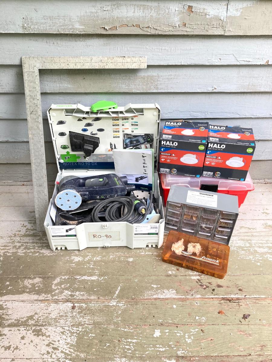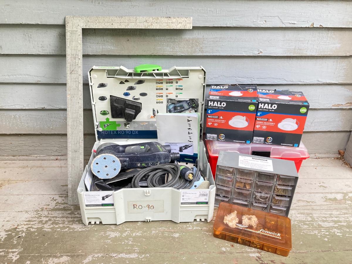 LOT 71: Festool Rotex RO 90 DX FEQ-Plus Sanding Tool in Case, Tools, Storage Boxes with Hardware and Pair of Halo Lights