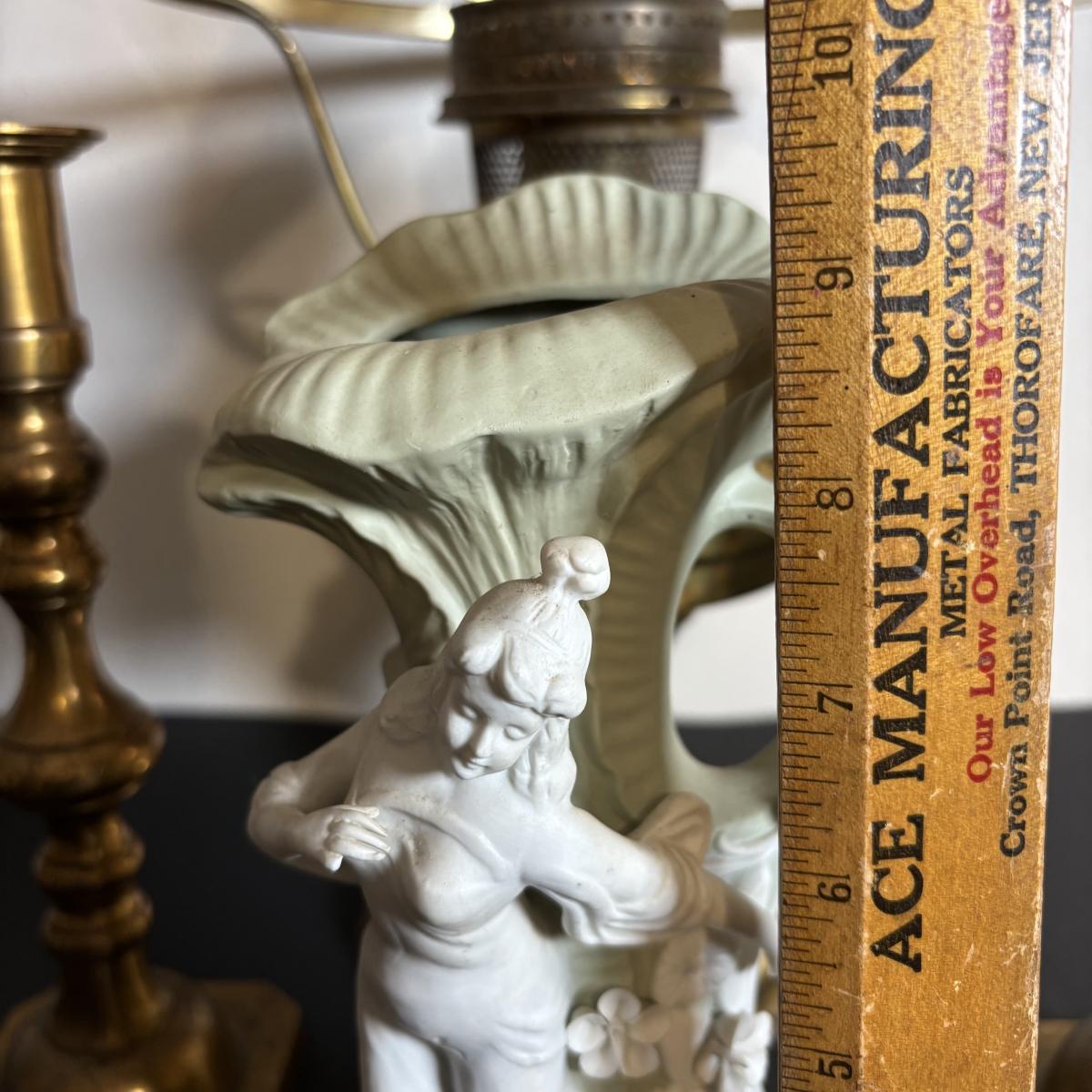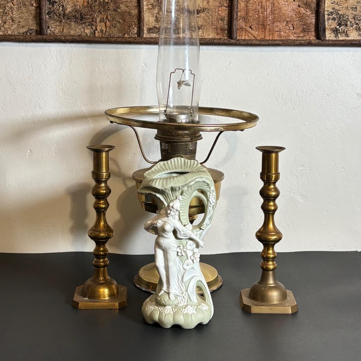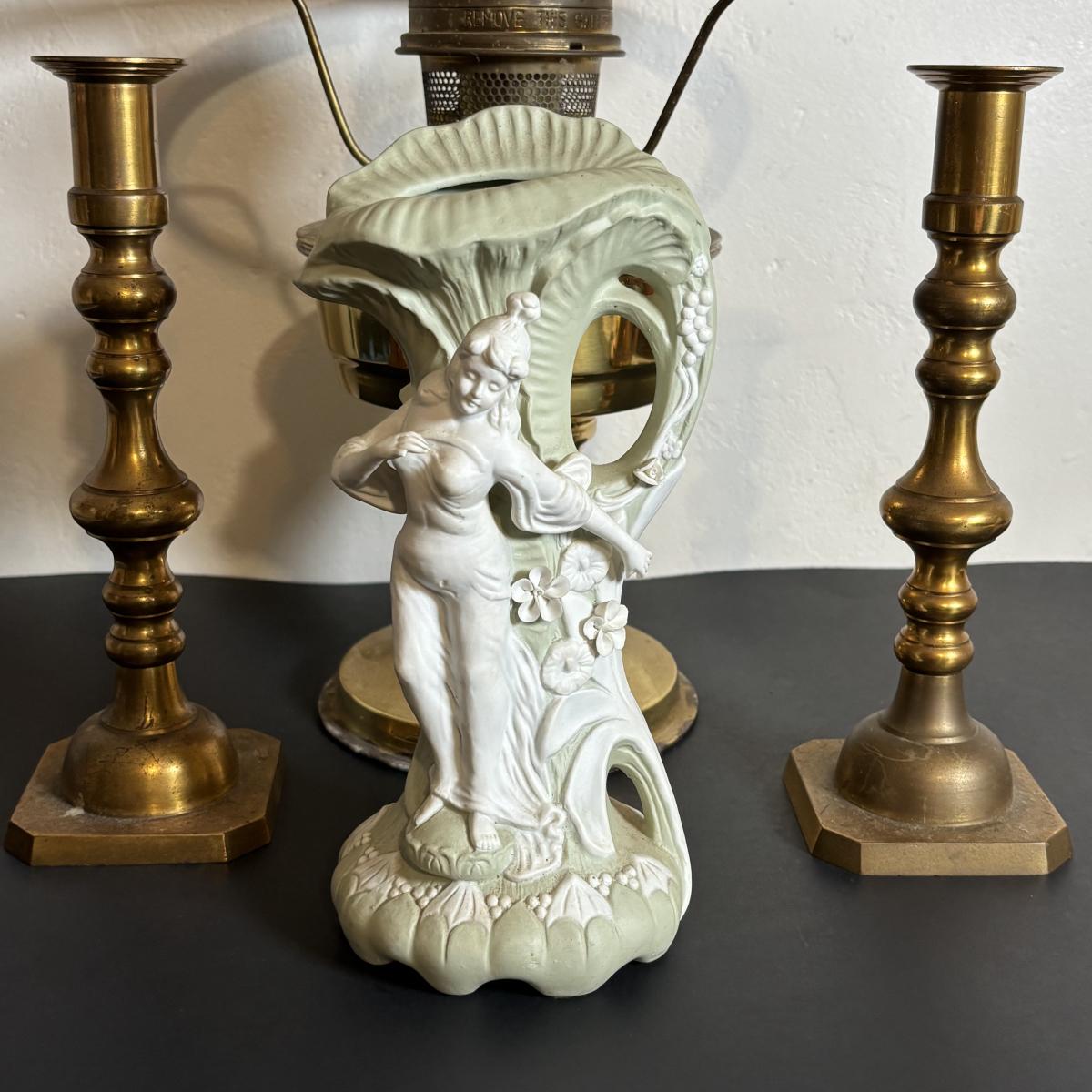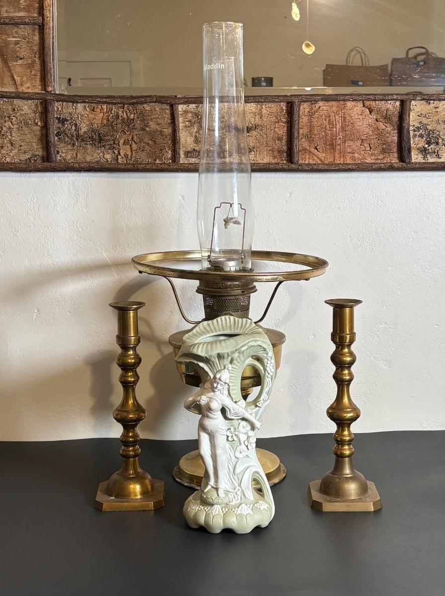 LOT 84: Porcelain Art Nouveau Style Figural Vase, Brass Candle Sticks & Aladdin Oil Brass Oil Lamp (missing shade)