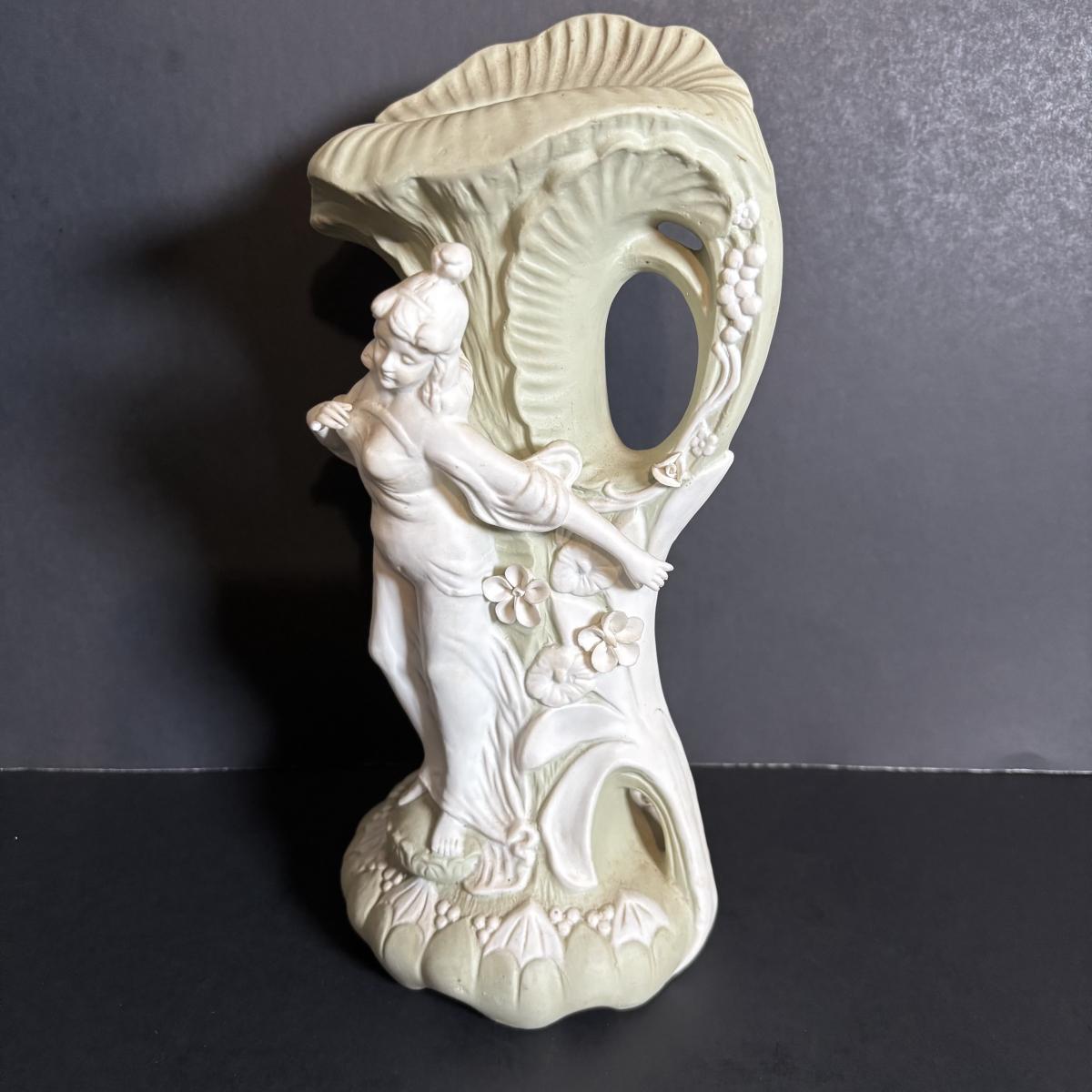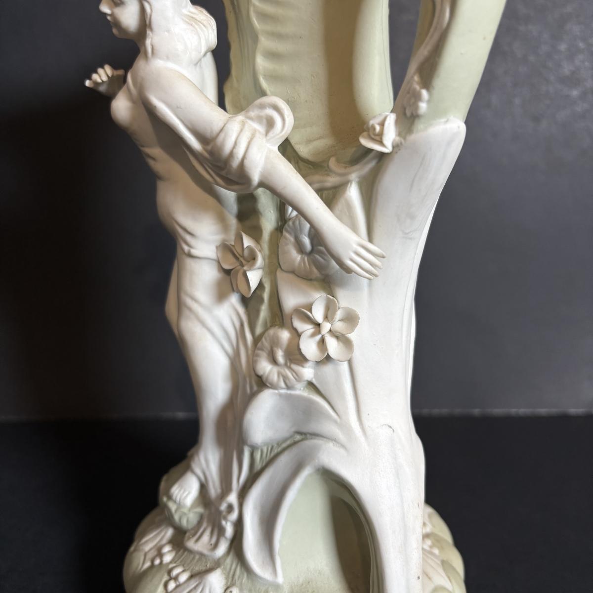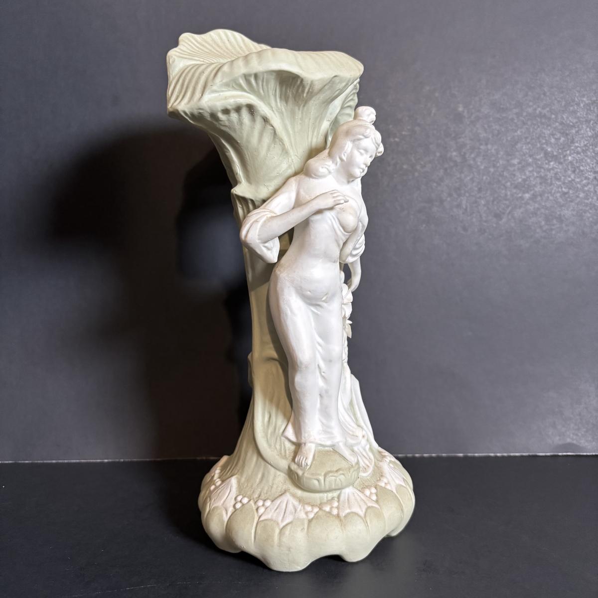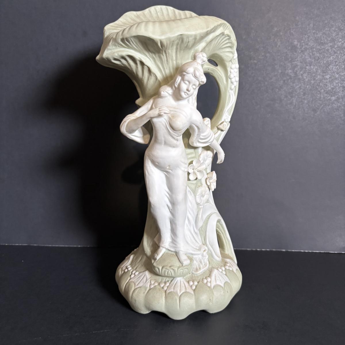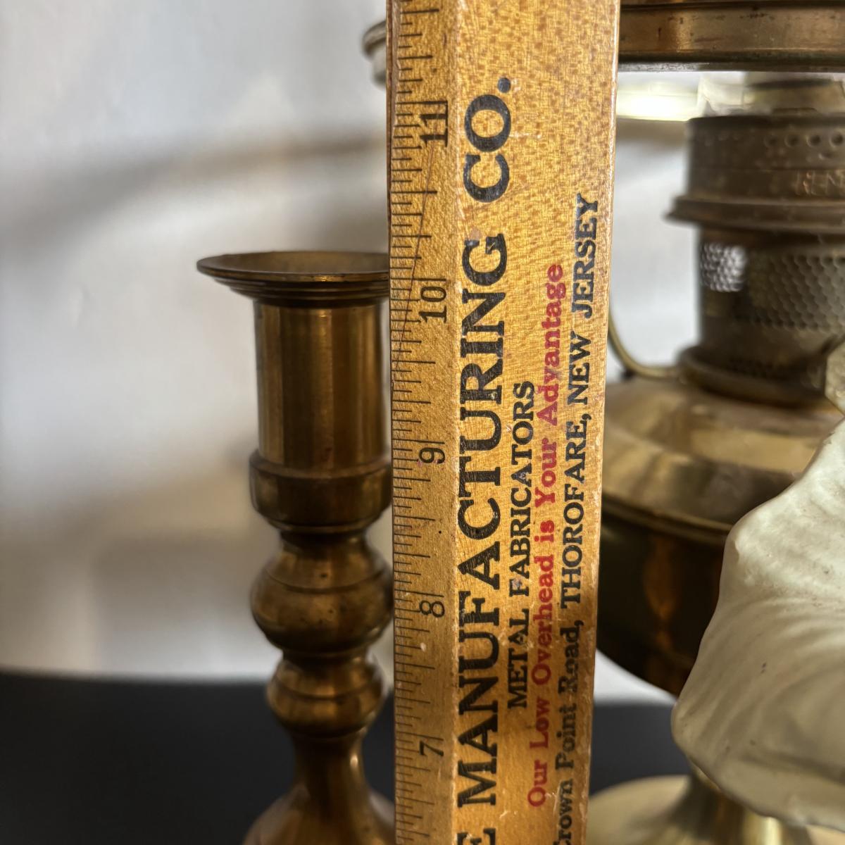 LOT 84: Porcelain Art Nouveau Style Figural Vase, Brass Candle Sticks & Aladdin Oil Brass Oil Lamp (missing shade)