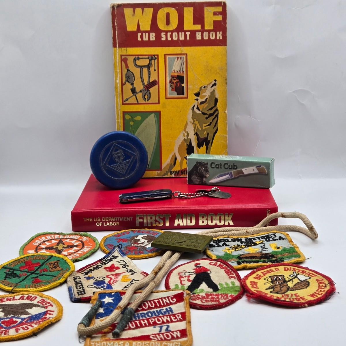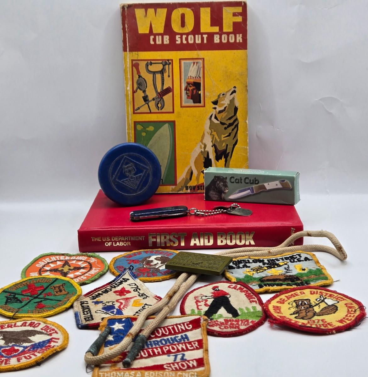 LOT 111: Cub Scout Book, First Aid Book, Boy Scout Patches, GI Joe Pocket Knife, Collapsible Cup, and More