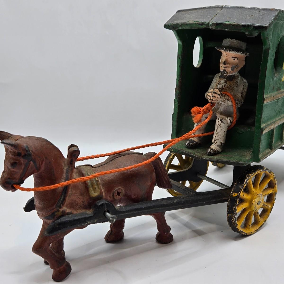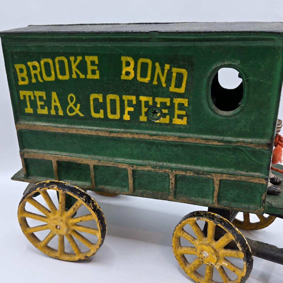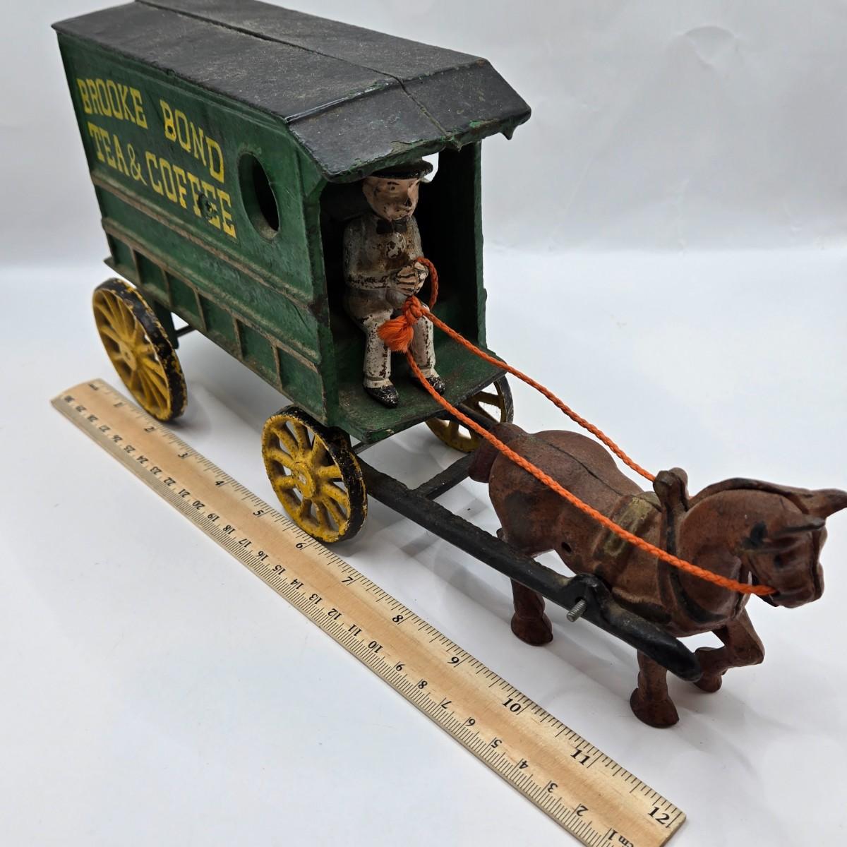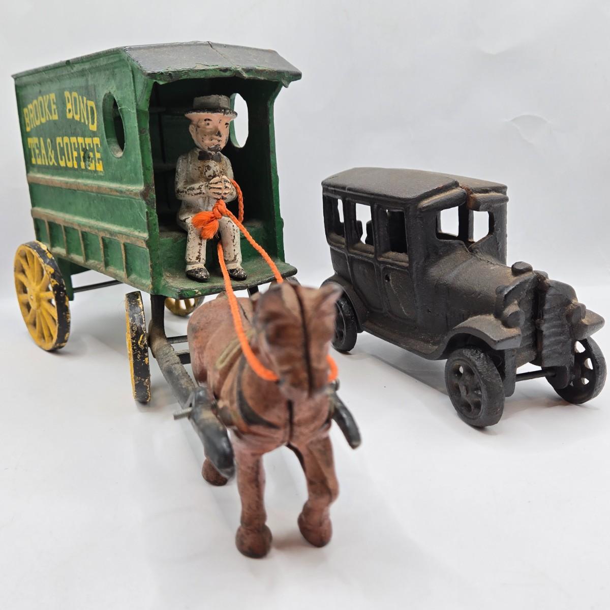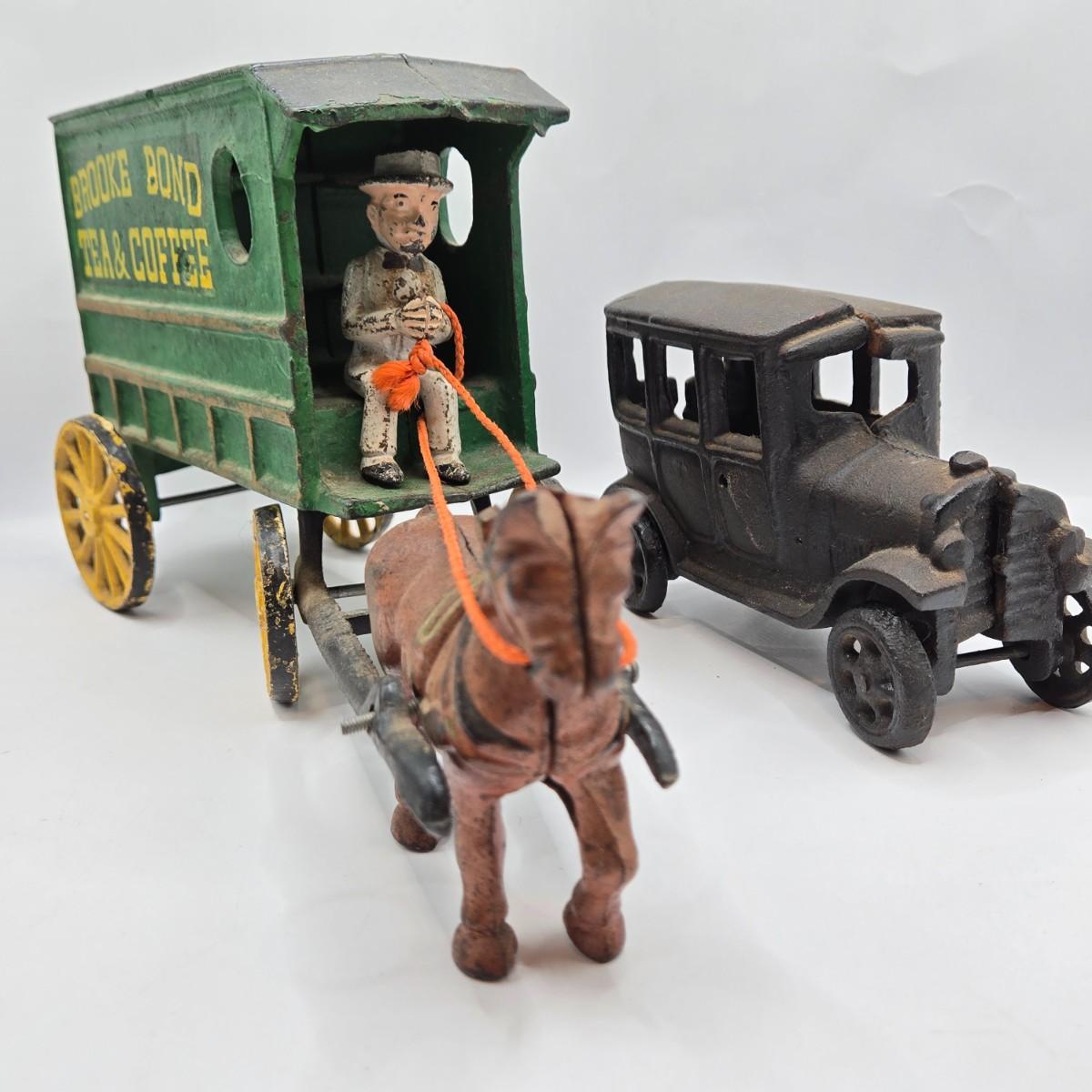 LOT 115: Vintage Cast Iron Brooke Bond Horse Drawn Wagon and Model T