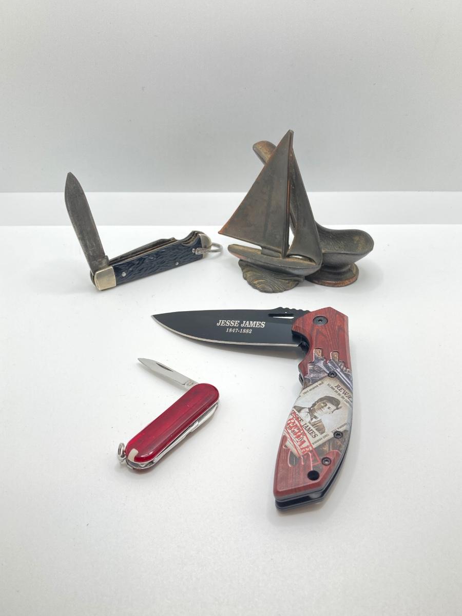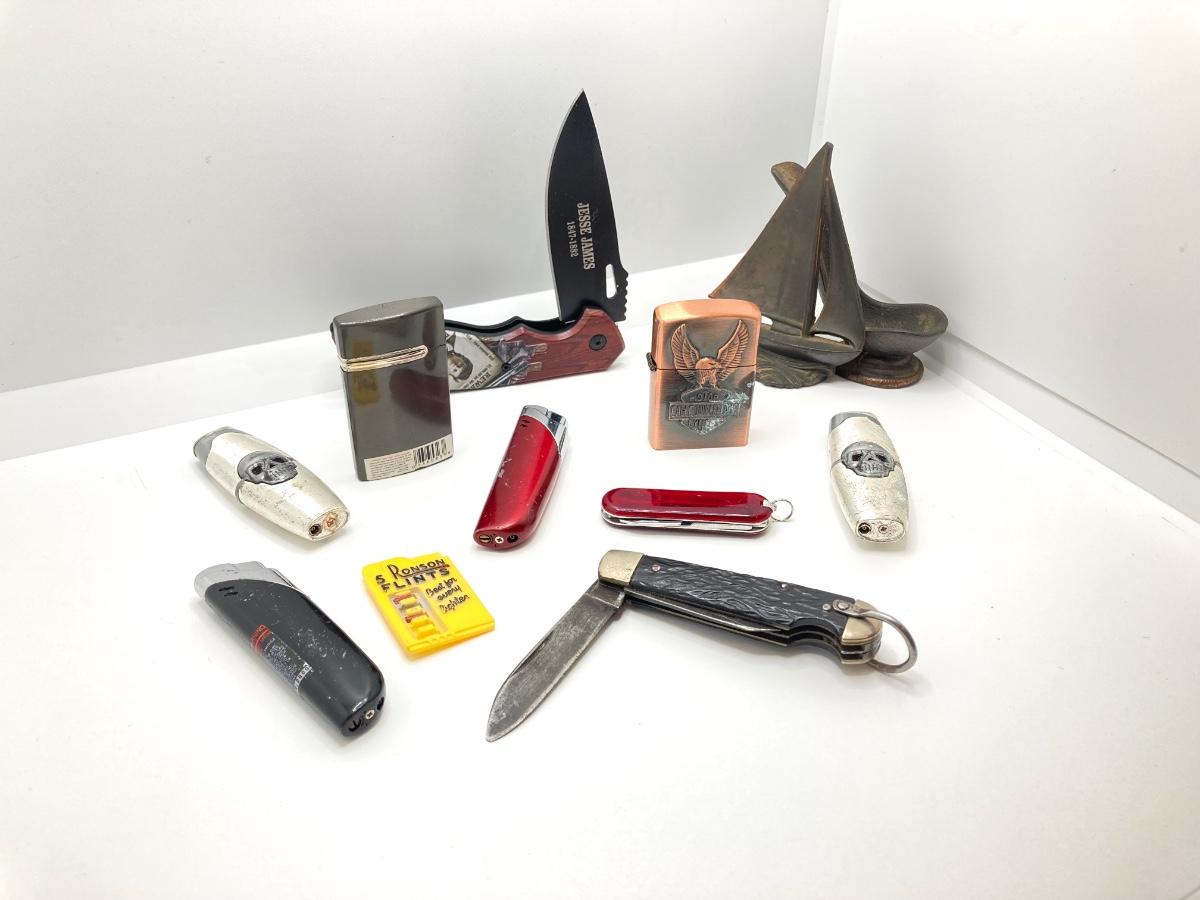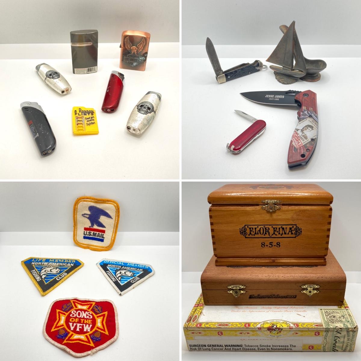LOT 120: Vintage Collection - Folding Knives, Lighters, Cigar Boxes and Patches