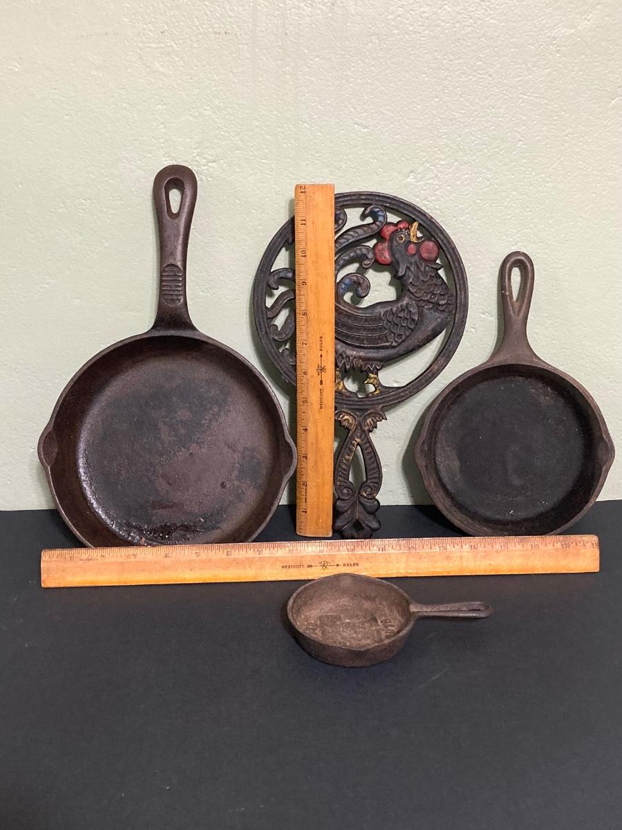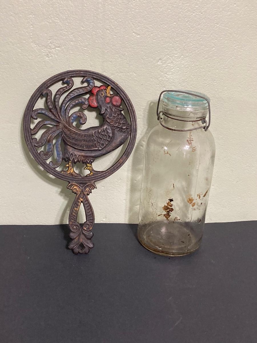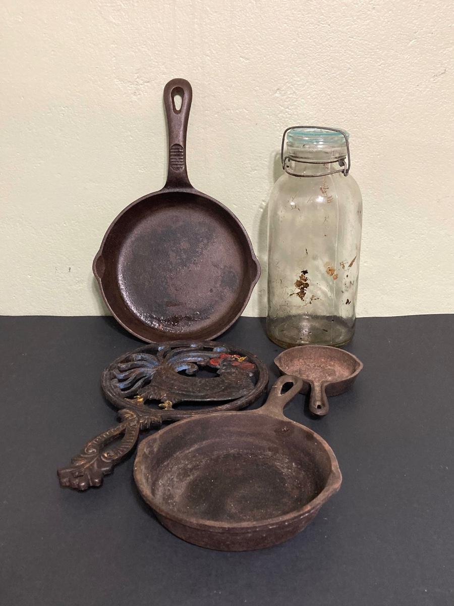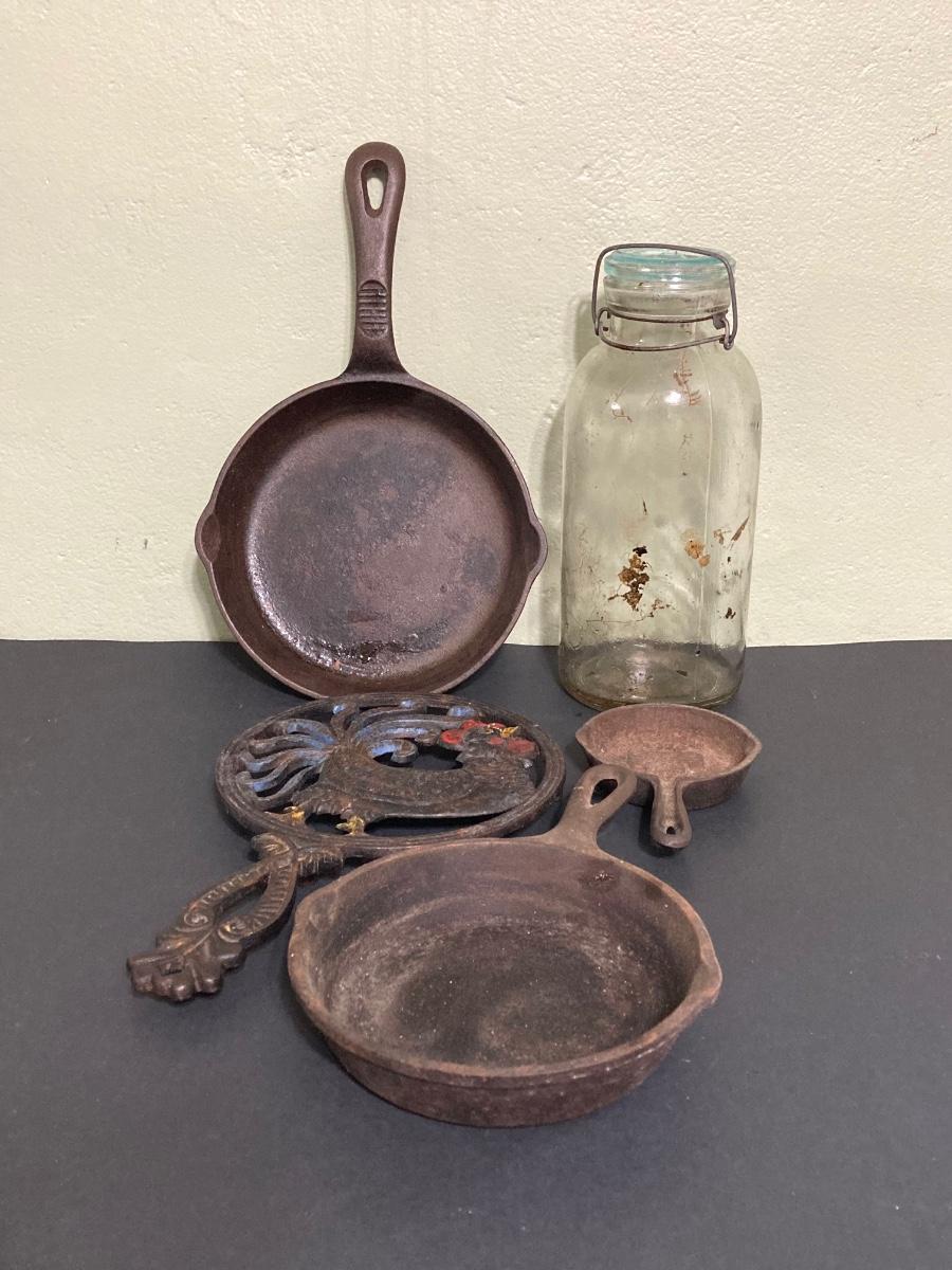 LOT 130: Vintage Cast Iron Cookware (Lodge, Benjamin Medwin and More) / Trivet and Tall Glass Mason Jar