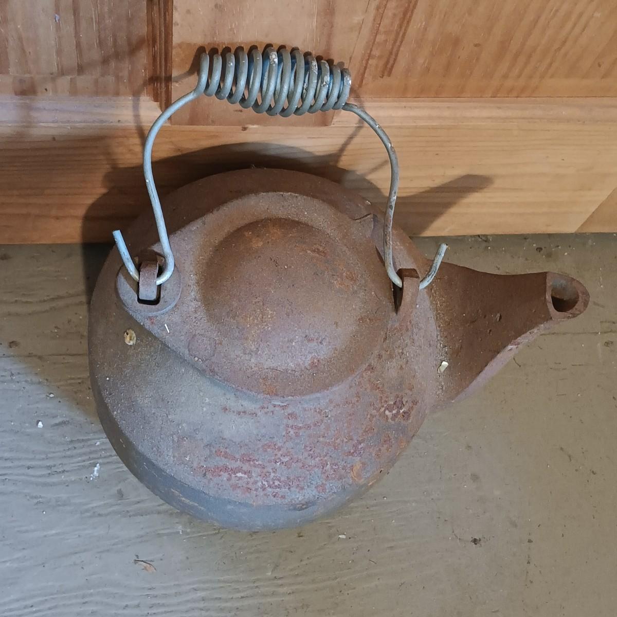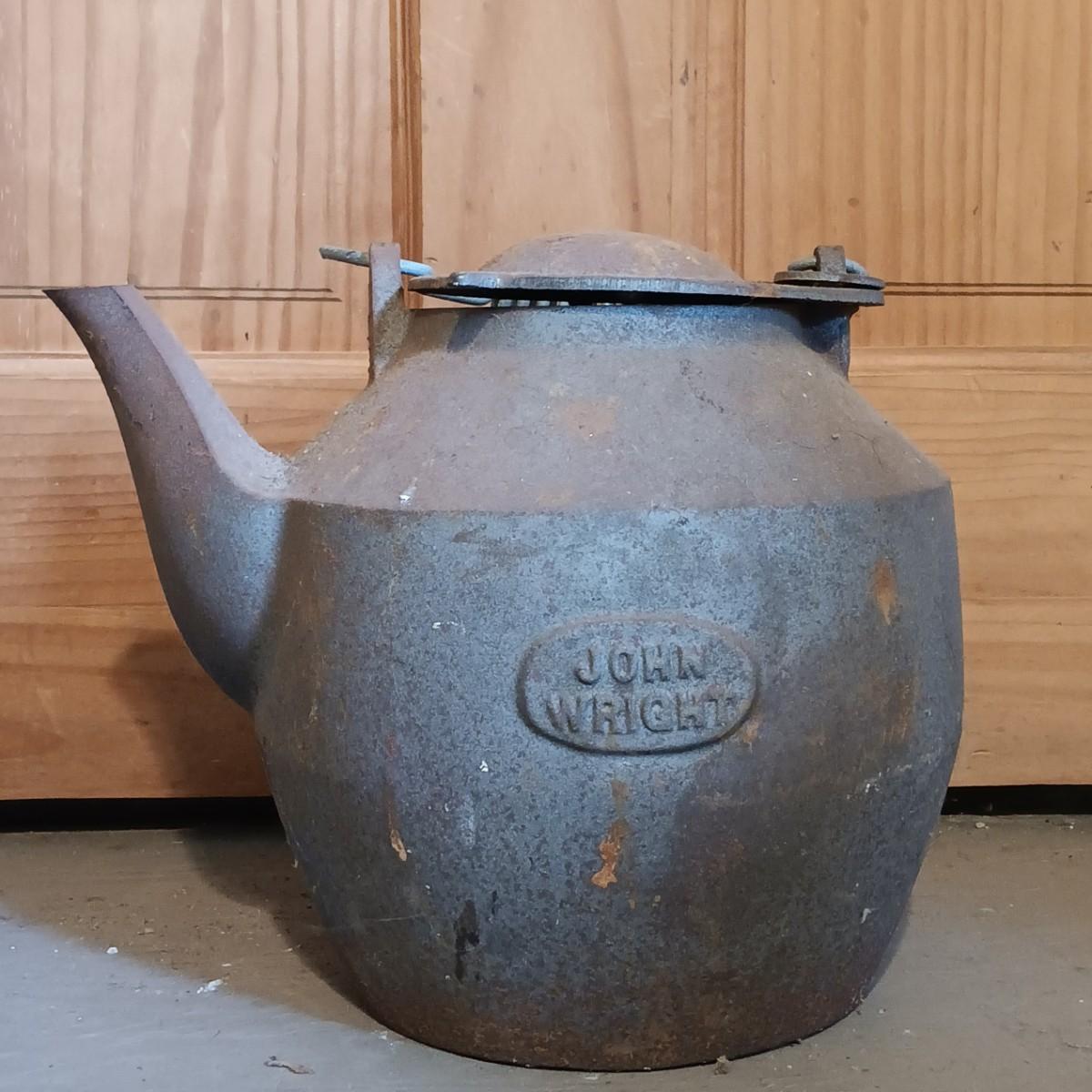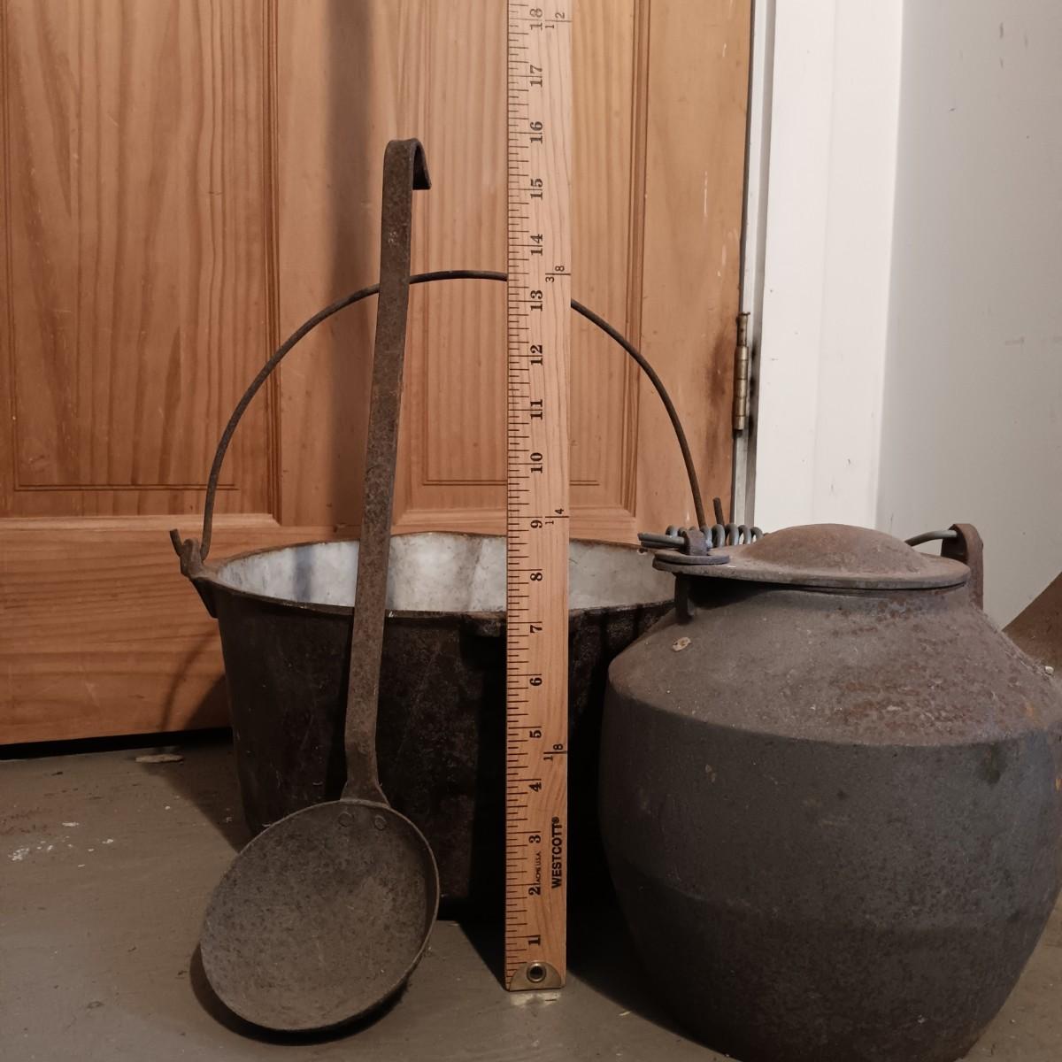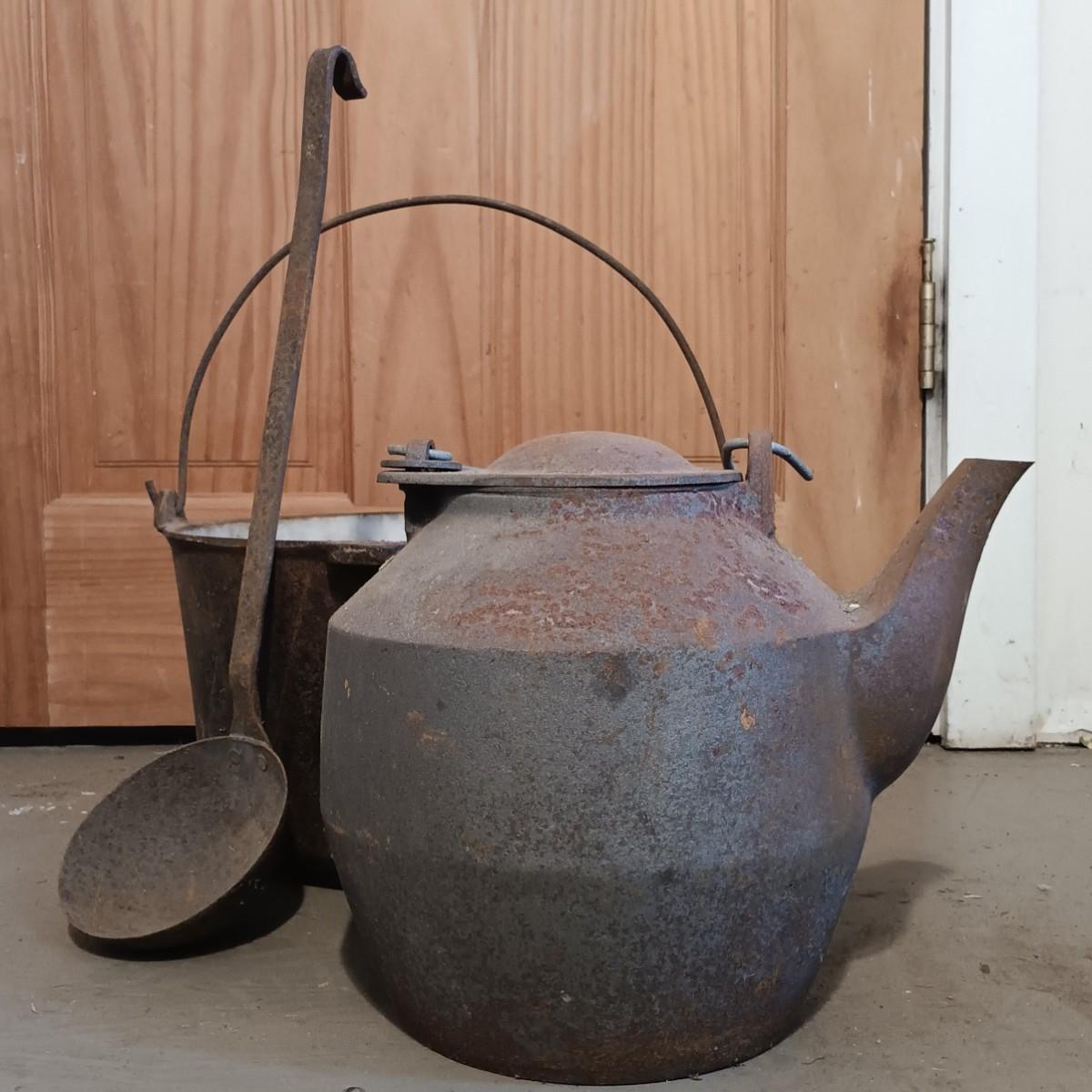 LOT 144: Vintage Cast Iron John Wright Tea Kettle, Cooking Pot & Ladle