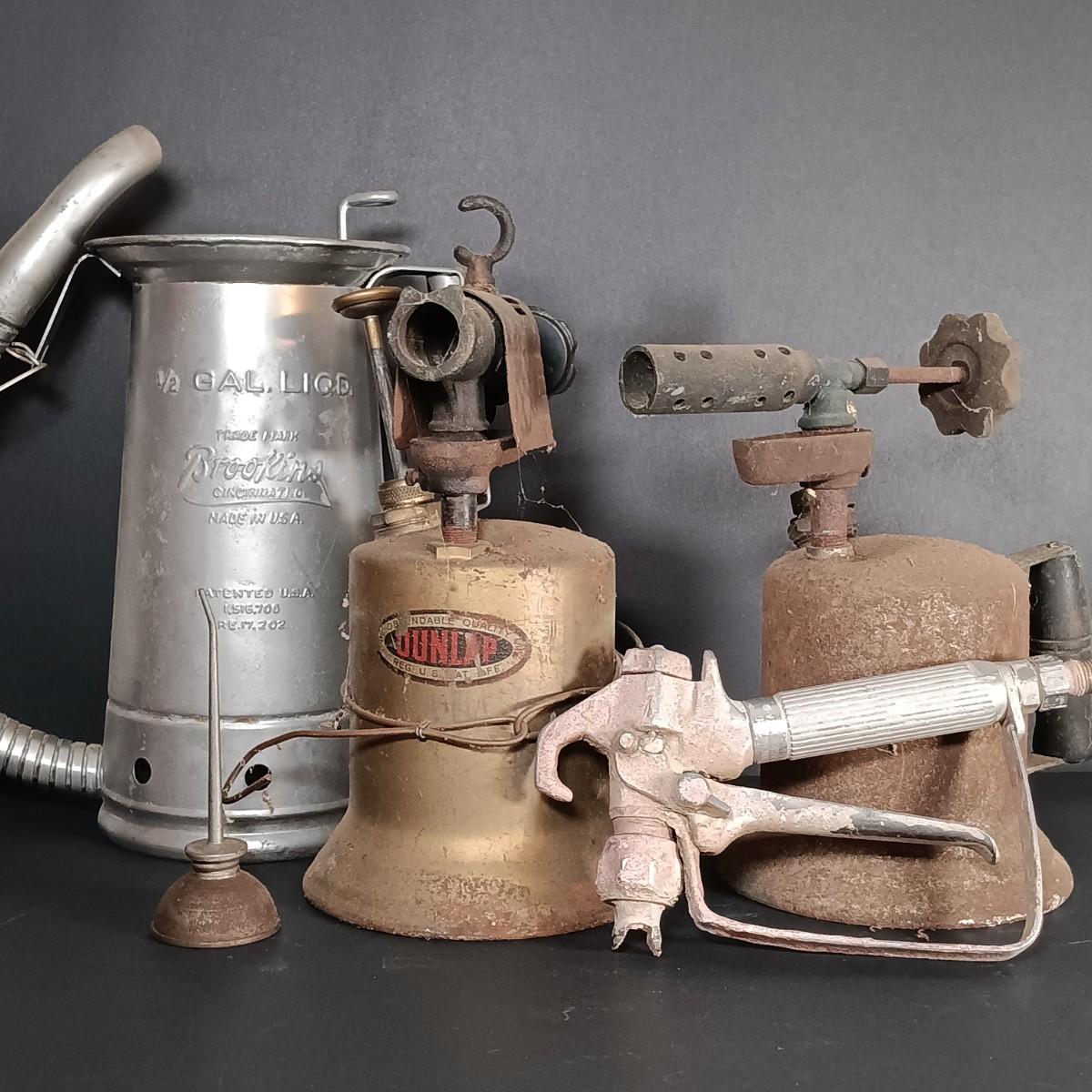 LOT 156: Brookins 1/2 Gallon Oil Can, (2) Brass and Steel Handheld Torches, Paint Spray Gun & Mini Oil Can
