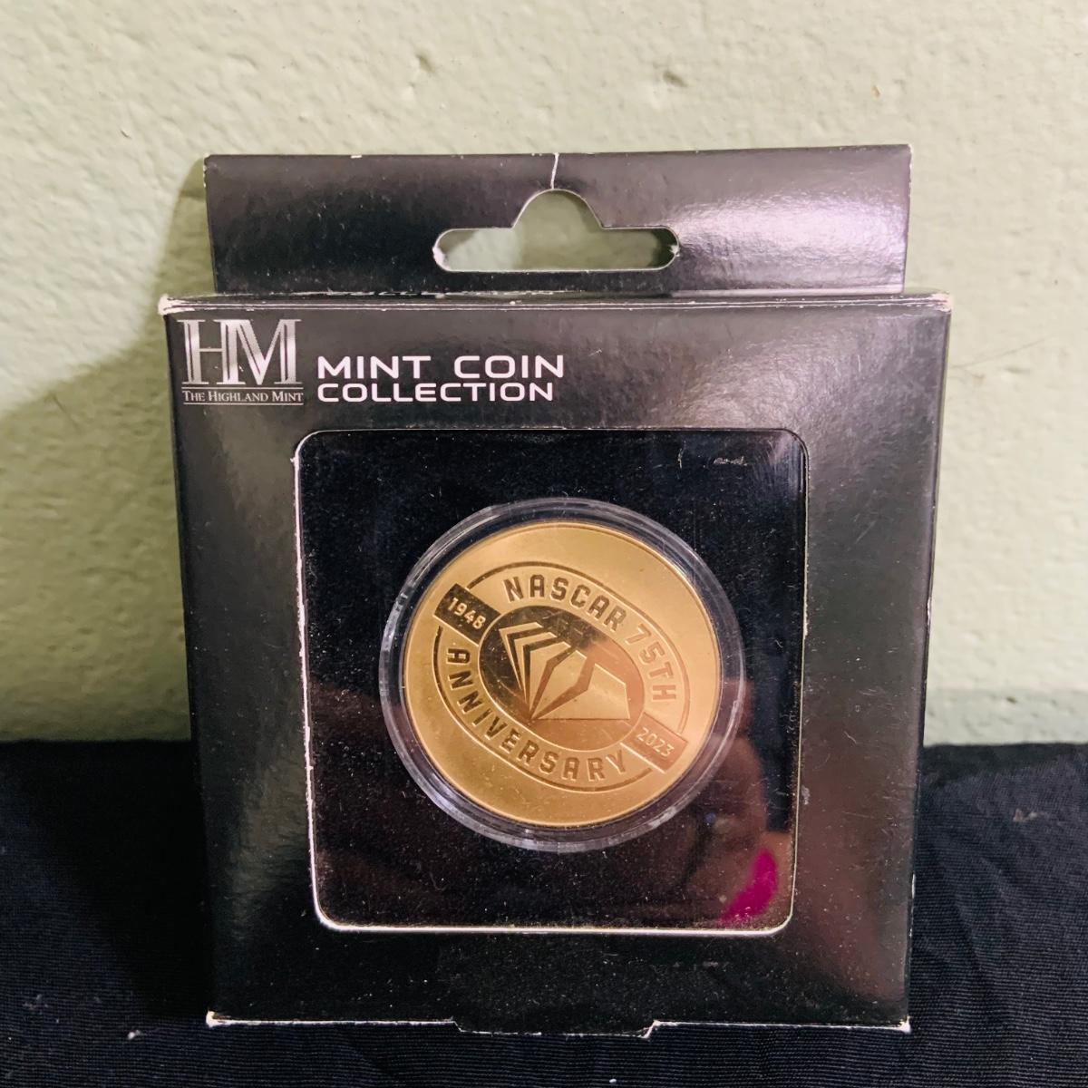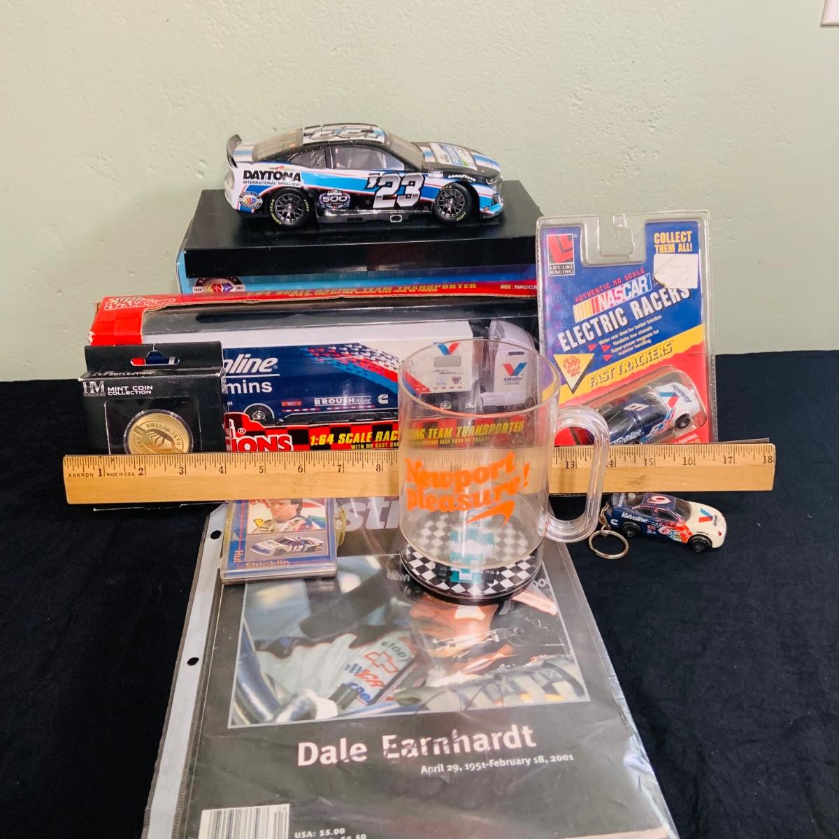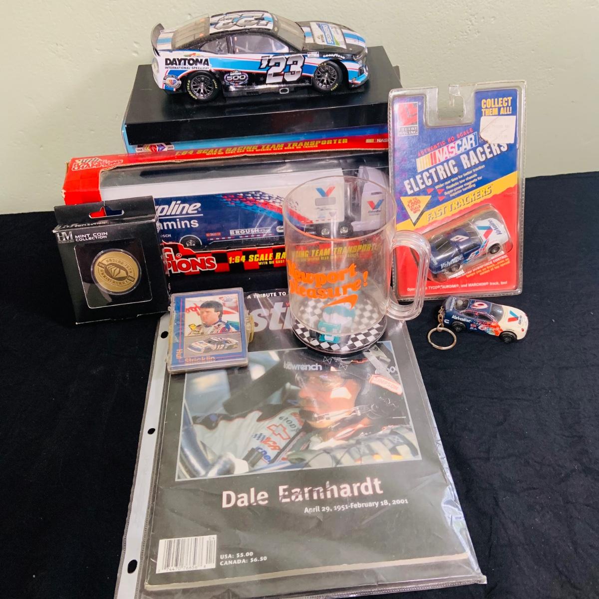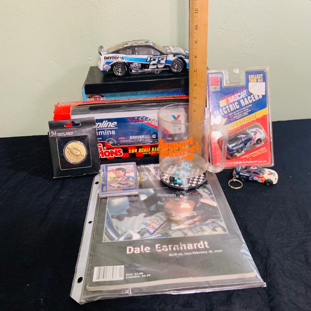 LOT 191: NASCAR Collection Including Lionel Racing Die Cast Car, Racing Champions Truck, NASCAR 75th Anniversary Coin, Earnhardt Singed Magazine and More