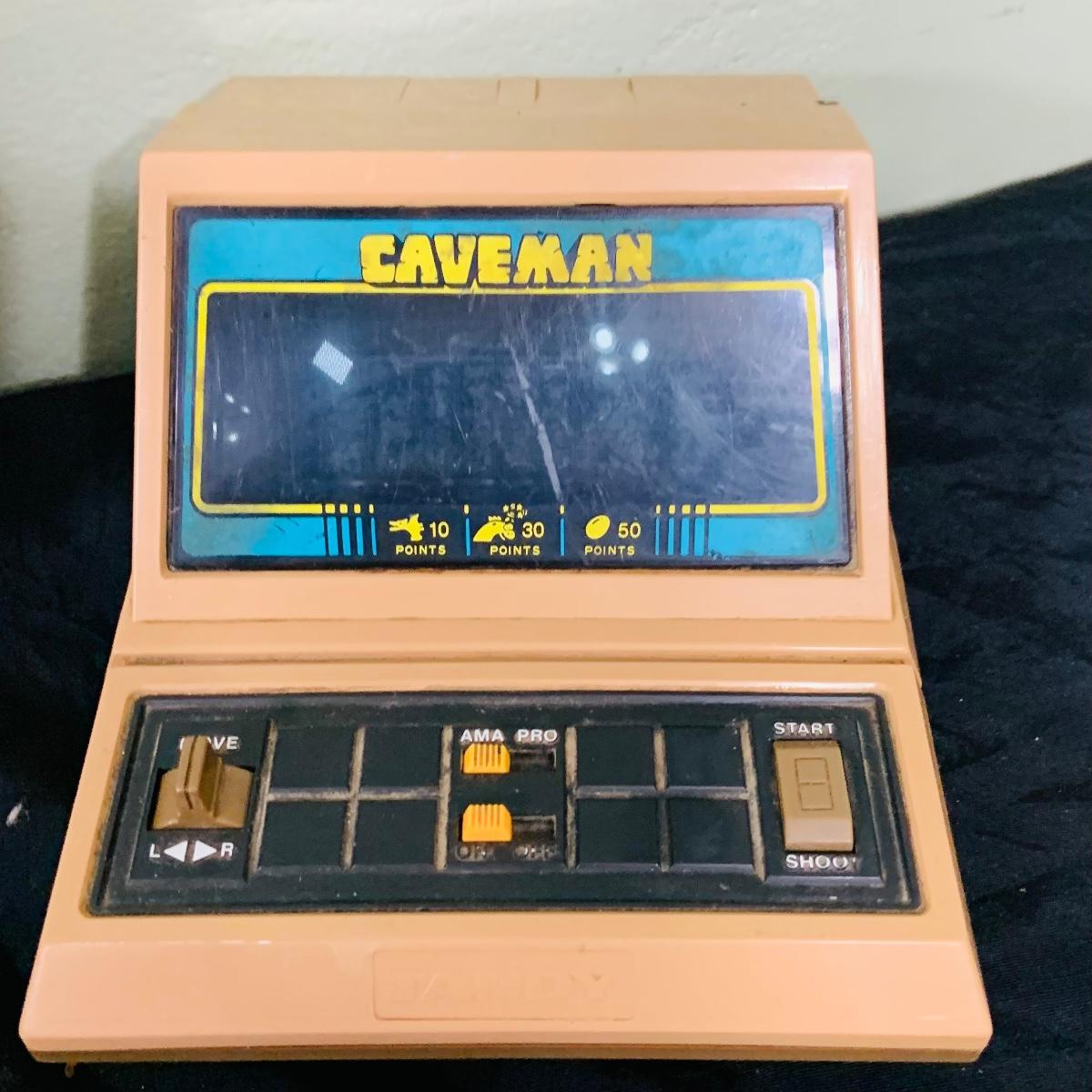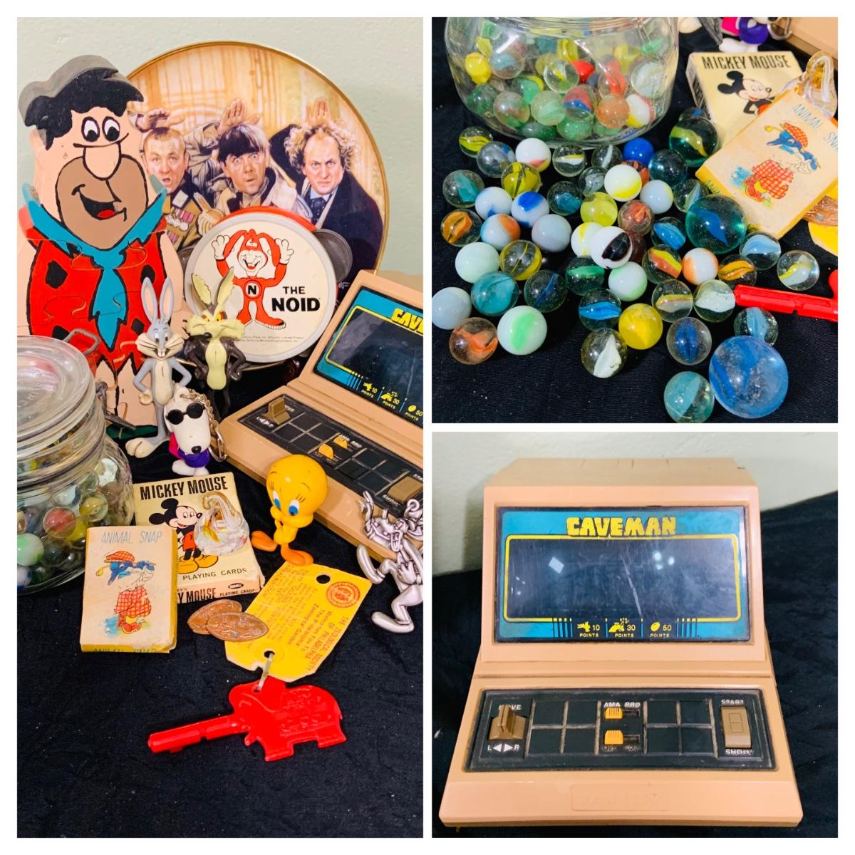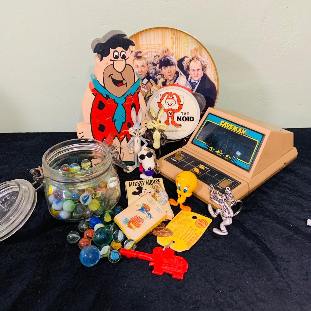 LO 207: Collection of Vintage Toys, Game and Marbles Featuring Tandy Caveman Electronic Table Top Game, Fred Flintstone Wooden Puzzle, and Much More