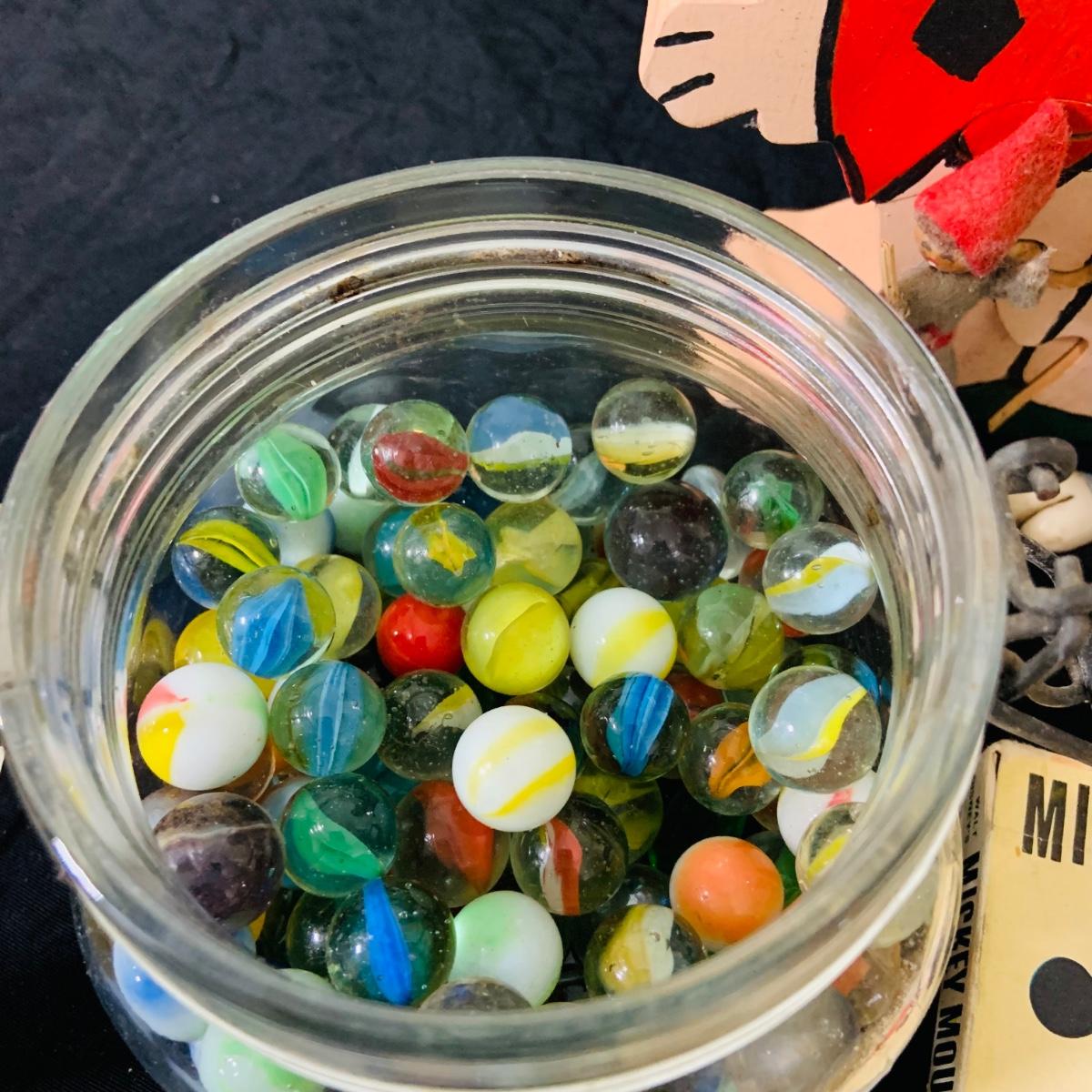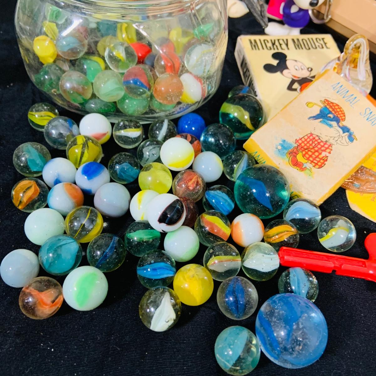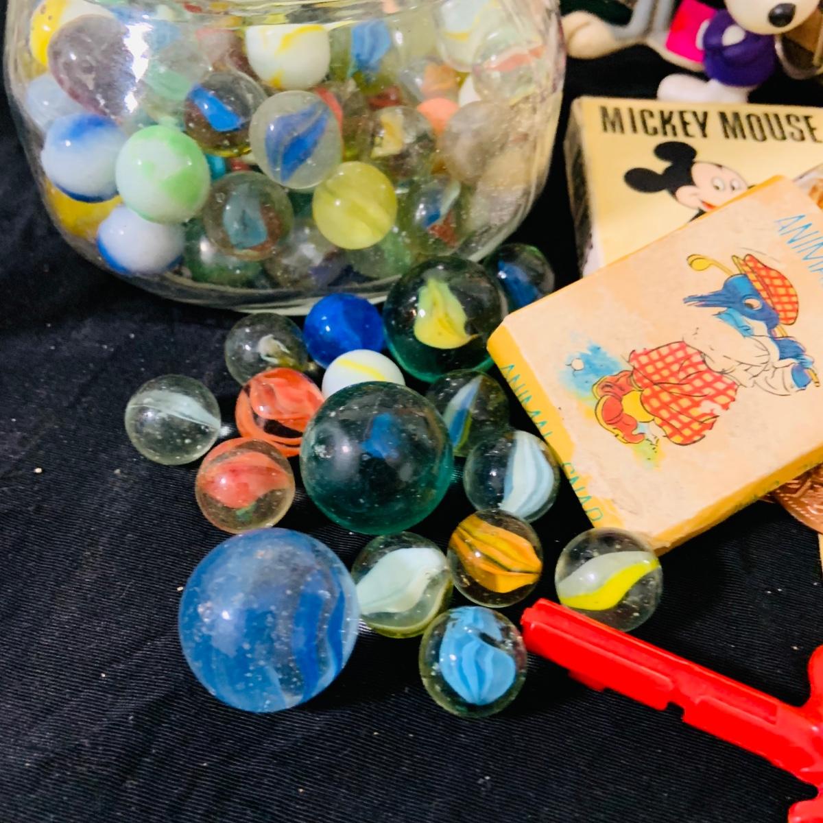 LO 207: Collection of Vintage Toys, Game and Marbles Featuring Tandy Caveman Electronic Table Top Game, Fred Flintstone Wooden Puzzle, and Much More