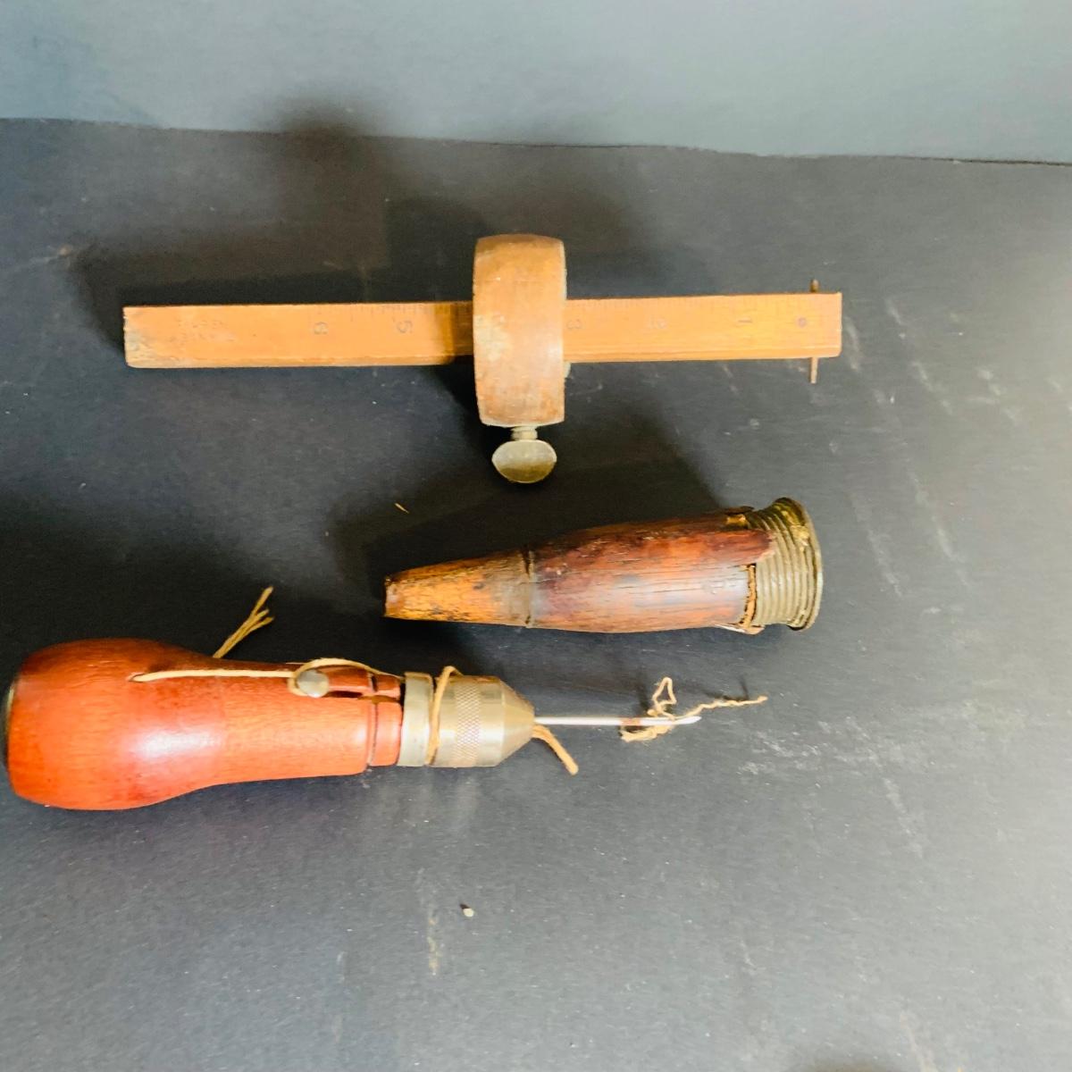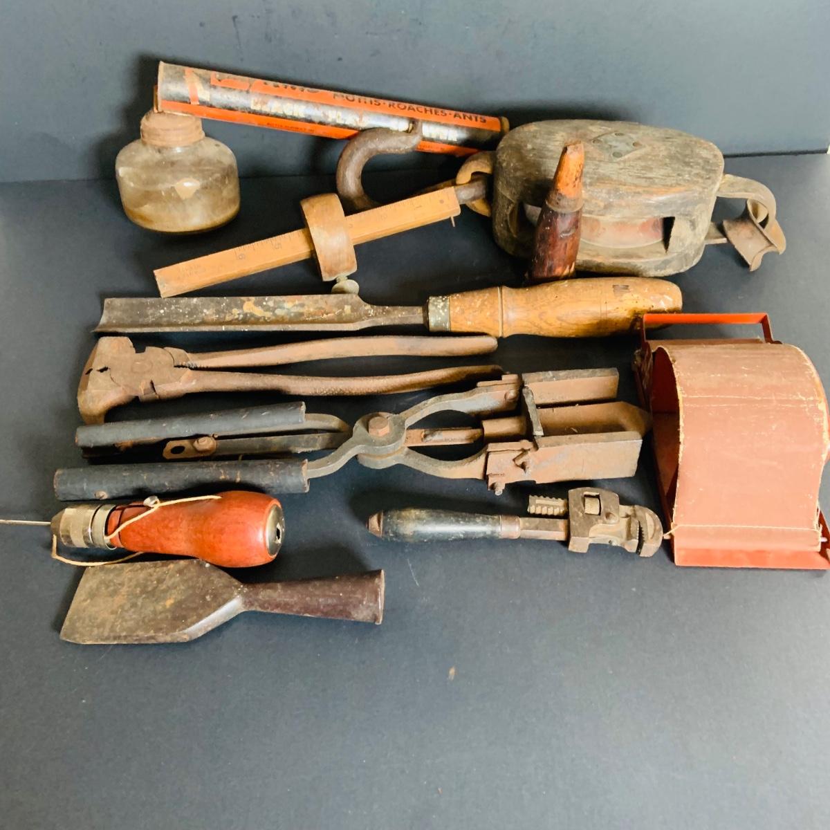 LOT 212: Collection of Vintage/Antique Tools Including a Sprayer, Pulley, Cigarette Roller, Glass Tool and Much More