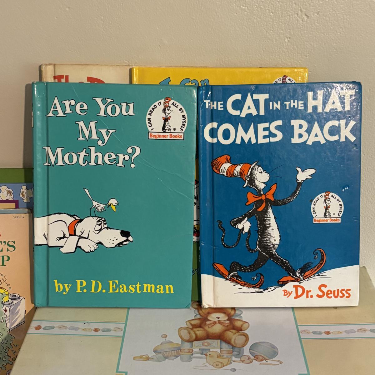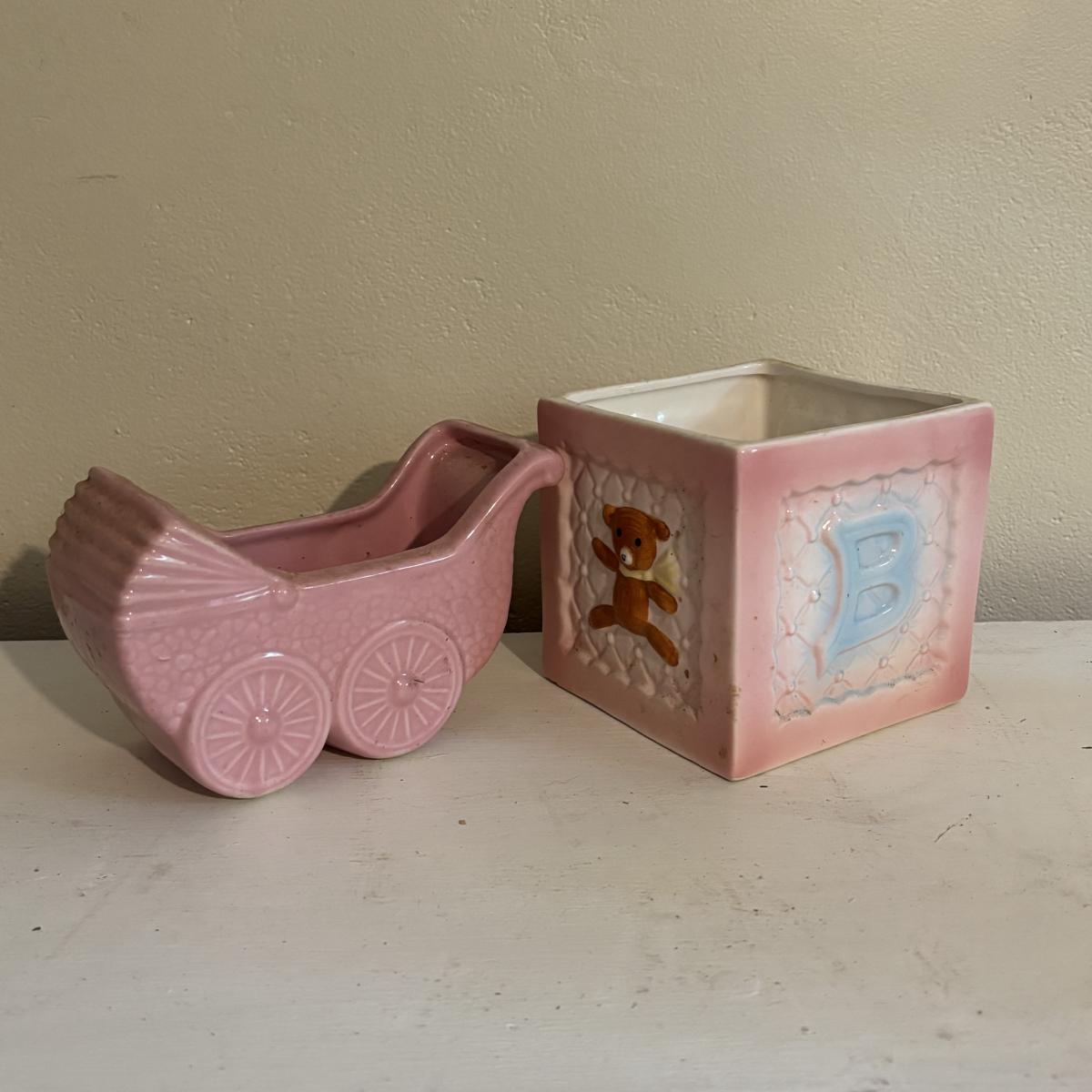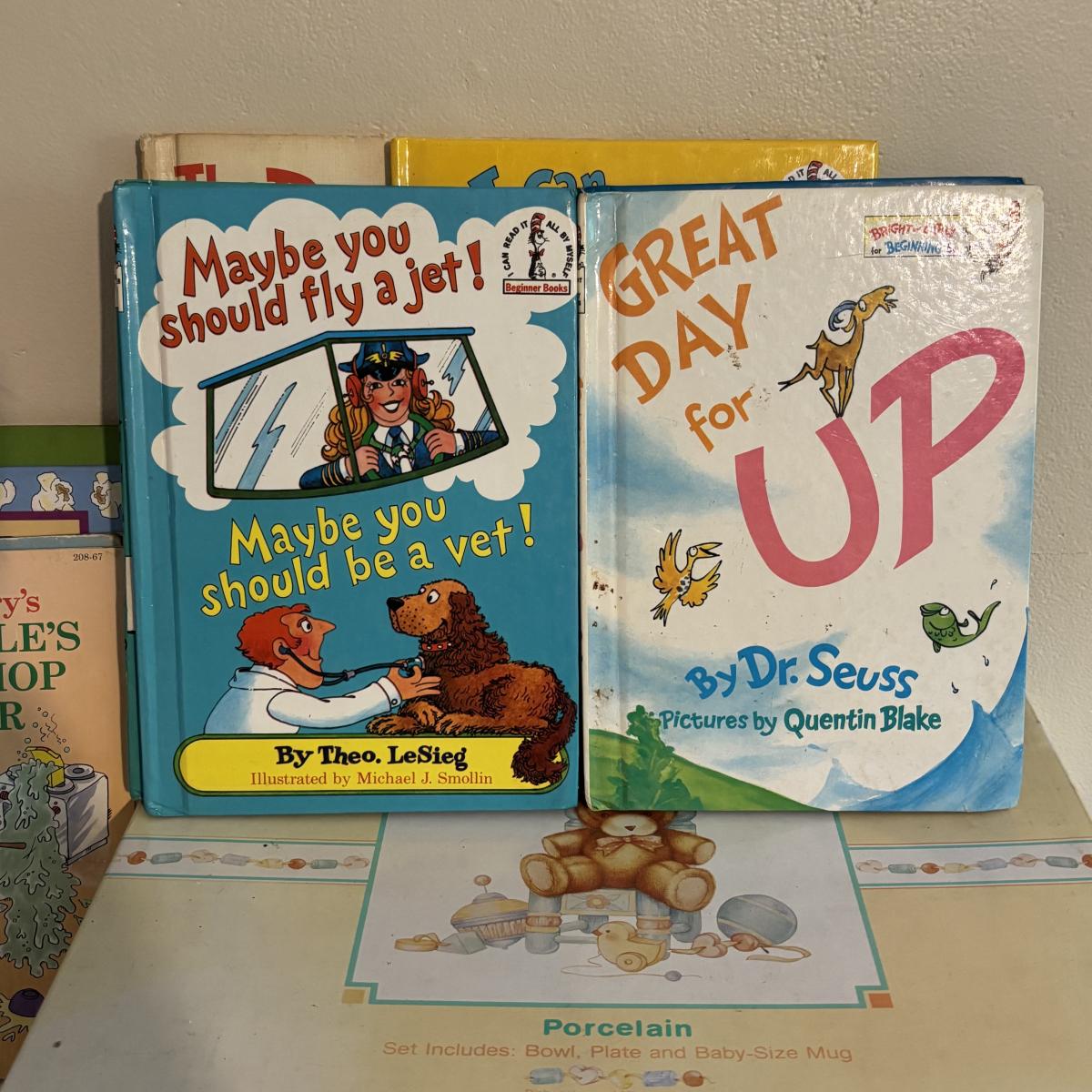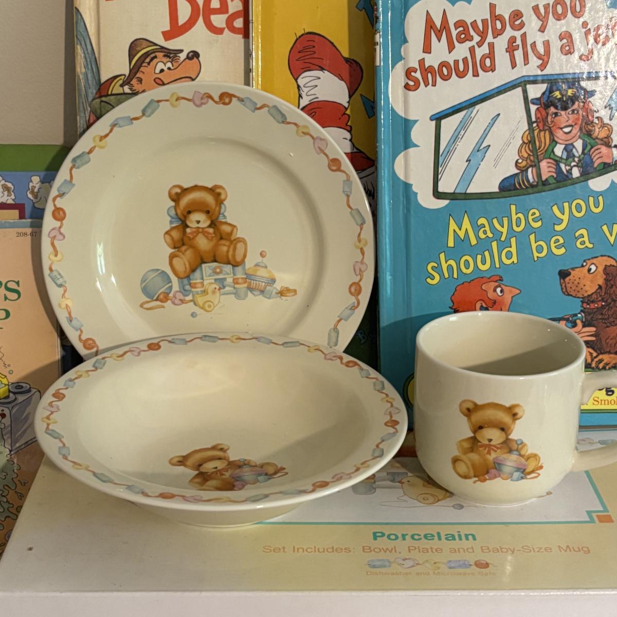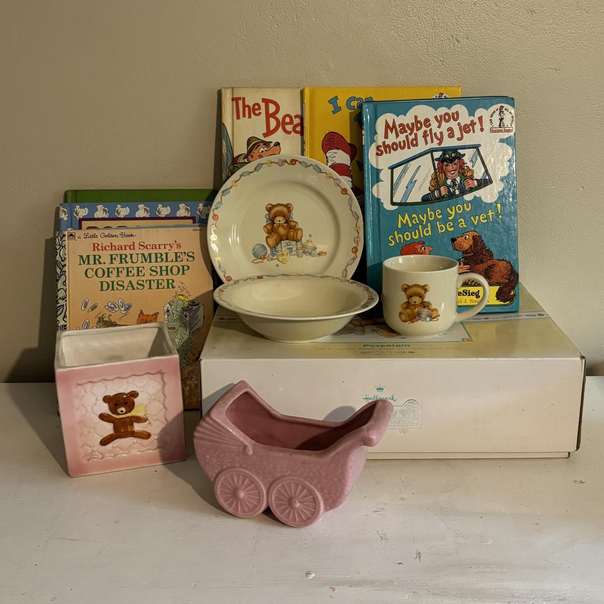 LOT 218: Hallmark Baby's Keepsake Serving Set, Vintage Books including Dr. Suess, Berstein Bears, Little Golden Books & Pink Planters