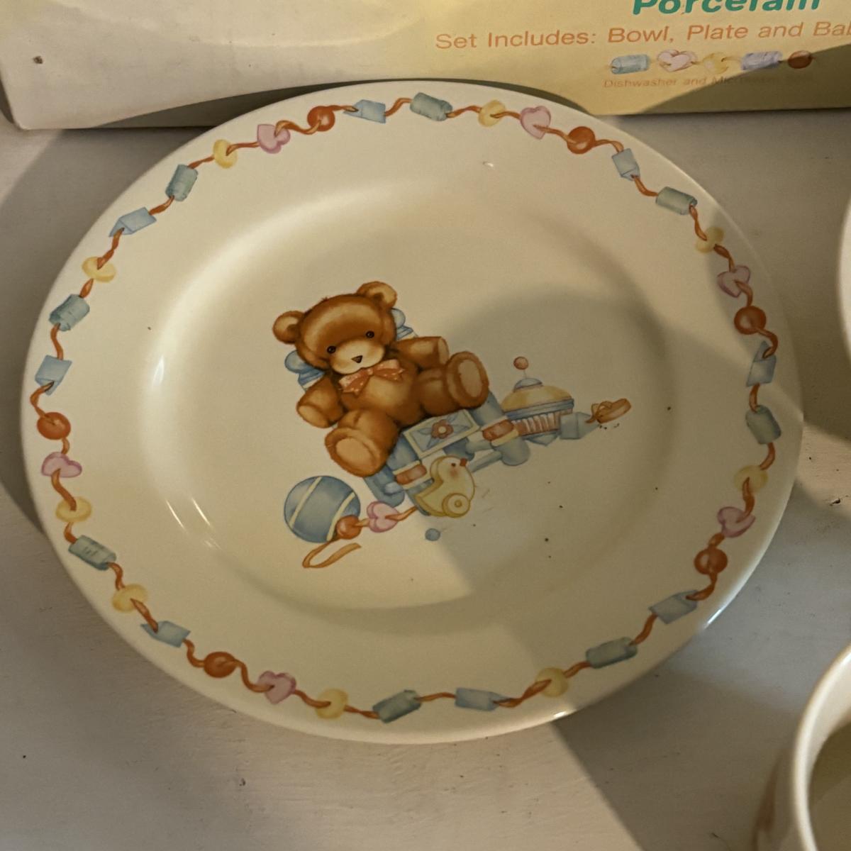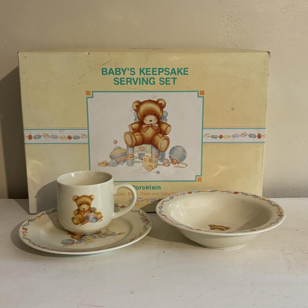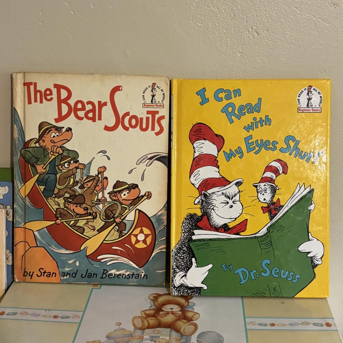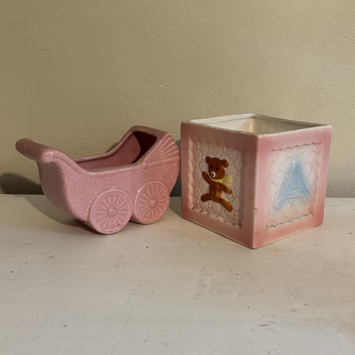 LOT 218: Hallmark Baby's Keepsake Serving Set, Vintage Books including Dr. Suess, Berstein Bears, Little Golden Books & Pink Planters