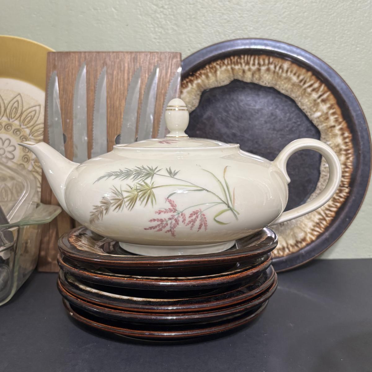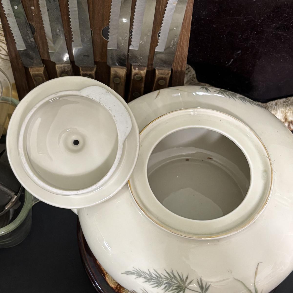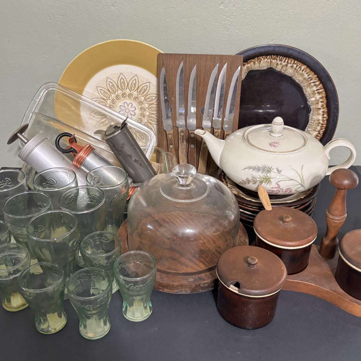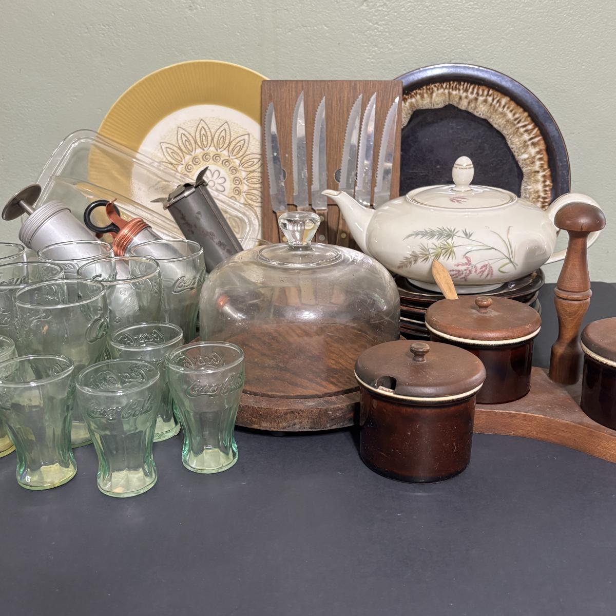 LOT 221: Kitchen Collection: New Coca-Cola Juice Glasses, Vintage Cookie Press/Cake Decorator, Pottery Condiment Set, Steak Knives w/Magnetic Steak, Barvaria Germany Teapot & More