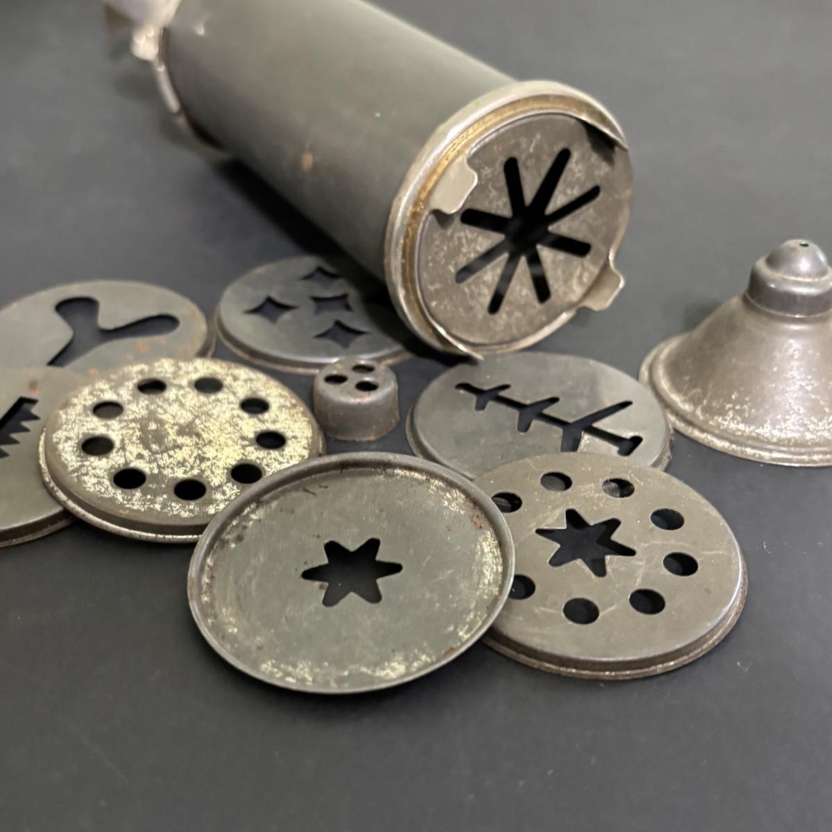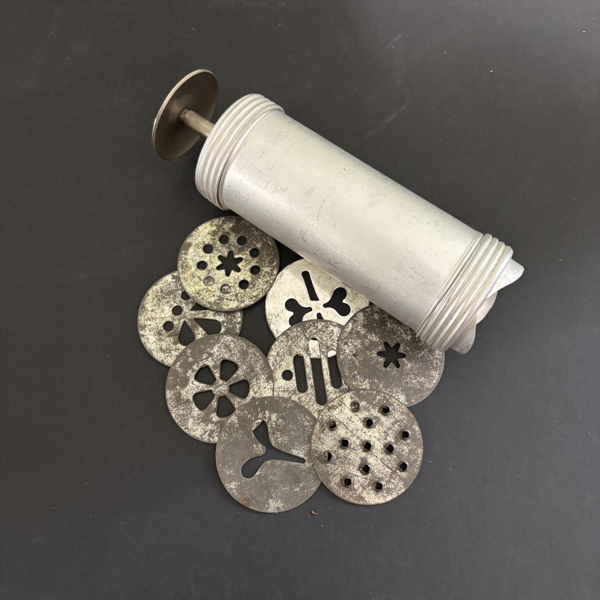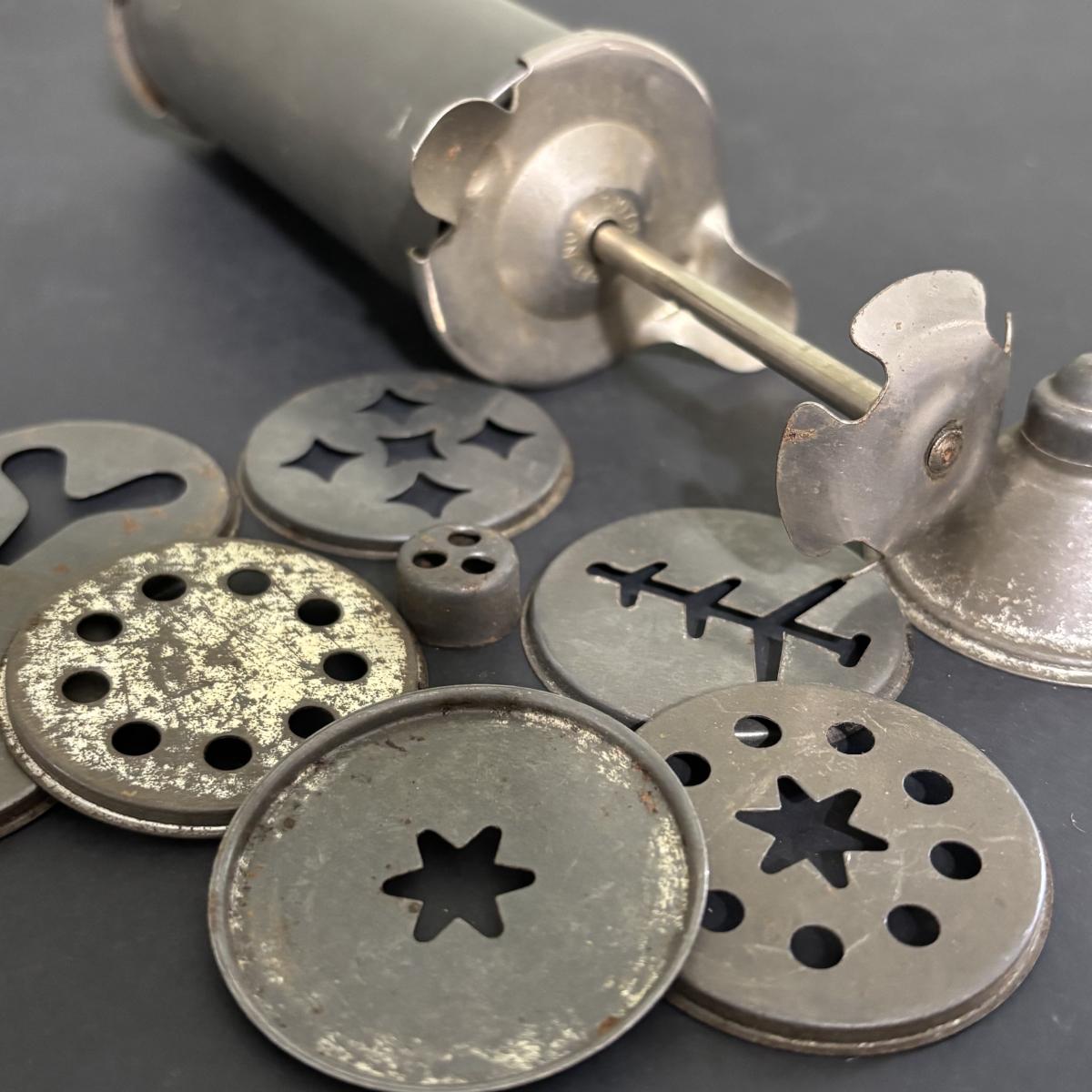 LOT 221: Kitchen Collection: New Coca-Cola Juice Glasses, Vintage Cookie Press/Cake Decorator, Pottery Condiment Set, Steak Knives w/Magnetic Steak, Barvaria Germany Teapot & More