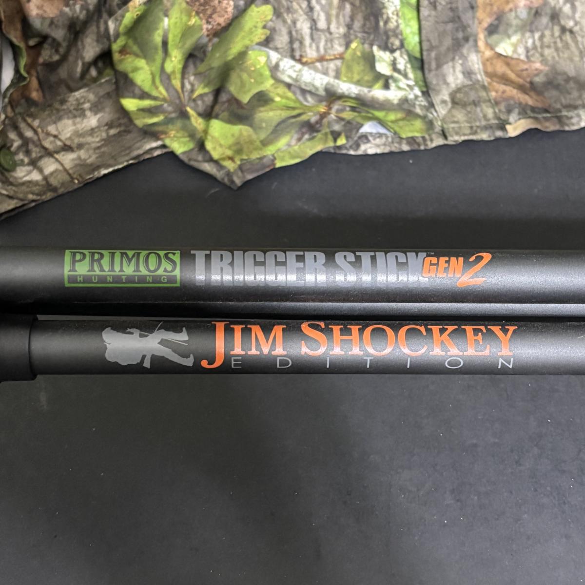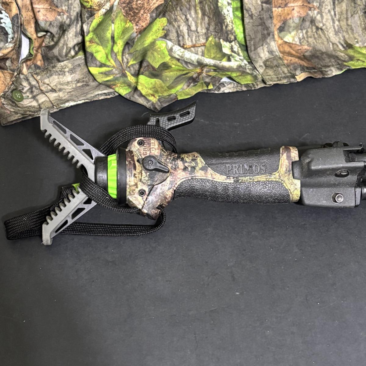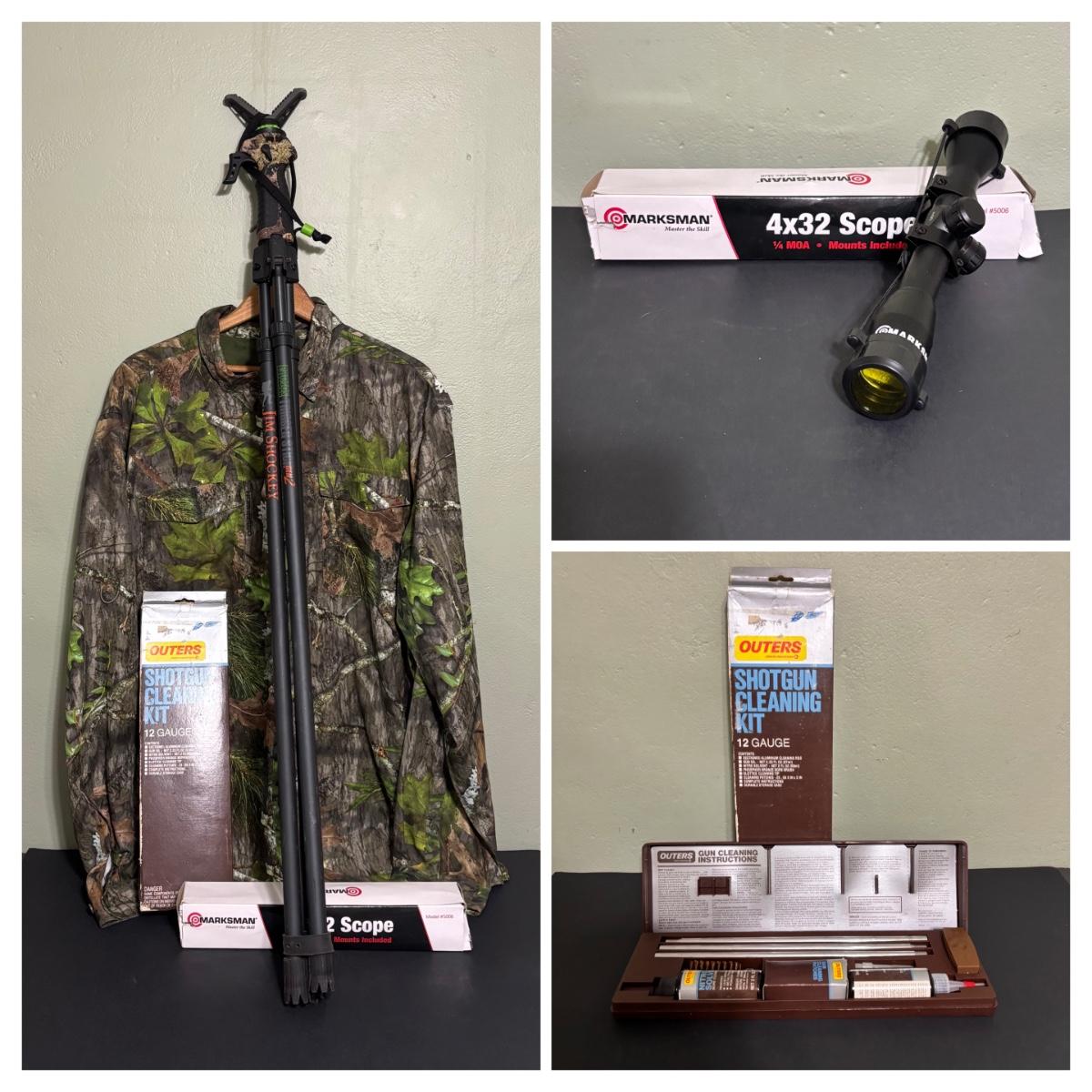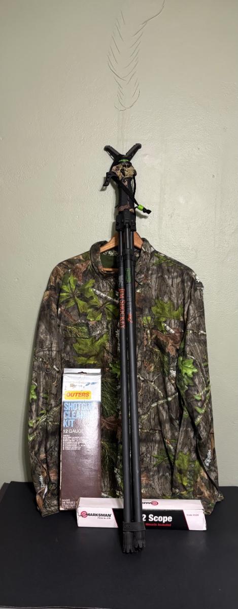 LOT 222: Mossy Oak (XL) Camo Shirt, Outers Shotgun Cleaning Kit, Marksman 4x32 Scope & Primos Trigger Stick Gen2 Jim Shockey Edition