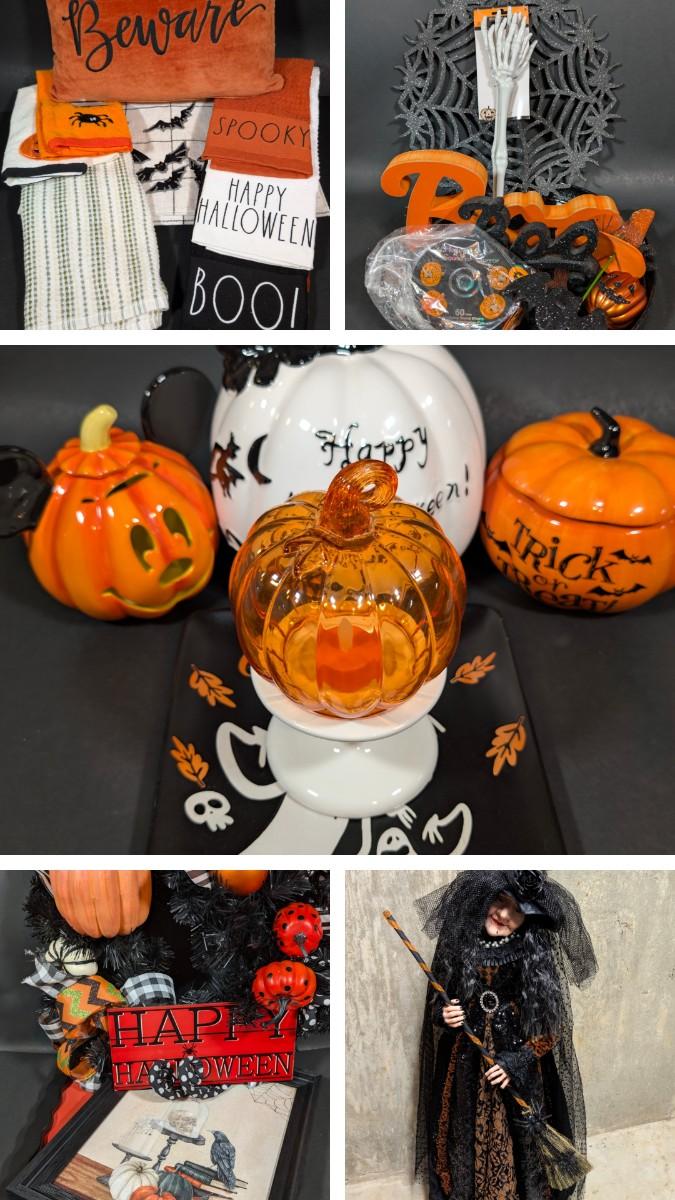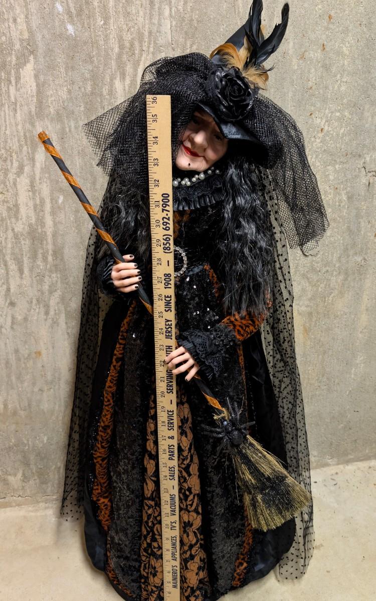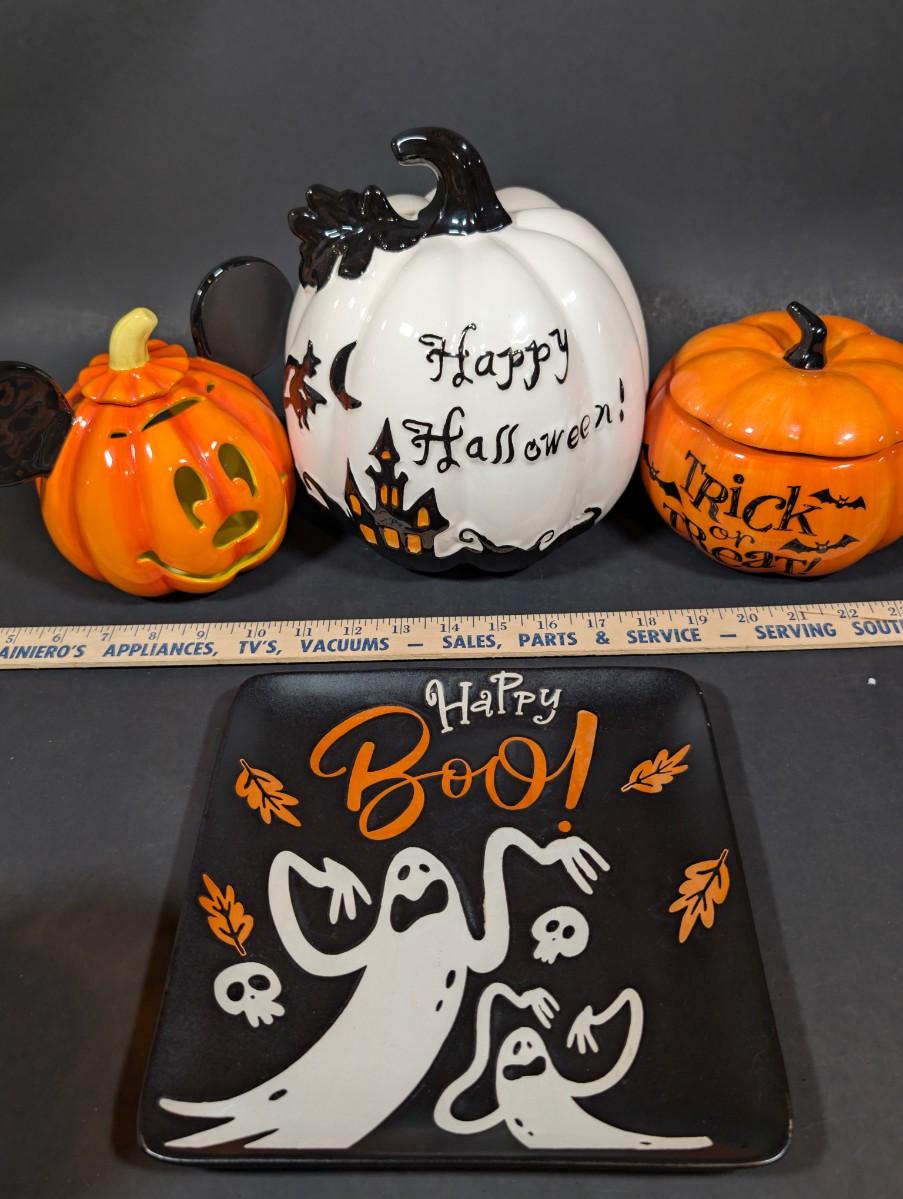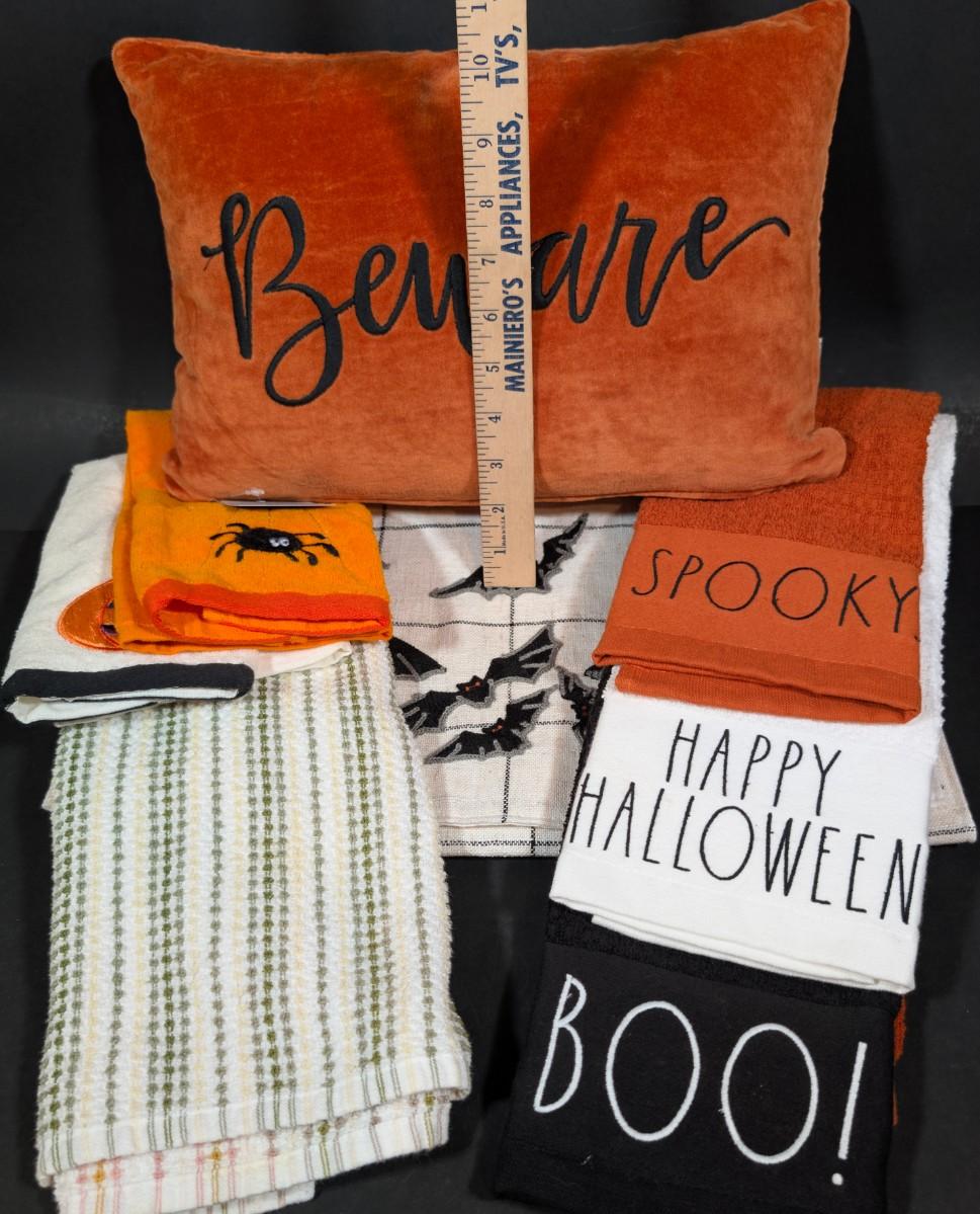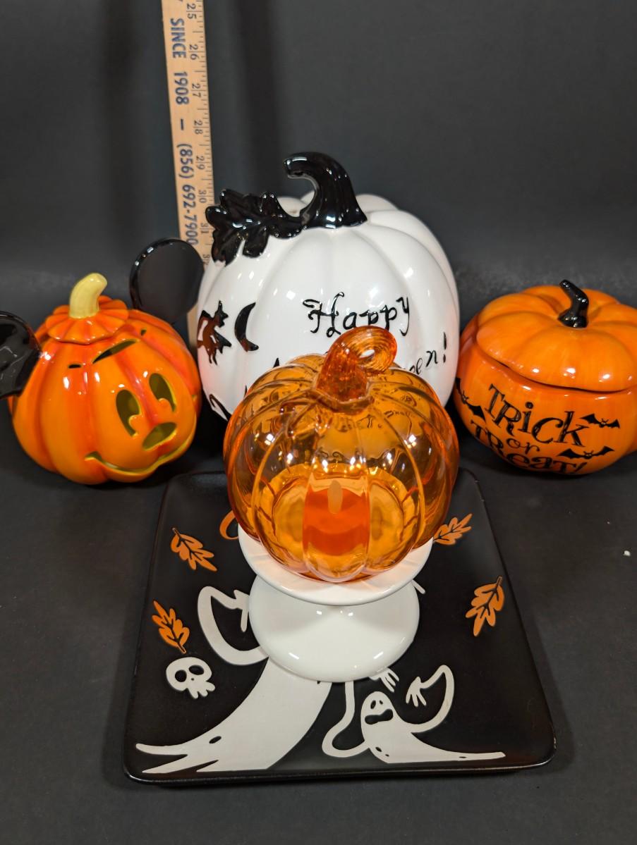 LOT 8B: Large Assortment Of Halloween Home Decor, Beautifully Made Witch Over 3 Ft. Tall, Ceramic Pumpkins, Mickey Mouse & Glass Pumpkin With Pillar Tea Light Holders, Hand Towels & More