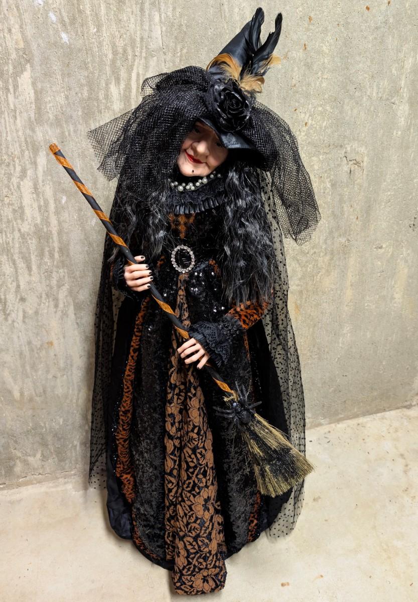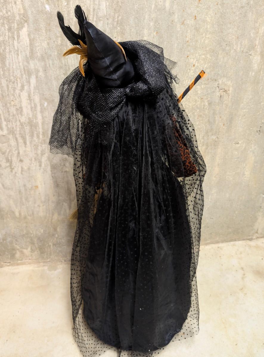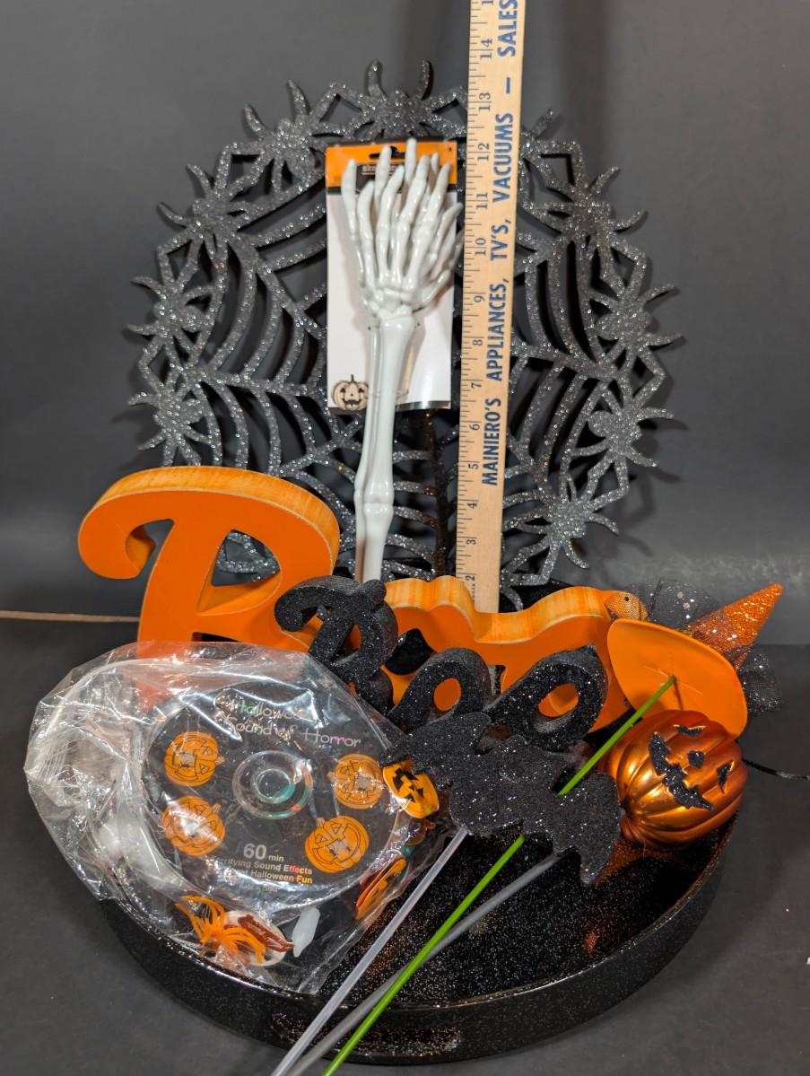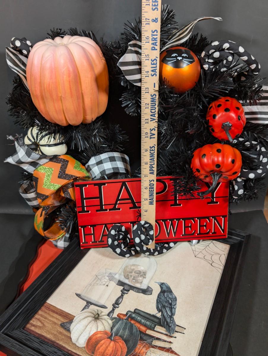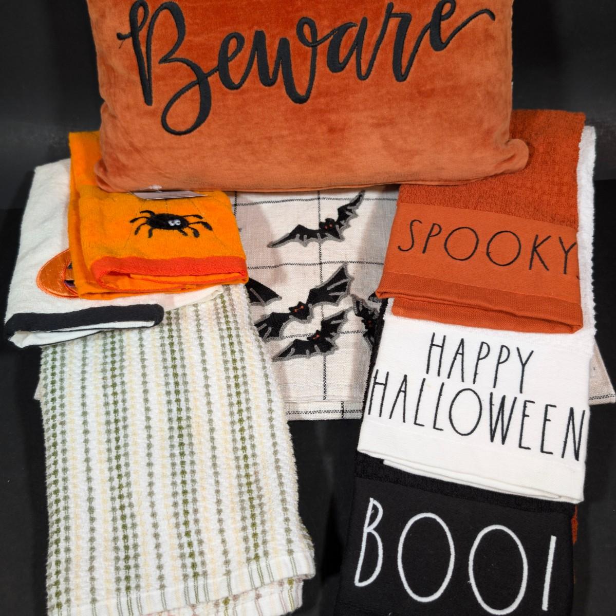 LOT 8B: Large Assortment Of Halloween Home Decor, Beautifully Made Witch Over 3 Ft. Tall, Ceramic Pumpkins, Mickey Mouse & Glass Pumpkin With Pillar Tea Light Holders, Hand Towels & More