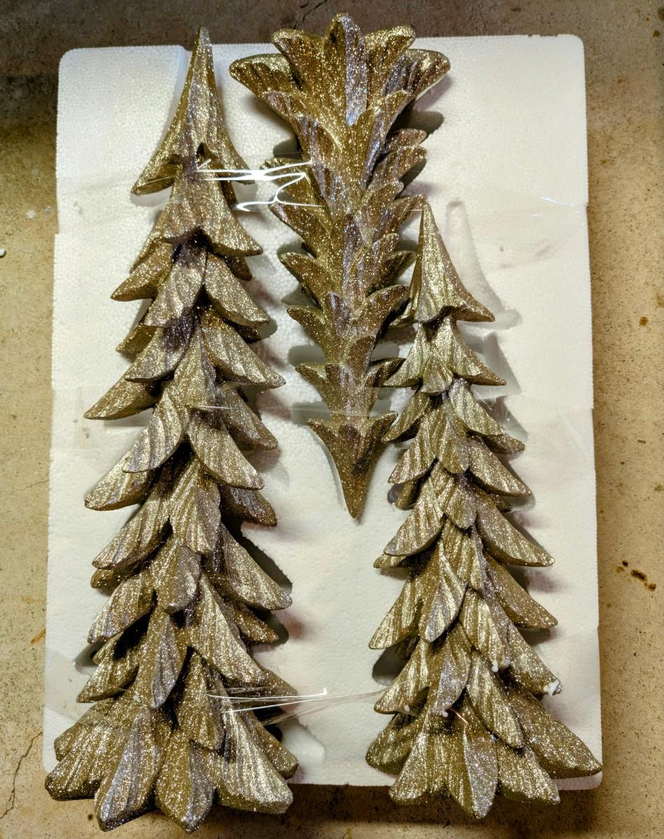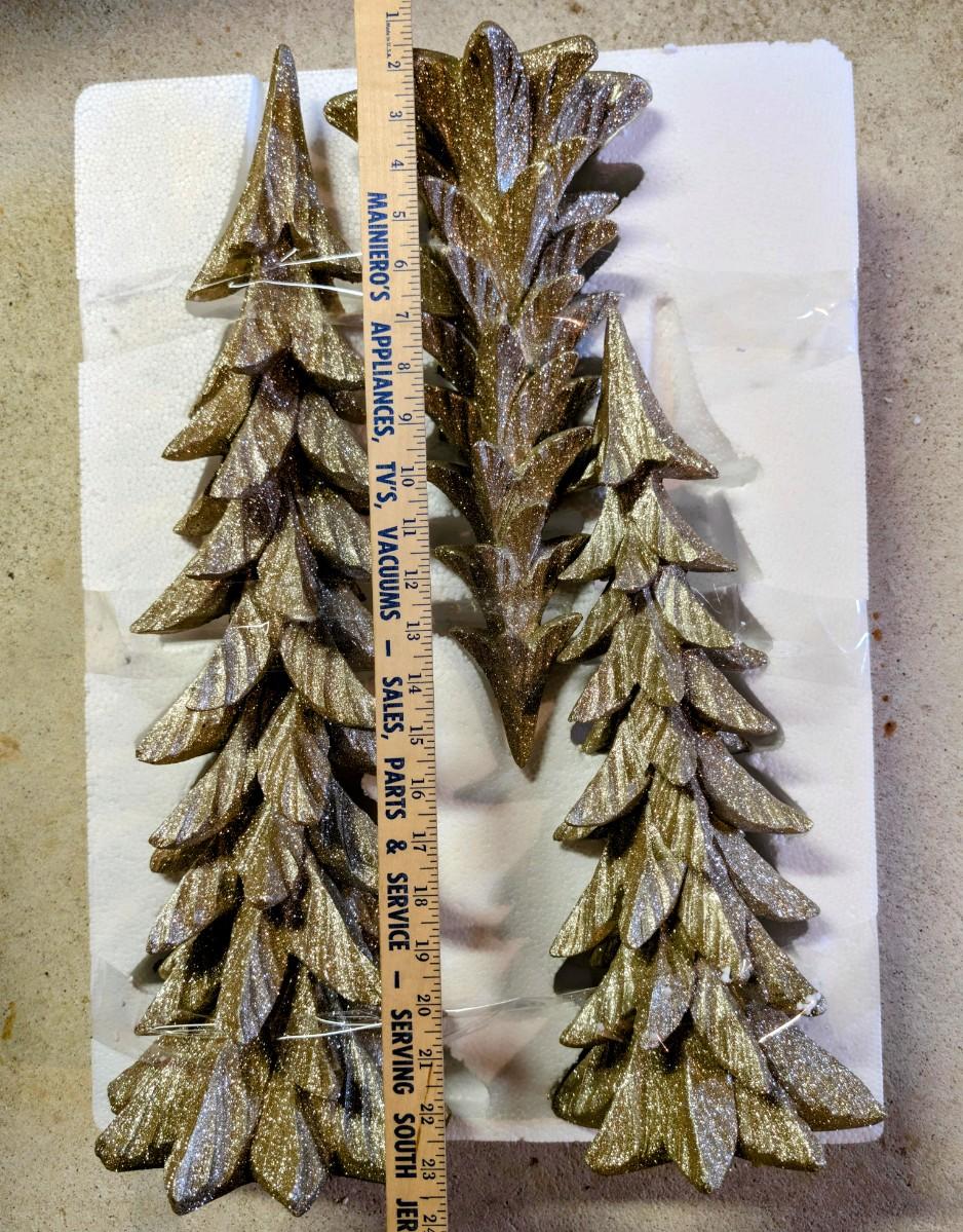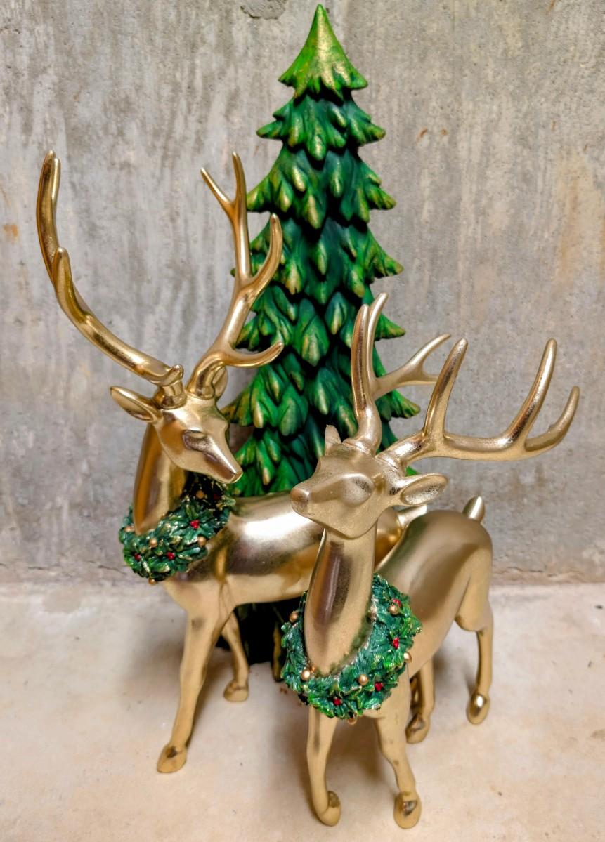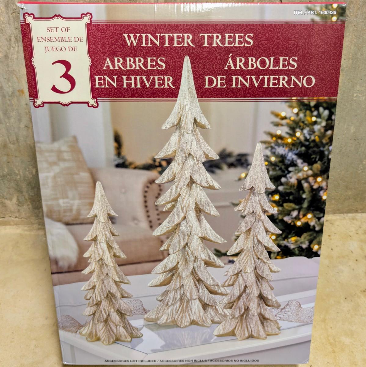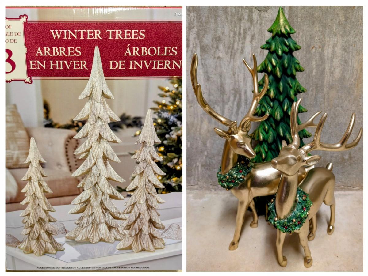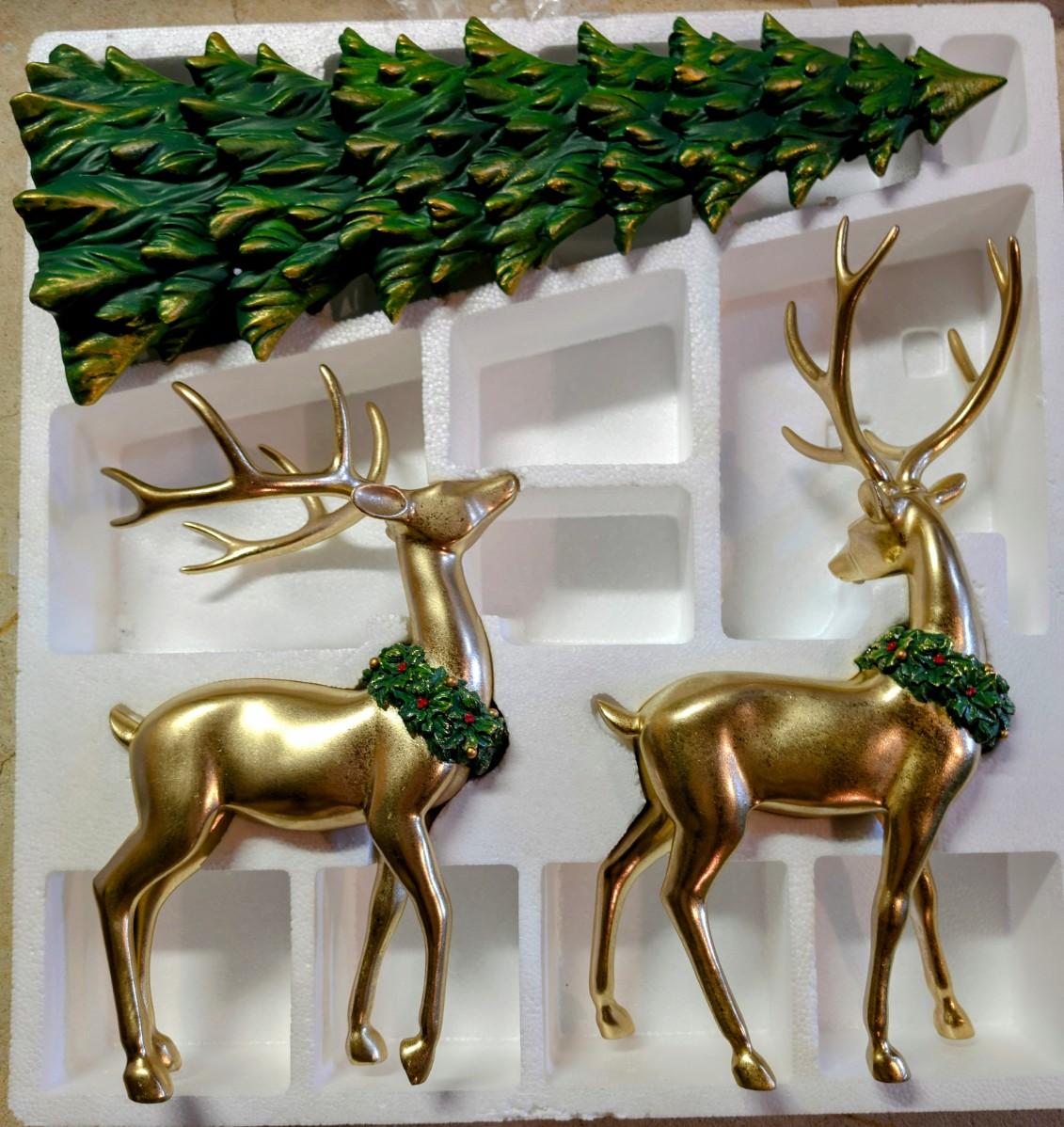 LOT 10B: Elegant Christmas Home Decor, 3 Farmhouse/Rustic Resin Winter Trees NIB & 2 Resin Gold Bucks With Tree, Comes With Original Styrofoam Box For Storing