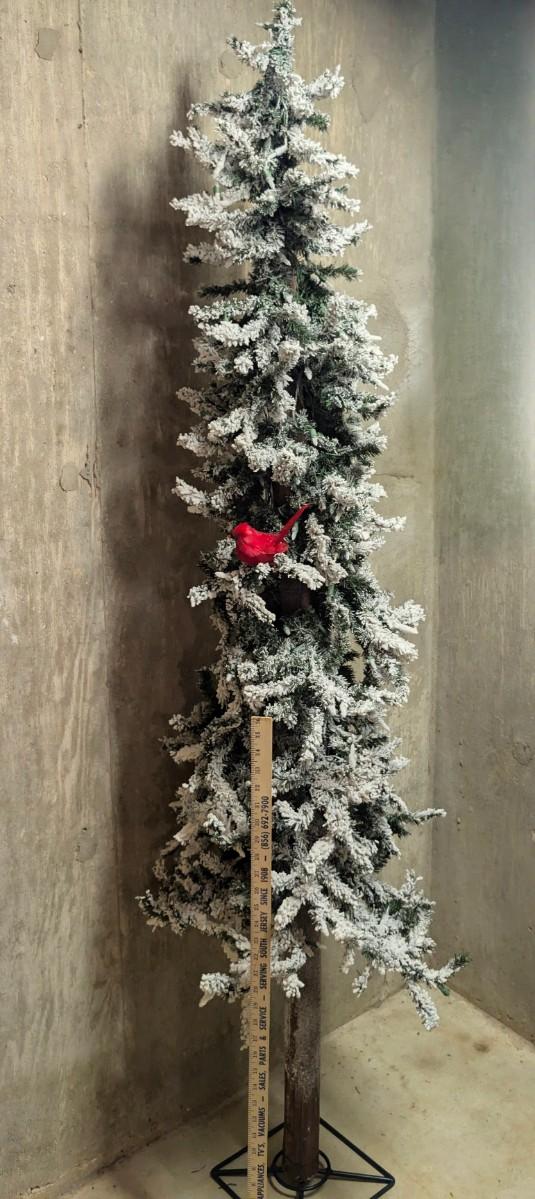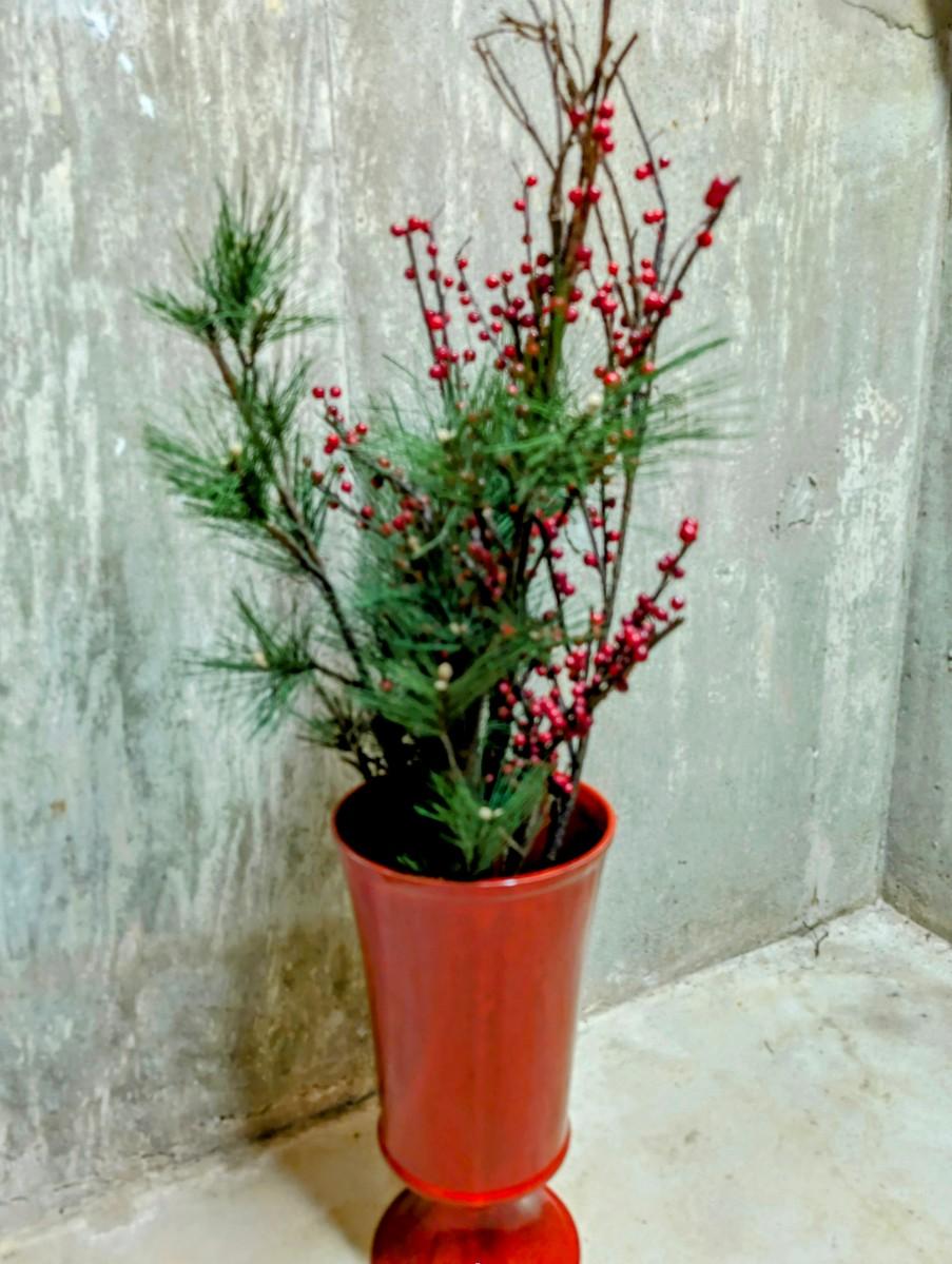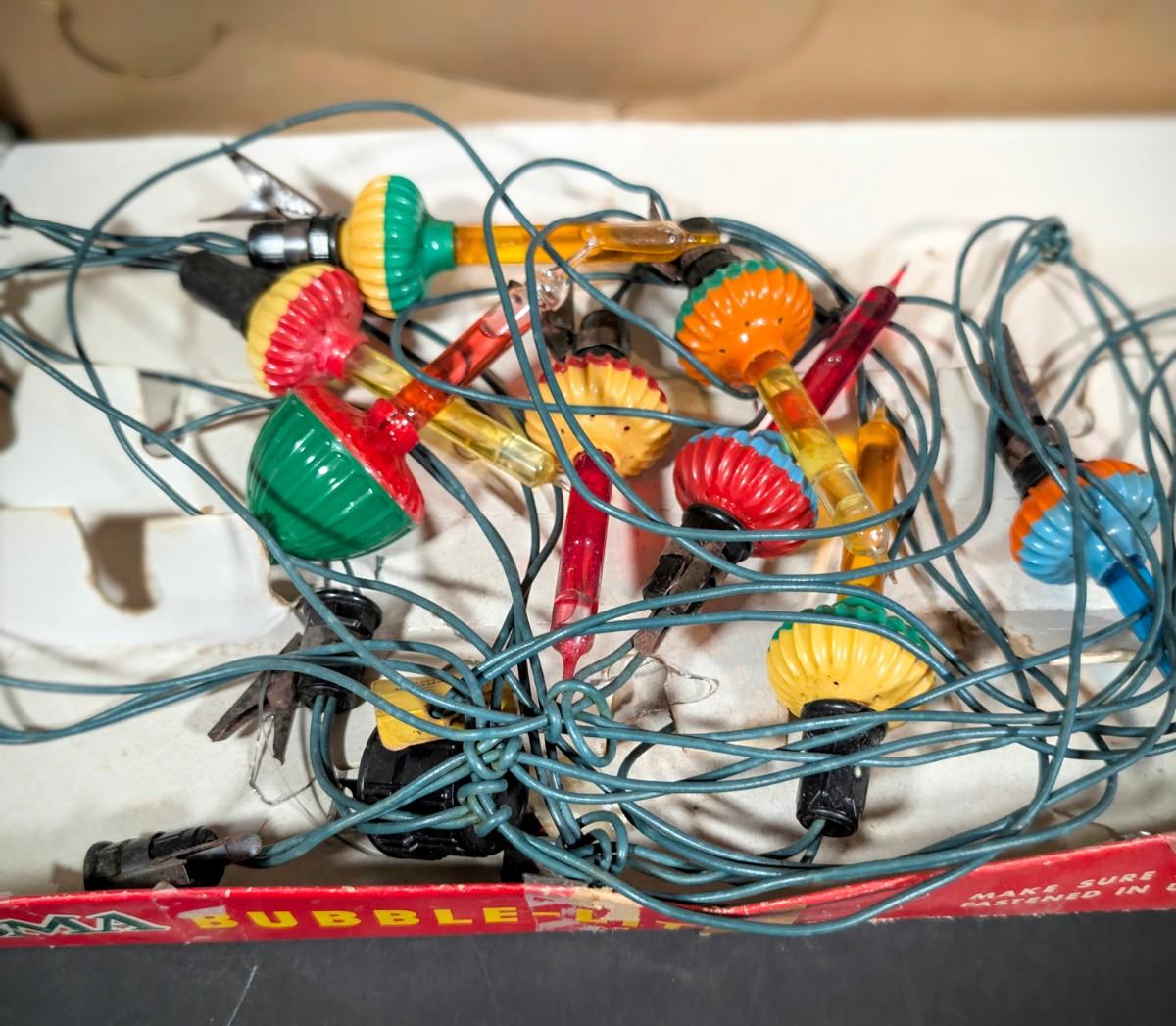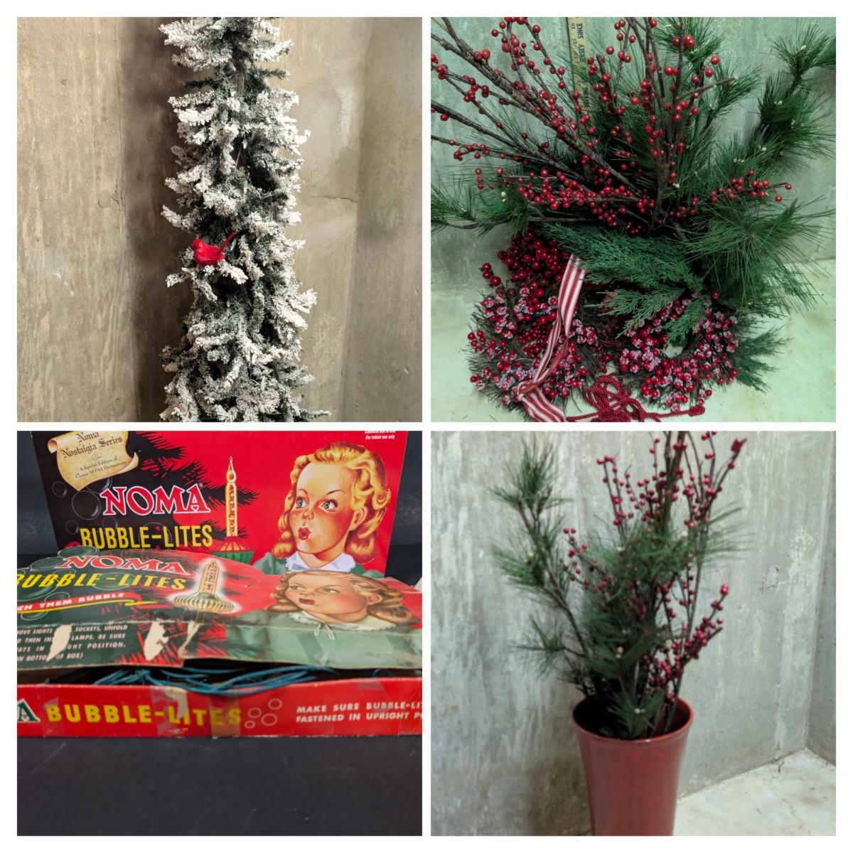 LOT 15B: Christmas Home Decor, Lighted Faux Flocked Tree, Lights Worked When Tested At Time Of Photo, 2 Sets of Nostalgic Inspired Bubble Lights, Not Tested, Crate & Barrel Tall Red Vase & More