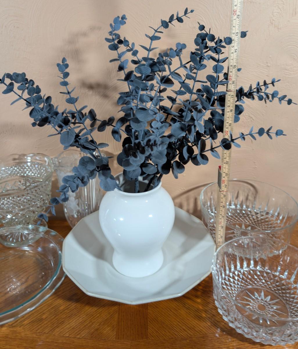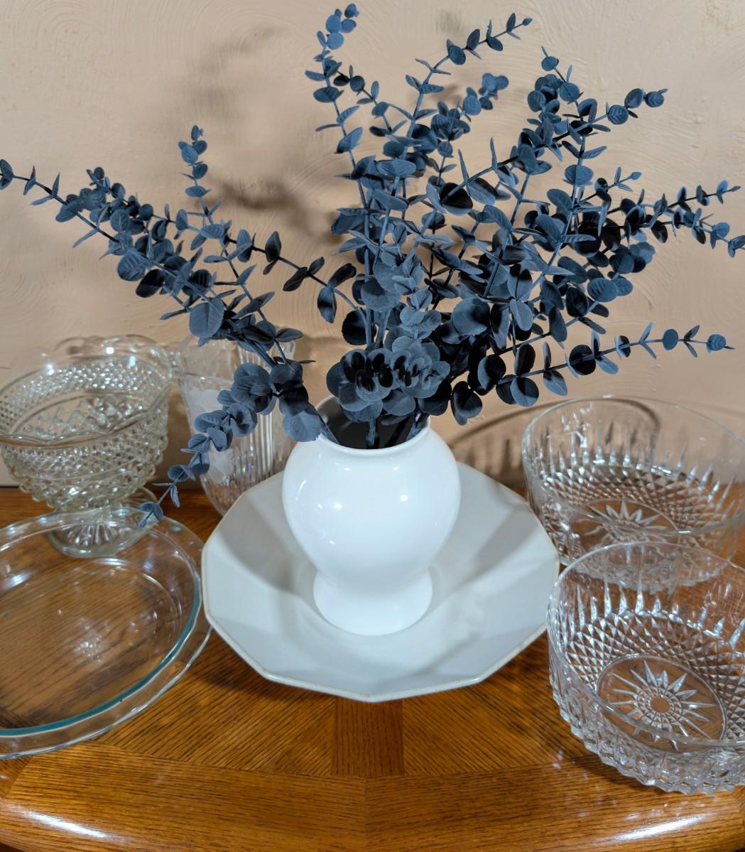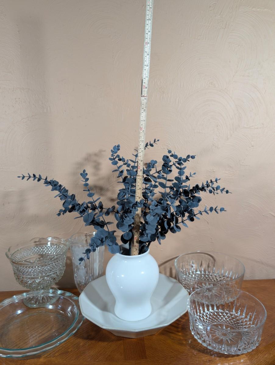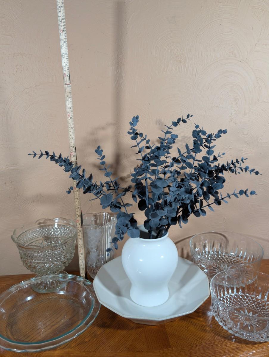 LOT 17L: Ceramic Vase On Base W/Dried Eucalyptus, Crystal Vase W/Frosted Grapes/Fruit, 1 Wexford Pattern Large Glass Fruit Bowl, 2 Starburst Glass Serving Bowls & 1 Clear Glass Pie Plate