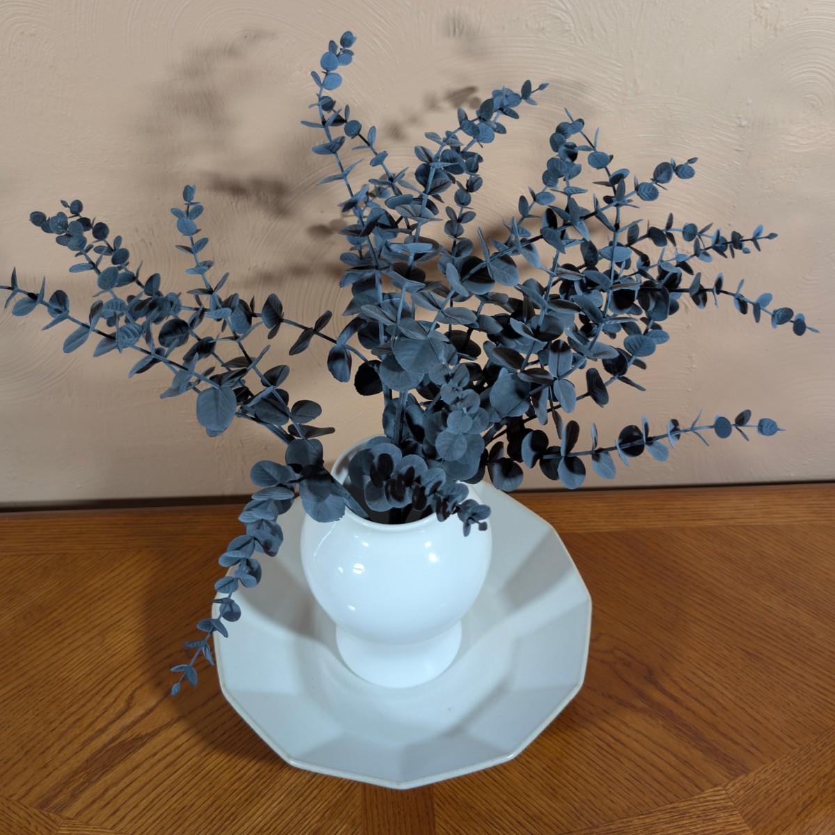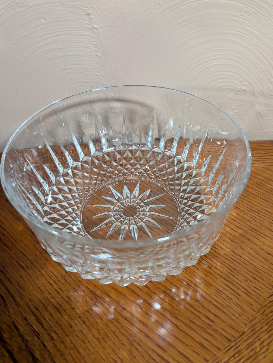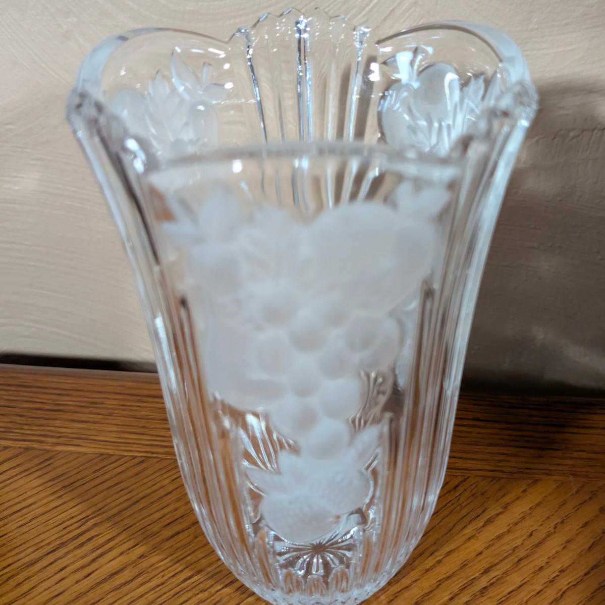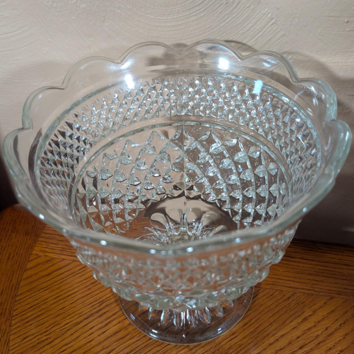 LOT 17L: Ceramic Vase On Base W/Dried Eucalyptus, Crystal Vase W/Frosted Grapes/Fruit, 1 Wexford Pattern Large Glass Fruit Bowl, 2 Starburst Glass Serving Bowls & 1 Clear Glass Pie Plate