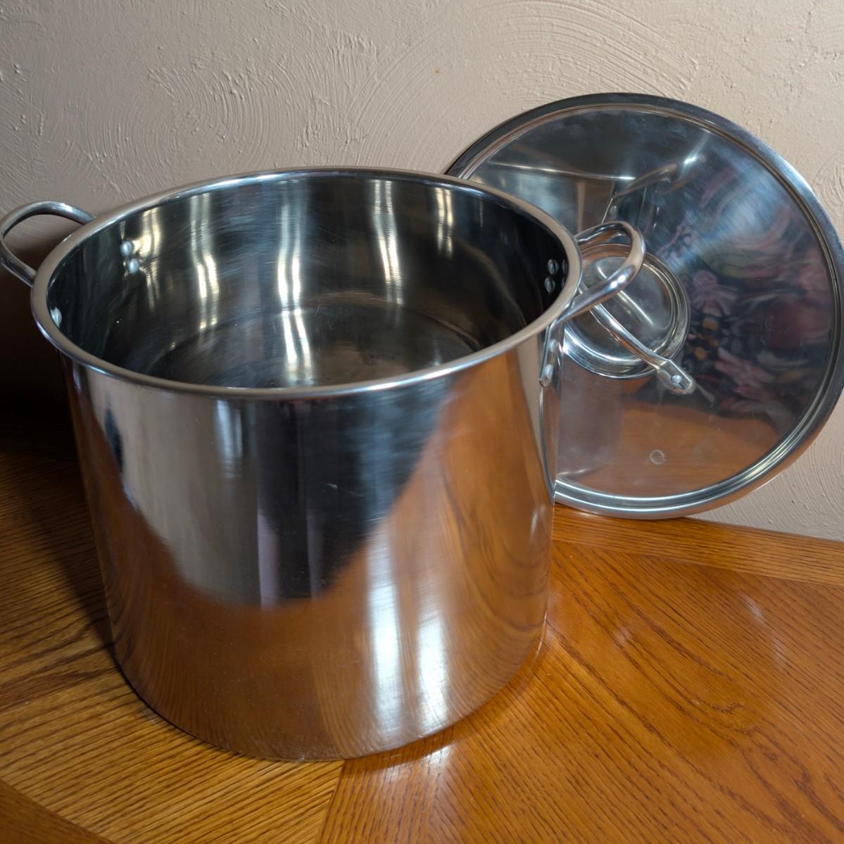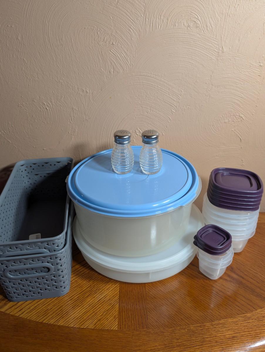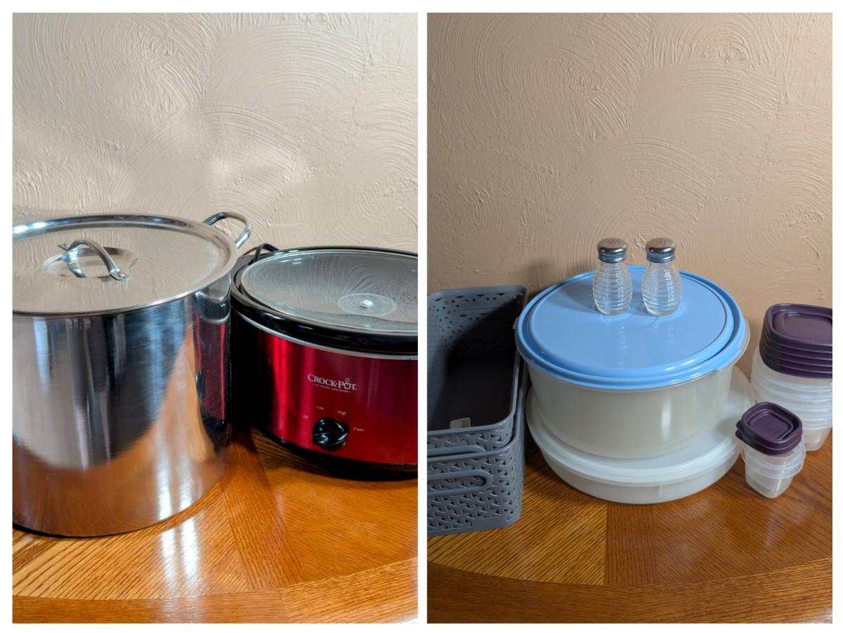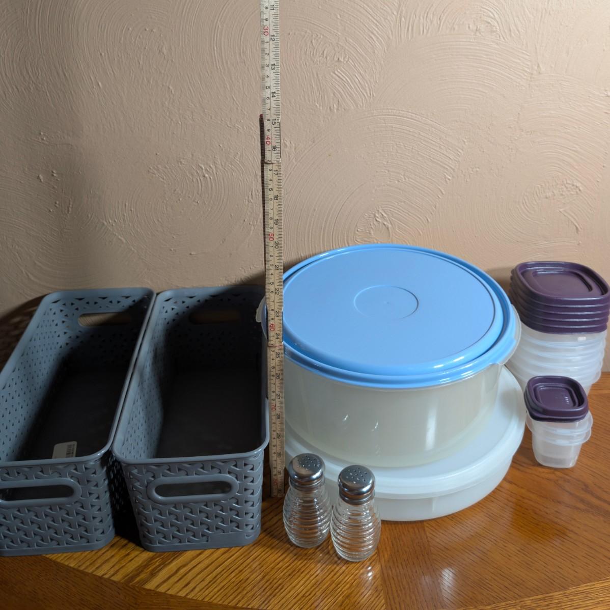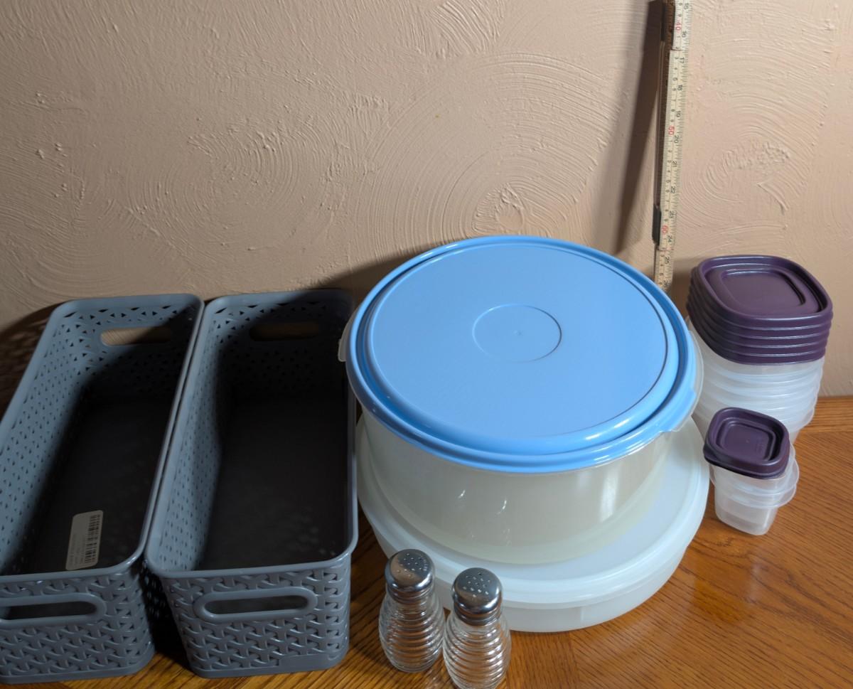 LOT 19L: Kitchen Ware, Large Stainless Steel Stock Pot, Crock Pot Model: SCV603 R Not Tested, Opaque Tupperware, Large & Smaller Storage Containers, Open & Lidded, Also 1 Clear glass S & P Shaker Set