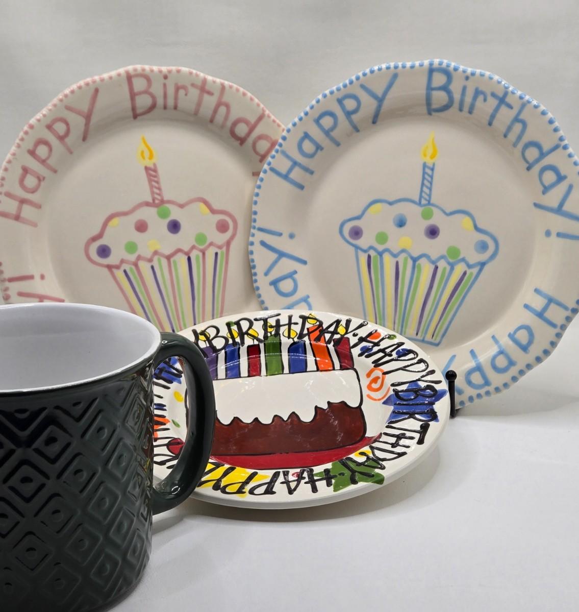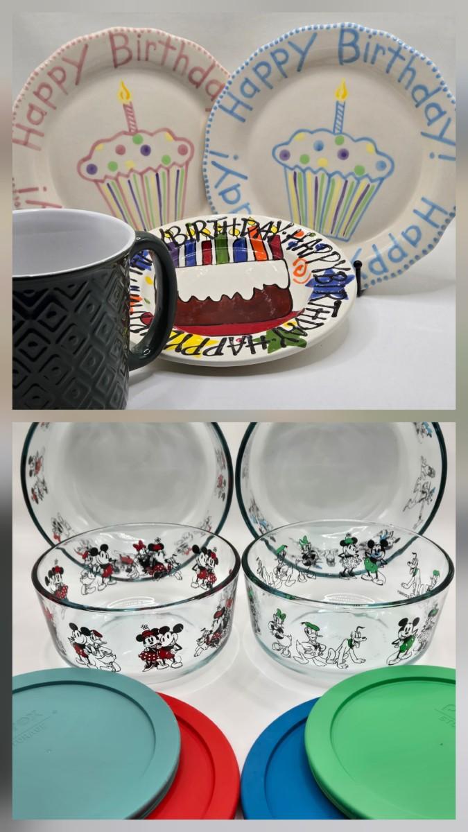 LOT 45K: Birthday Plates, Disney Pyrex Bowls with Lids, and Big Mug for When You Need That Extra Jolt of Coffee
