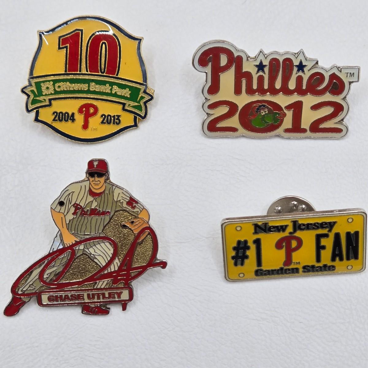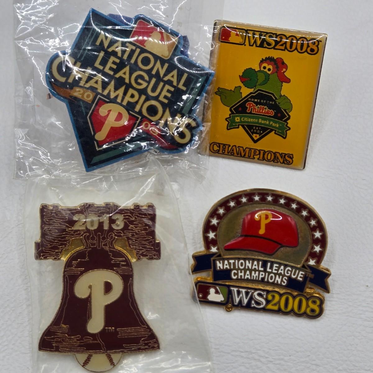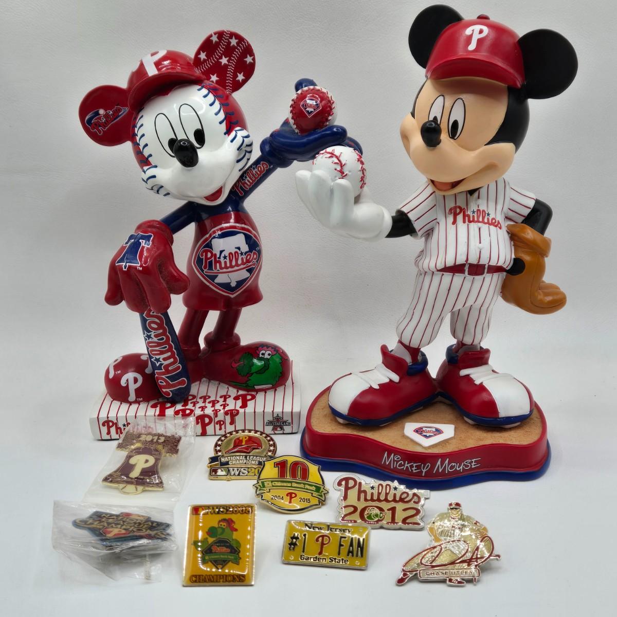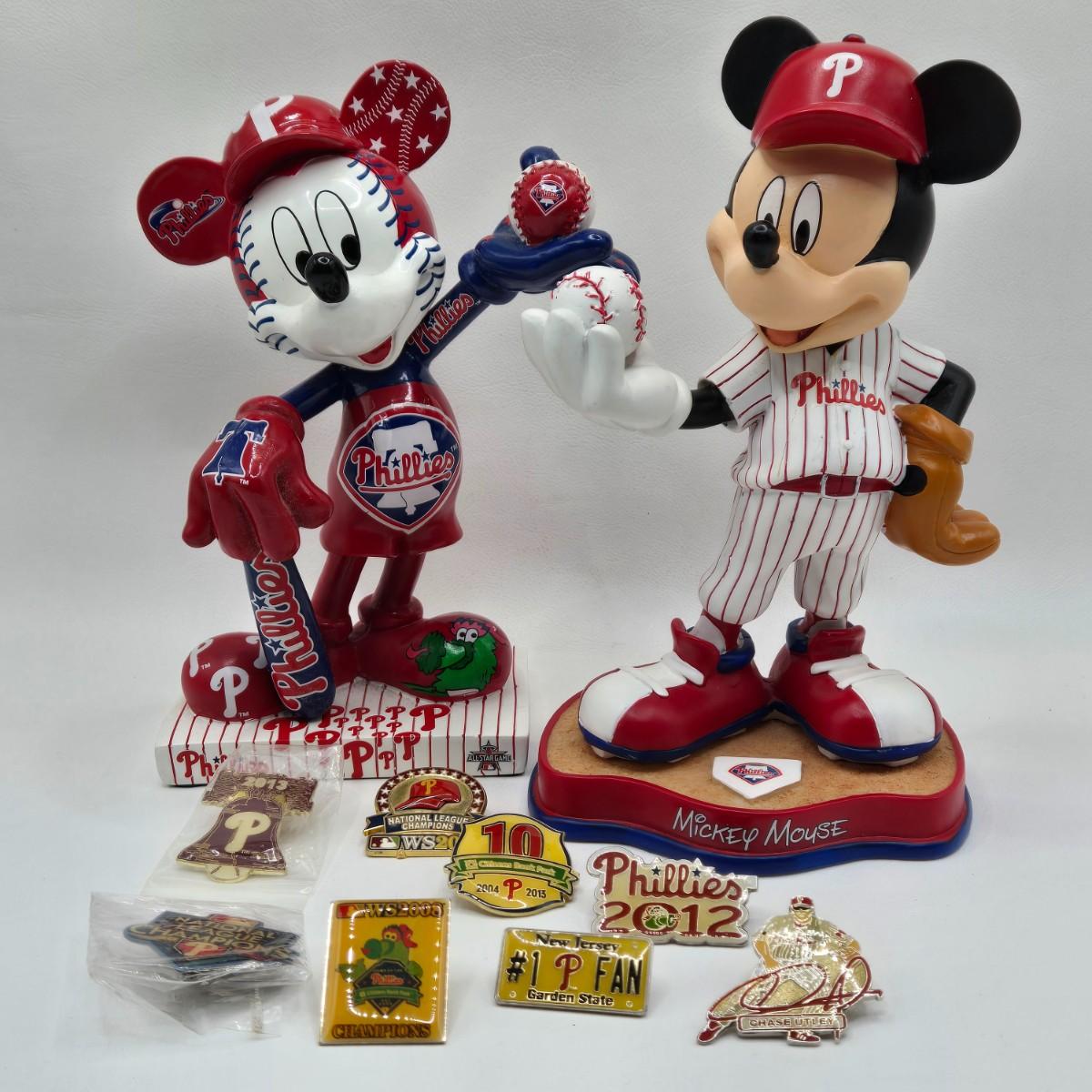 LOT Phillies Pins and 2 Forever Collectibles Phillies' Mickey Mouse Figurines / GO PHILLIES!!