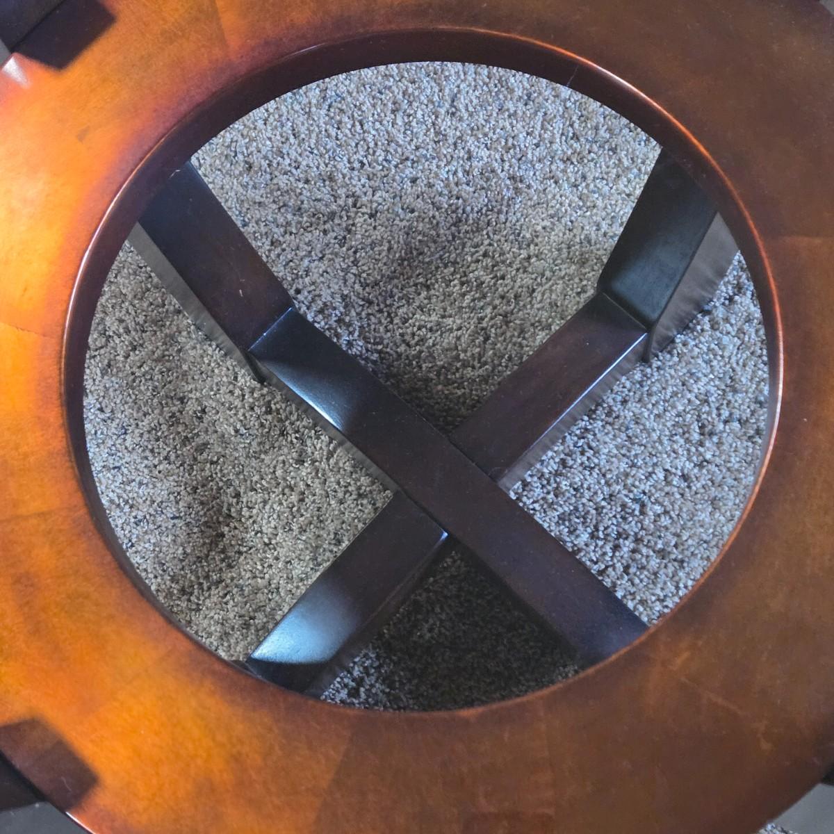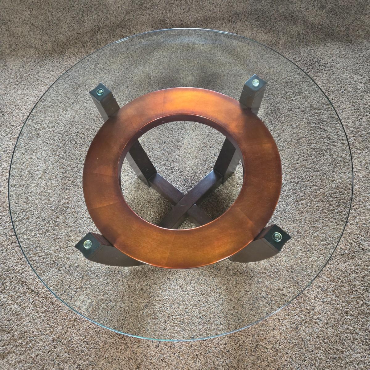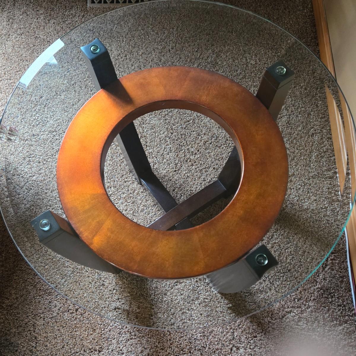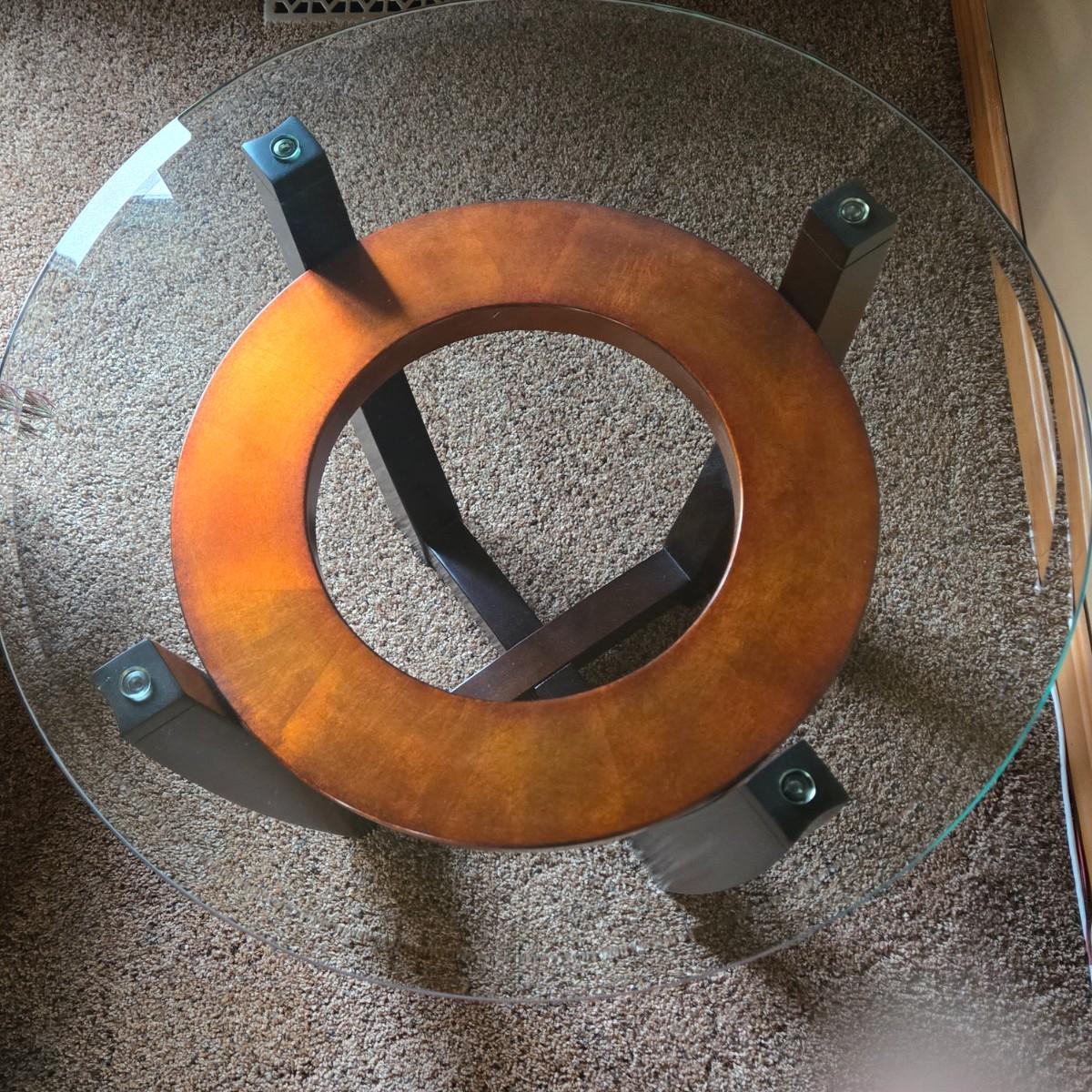 Coffee table is 34in. round and 19in. high. Side table is 27.5in. round and 24in high. Please see all pictures as they are the best representation of the items. The pictures show condition, measurements if taken, and what is included in the lot. Due to the large amount that we photograph and the time frame, we are not always able to take measurements. All items unless noted, are pre-owned and have been used. If you purchased furniture, you must bring help. We do not allow one person to carry large furniture out on their own. Bring help, tools and a truck for the safety of our client’s homes, and your personal safety. Any damages that result to the property including walls, and floors due to moving of the furniture will be charged to the buyer. Company policy. Thank you.
