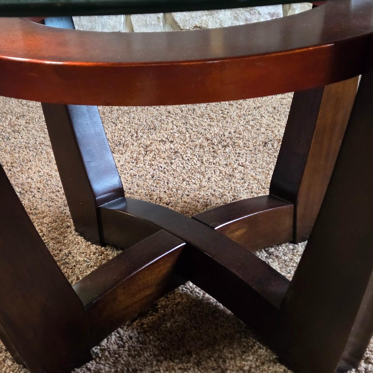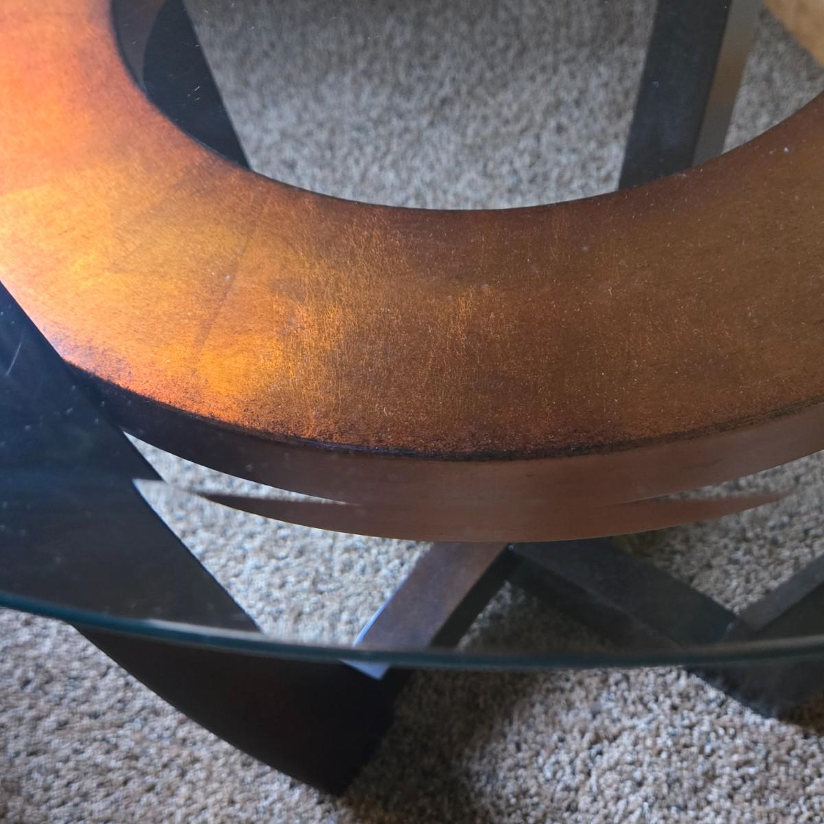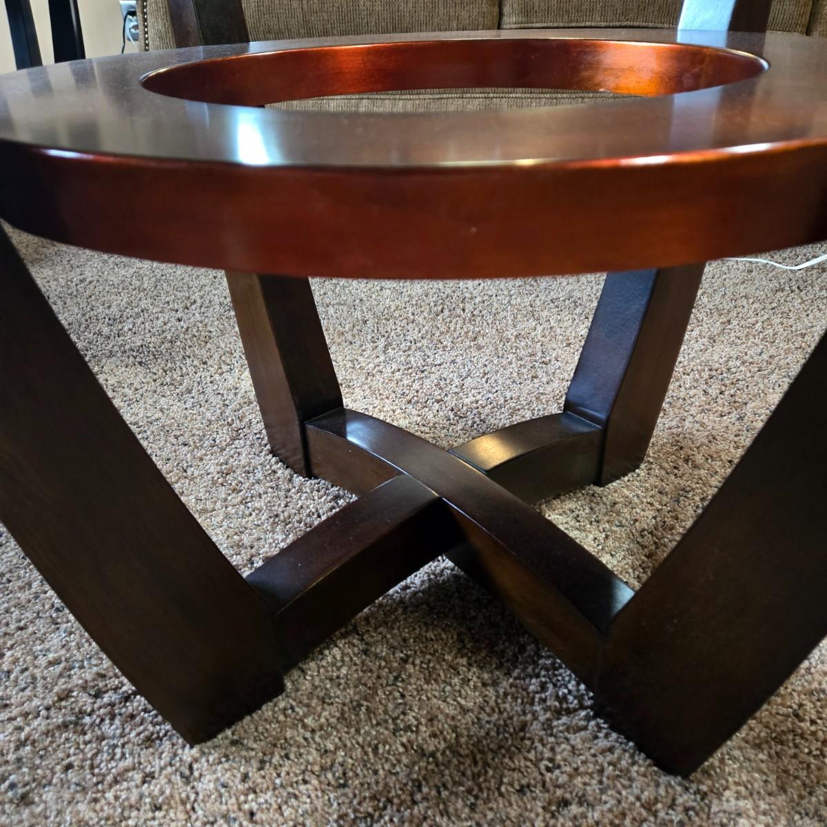 Coffee table is 34in. round and 19in. high. Side table is 27.5in. round and 24in high. Please see all pictures as they are the best representation of the items. The pictures show condition, measurements if taken, and what is included in the lot. Due to the large amount that we photograph and the time frame, we are not always able to take measurements. All items unless noted, are pre-owned and have been used. If you purchased furniture, you must bring help. We do not allow one person to carry large furniture out on their own. Bring help, tools and a truck for the safety of our client’s homes, and your personal safety. Any damages that result to the property including walls, and floors due to moving of the furniture will be charged to the buyer. Company policy. Thank you.