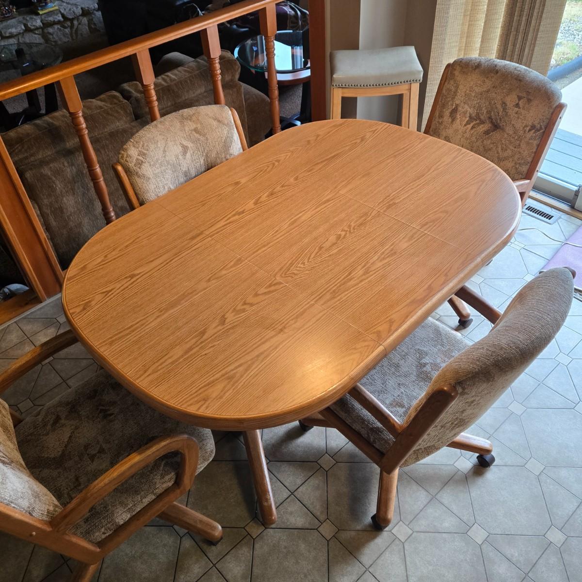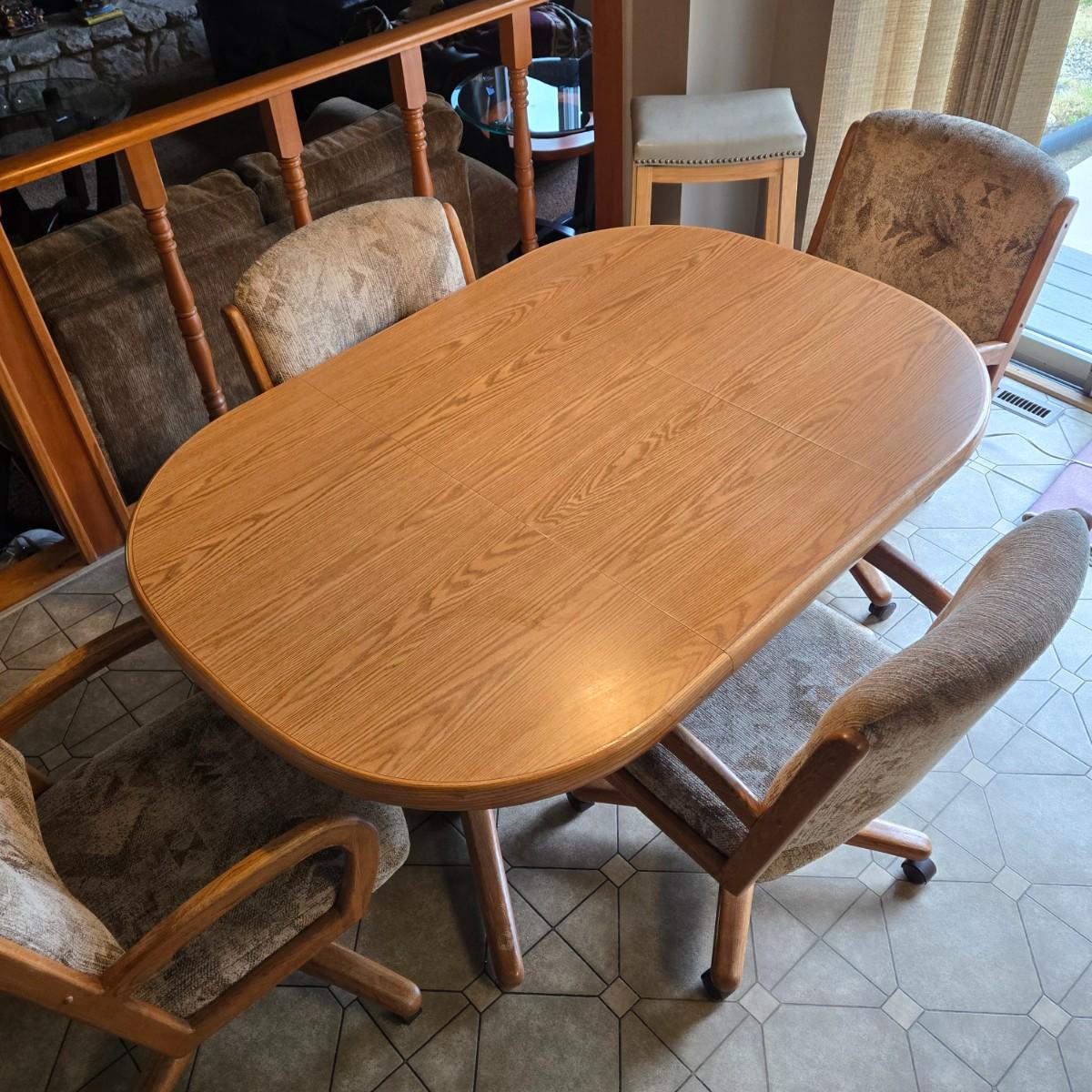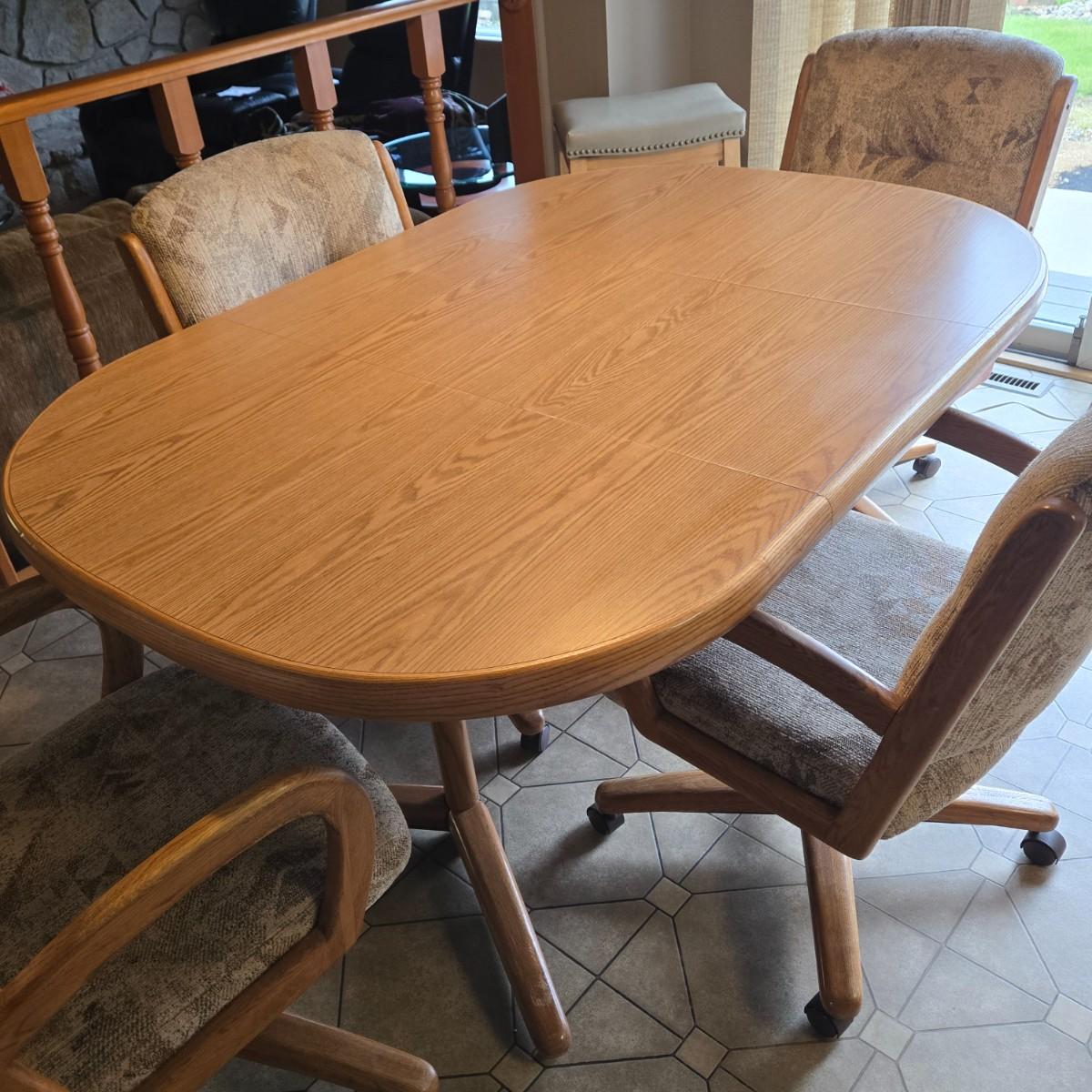 Table and chairs are in excellent condition. table measures 57 in. long with leaf in and 39in. wide. Leaf is 17.75in. wide. Please see all pictures as they are the best representation of the items. The pictures show condition, measurements if taken, and what is included in the lot. Due to the large amount that we photograph and the time frame, we are not always able to take measurements. All items unless noted, are pre-owned and have been used. If you purchased furniture, you must bring help. We do not allow one person to carry large furniture out on their own. Bring help, tools and a truck for the safety of our client’s homes, and your personal safety. Any damages that result to the property including walls, and floors due to moving of the furniture will be charged to the buyer. Company policy. Thank you.