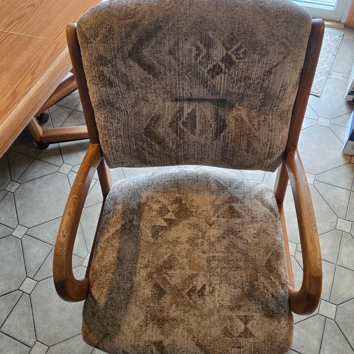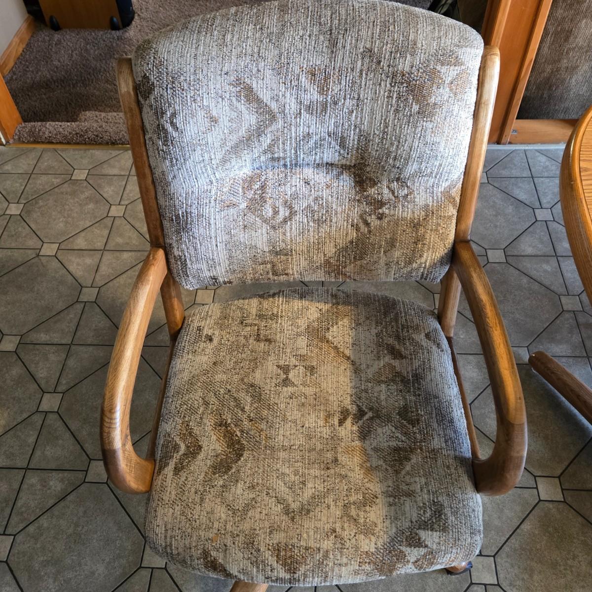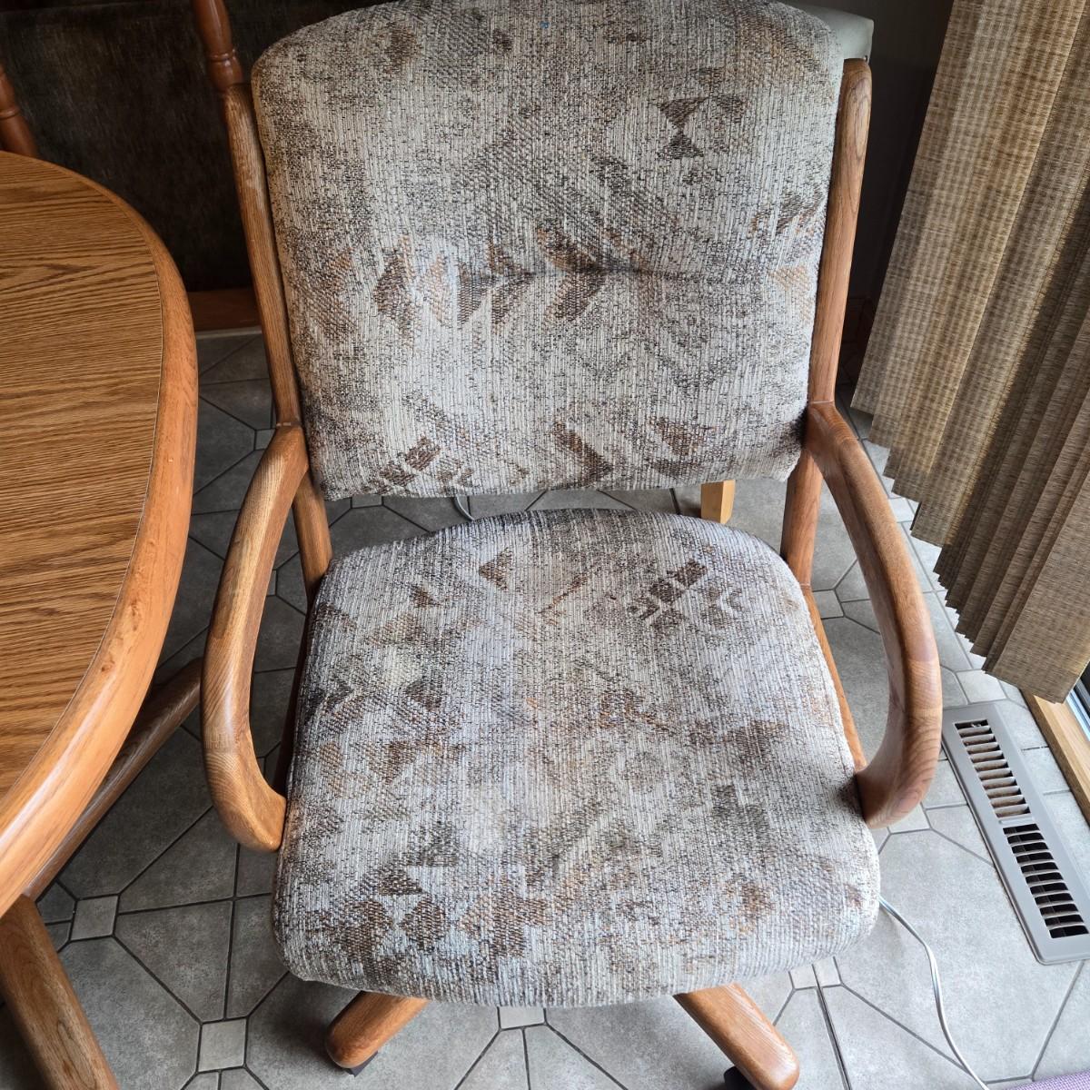 Table and chairs are in excellent condition. table measures 57 in. long with leaf in and 39in. wide. Leaf is 17.75in. wide. Please see all pictures as they are the best representation of the items. The pictures show condition, measurements if taken, and what is included in the lot. Due to the large amount that we photograph and the time frame, we are not always able to take measurements. All items unless noted, are pre-owned and have been used. If you purchased furniture, you must bring help. We do not allow one person to carry large furniture out on their own. Bring help, tools and a truck for the safety of our client’s homes, and your personal safety. Any damages that result to the property including walls, and floors due to moving of the furniture will be charged to the buyer. Company policy. Thank you.