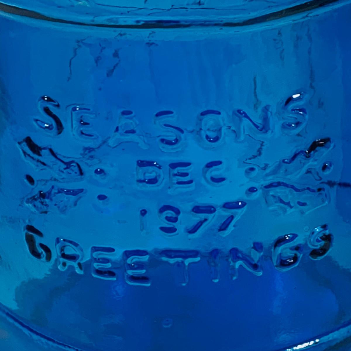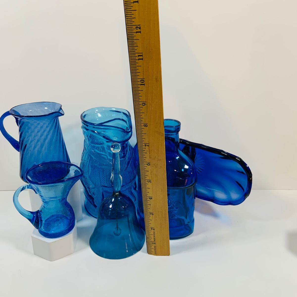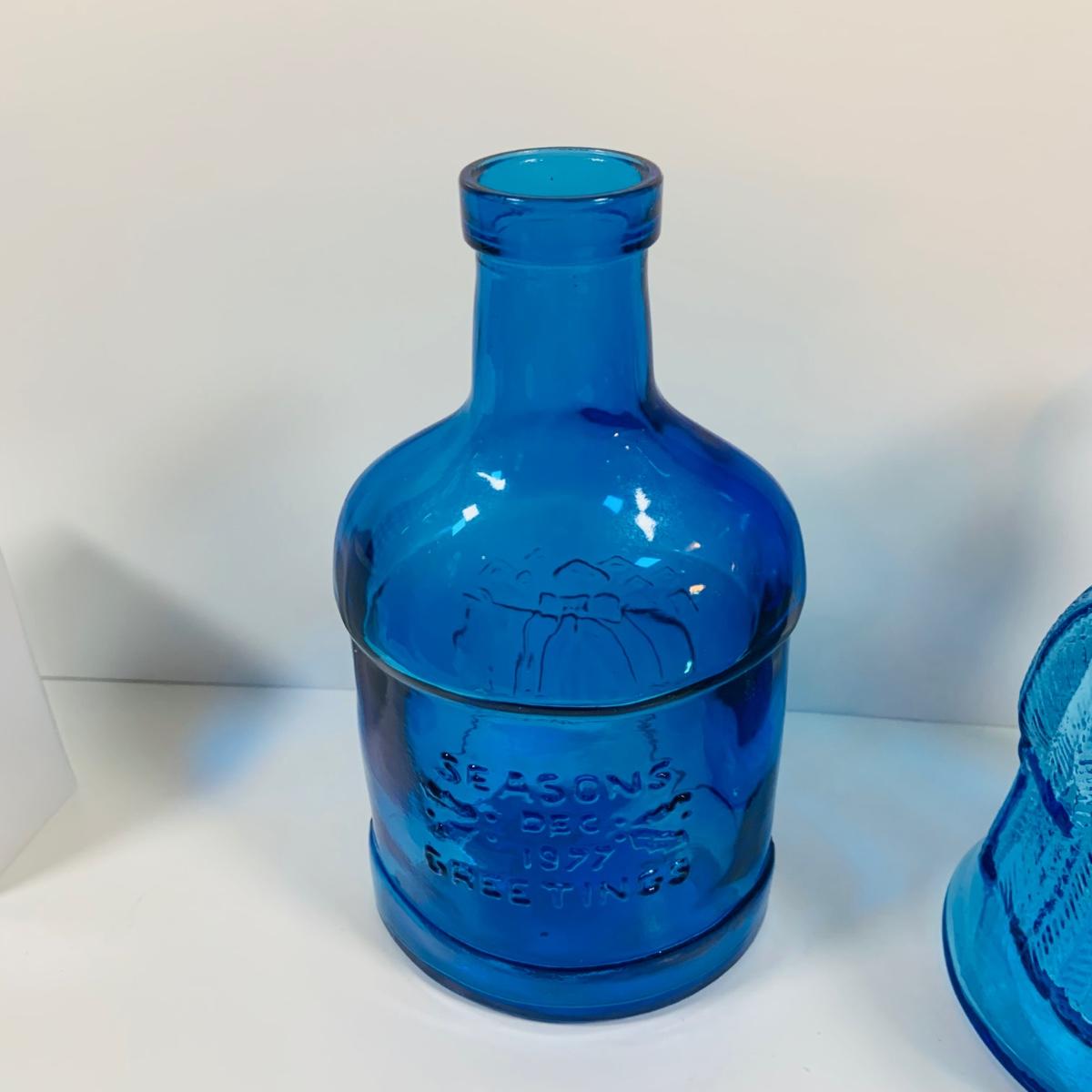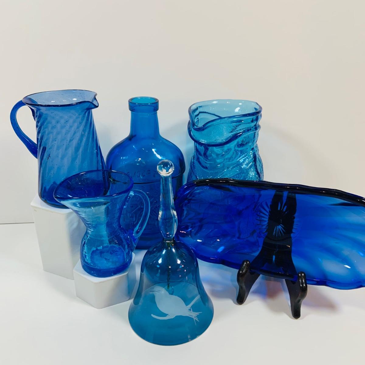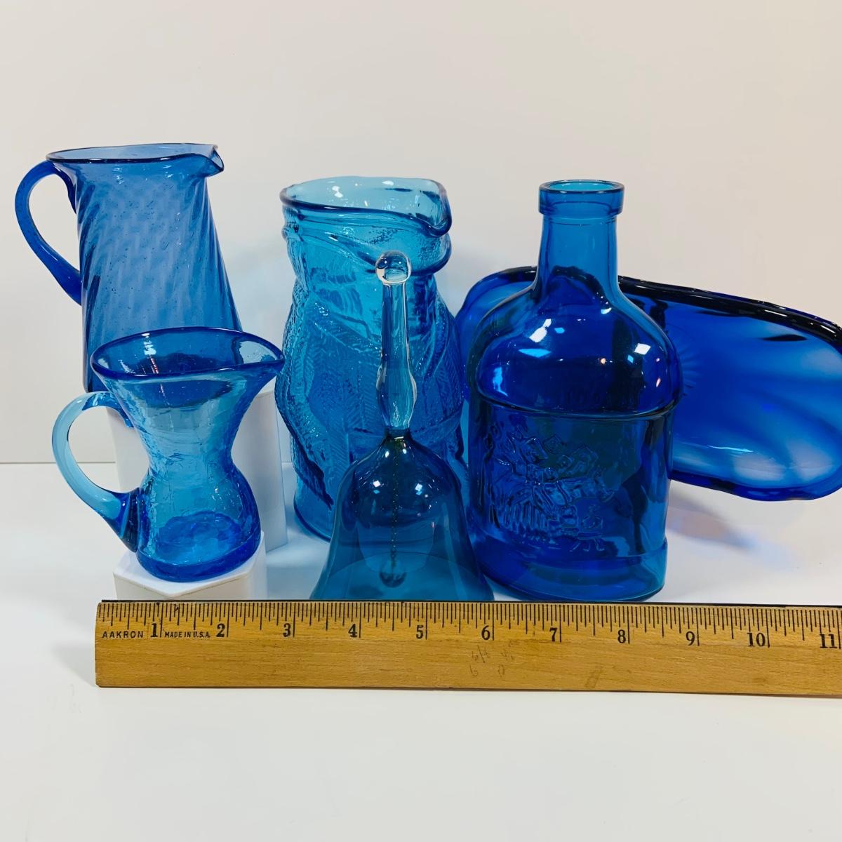 LOT 4: Beautiful Cobalt Blue Glass Collection Including Relish Dish, Bell with Etched Bird, Glass Toby Jug, Wheaton Season’s Greeting Bottle and More