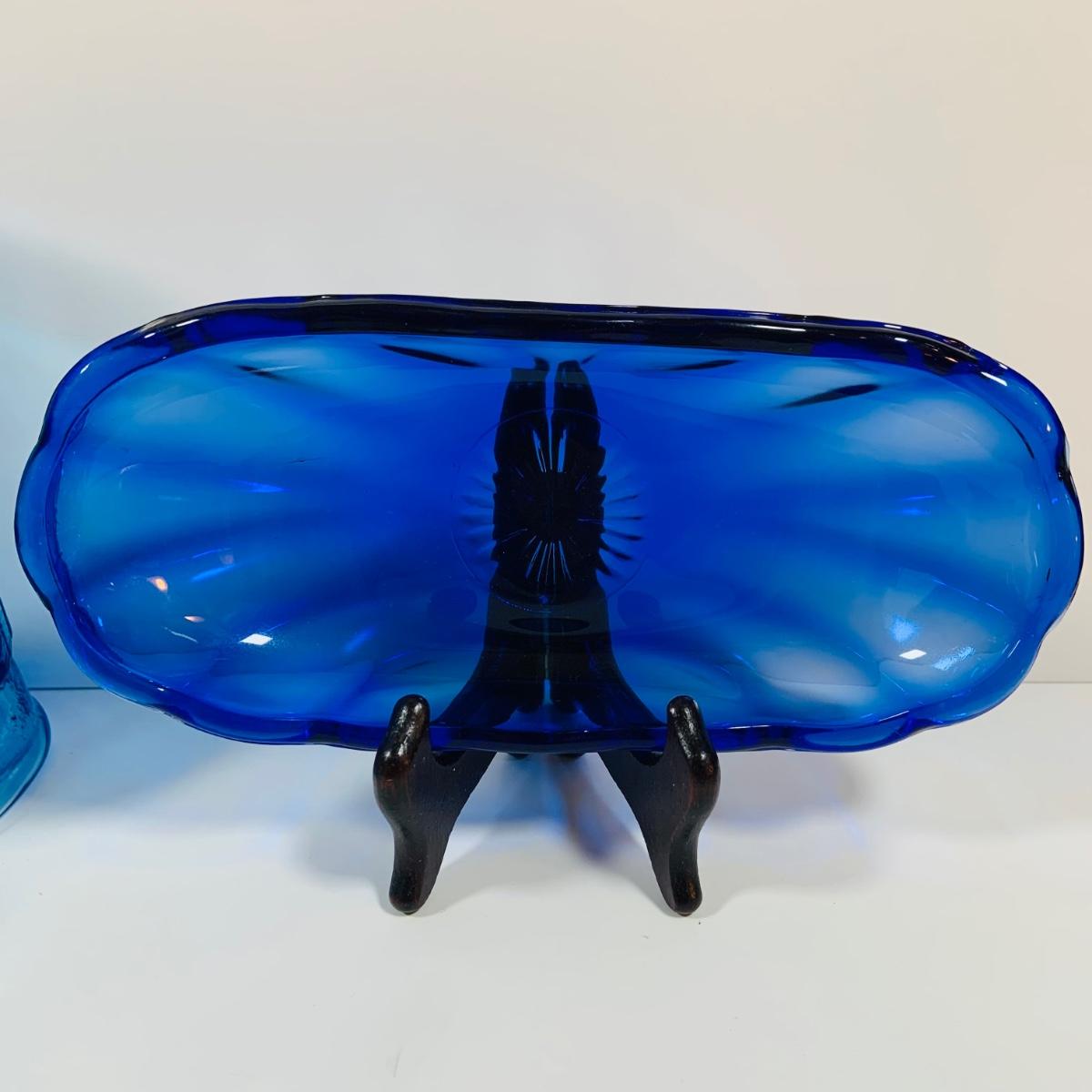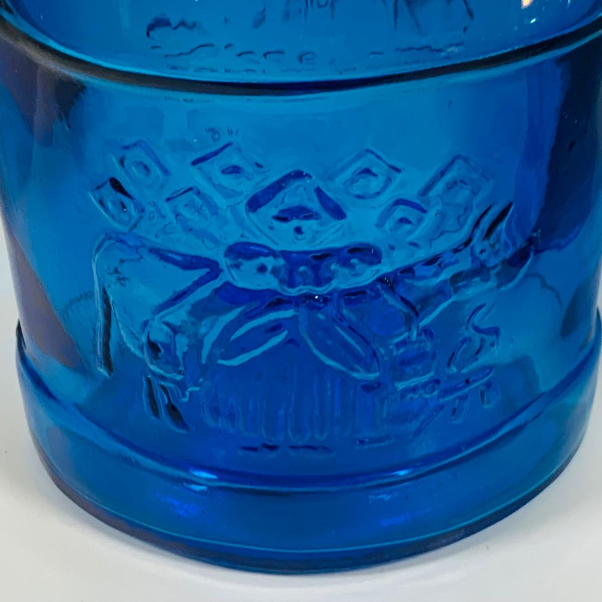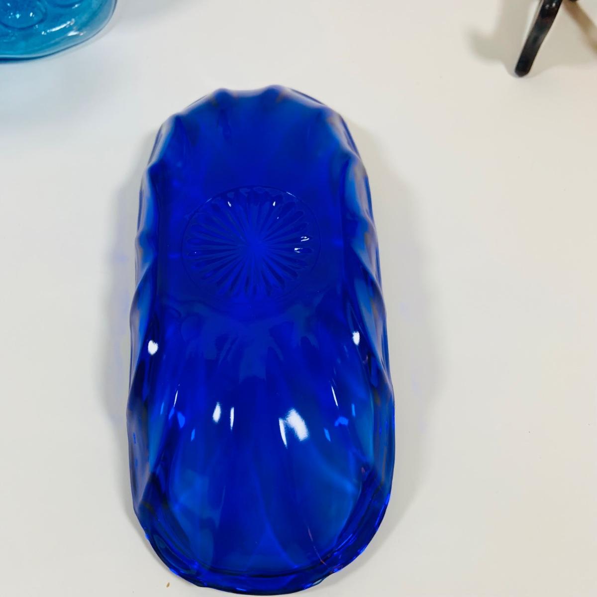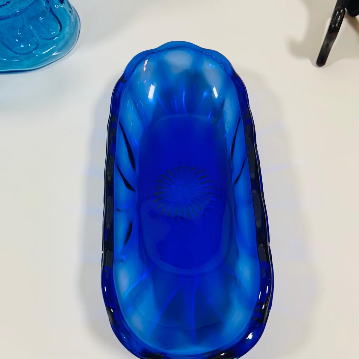 LOT 4: Beautiful Cobalt Blue Glass Collection Including Relish Dish, Bell with Etched Bird, Glass Toby Jug, Wheaton Season’s Greeting Bottle and More