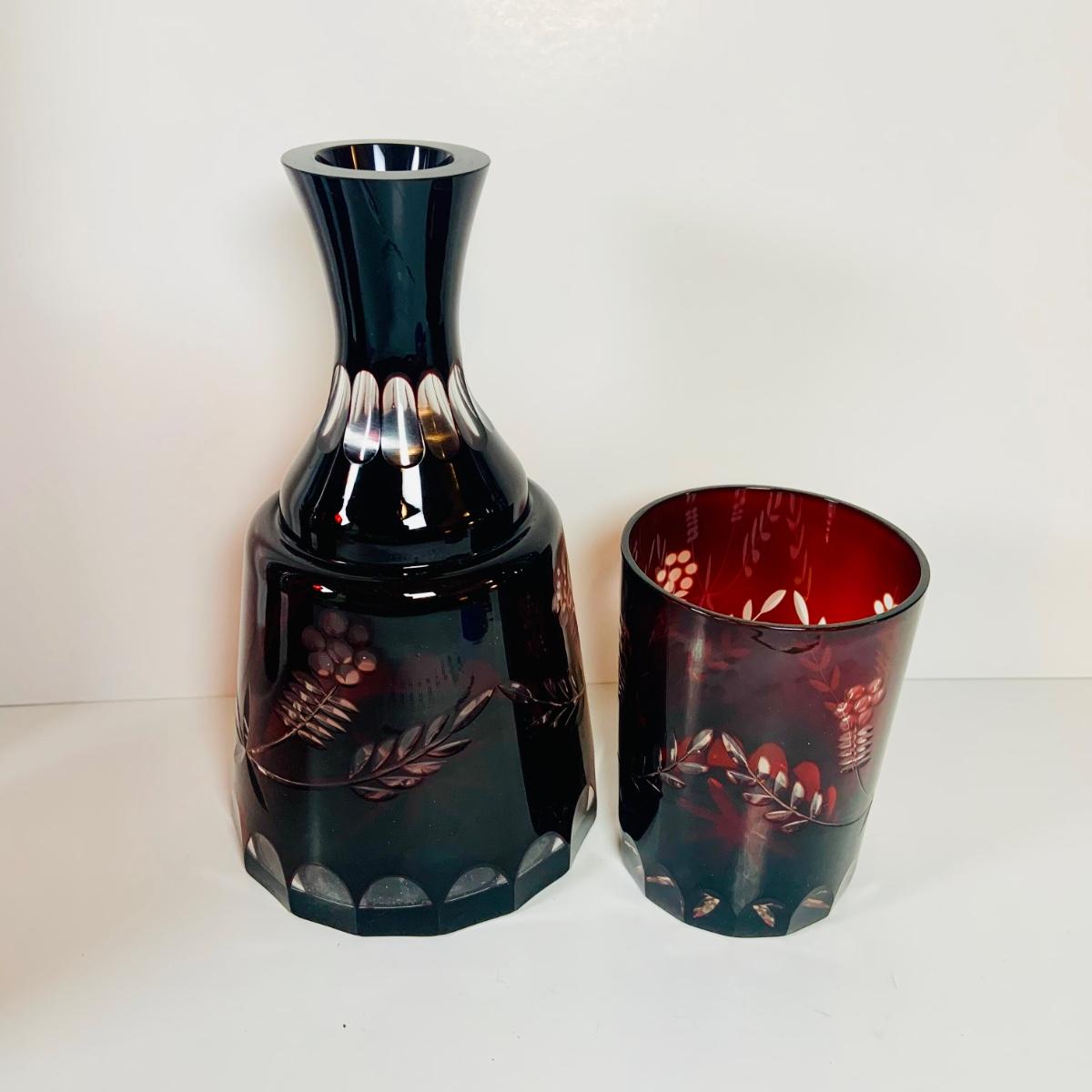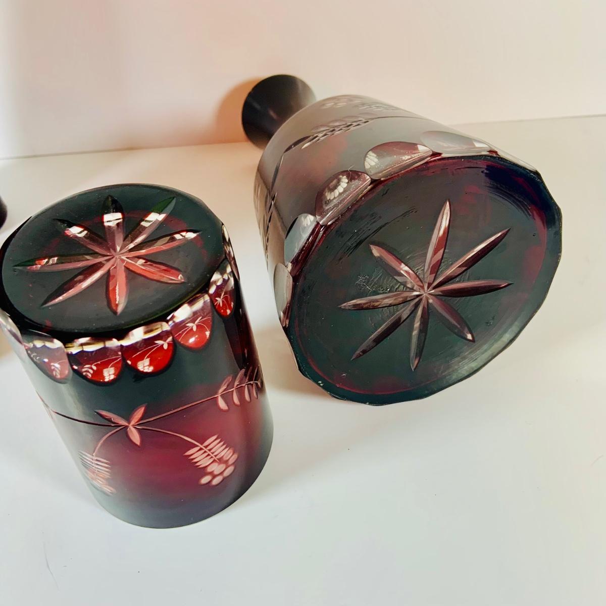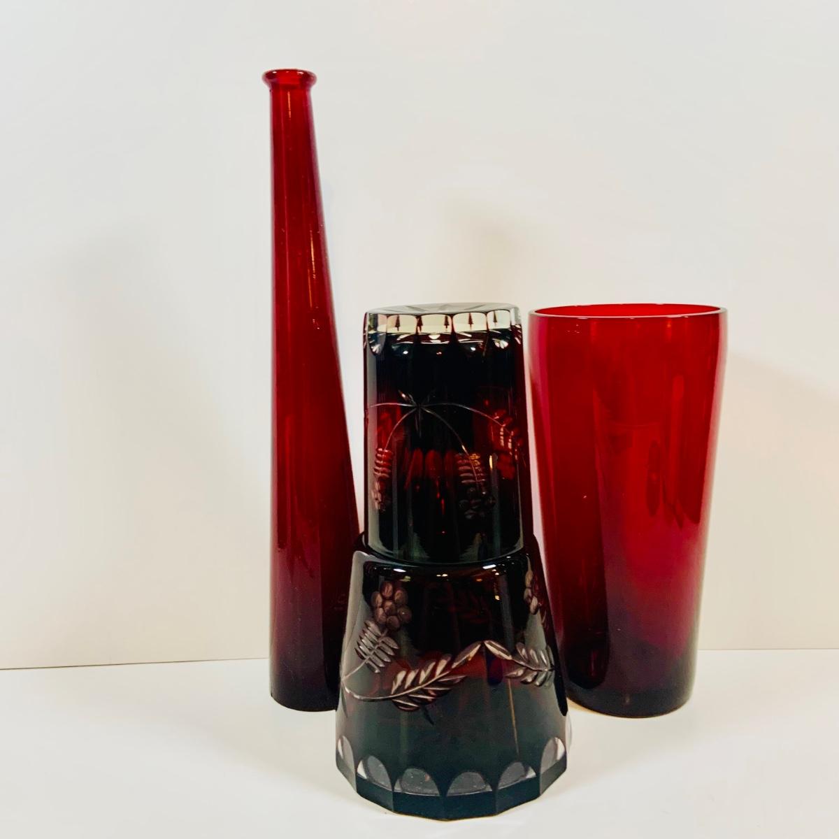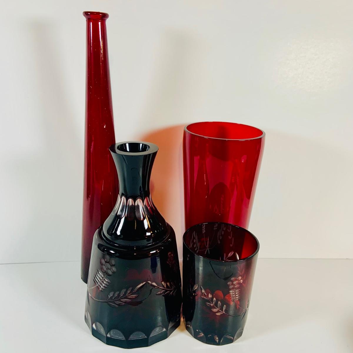 Lot 9: Bohemian Czech Amethyst Cut Glass Decanter and Tumbler and Red Art Glass Vases