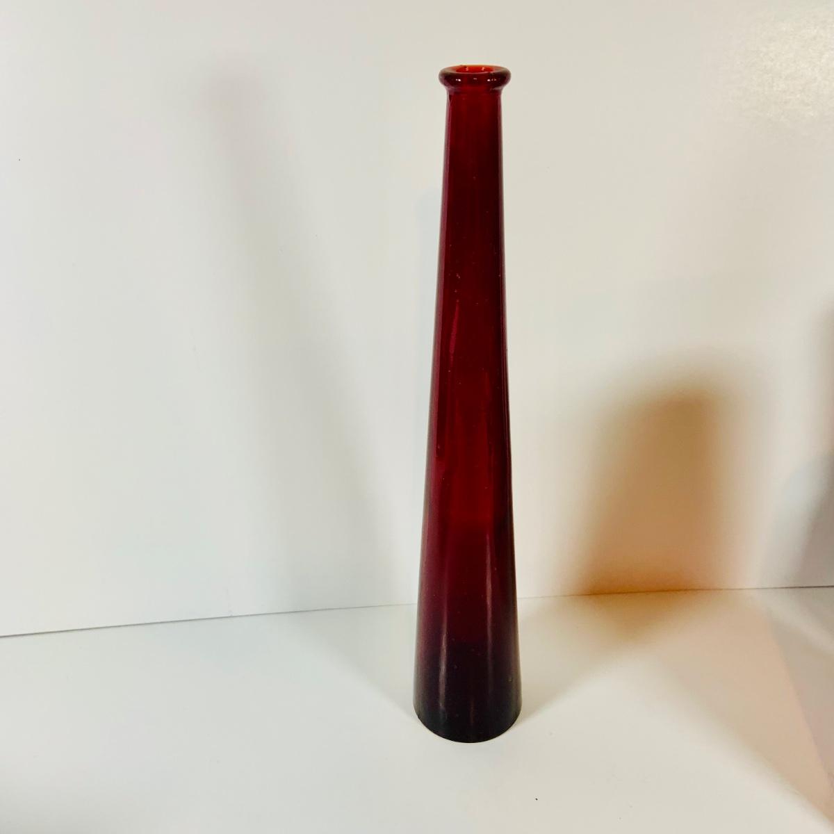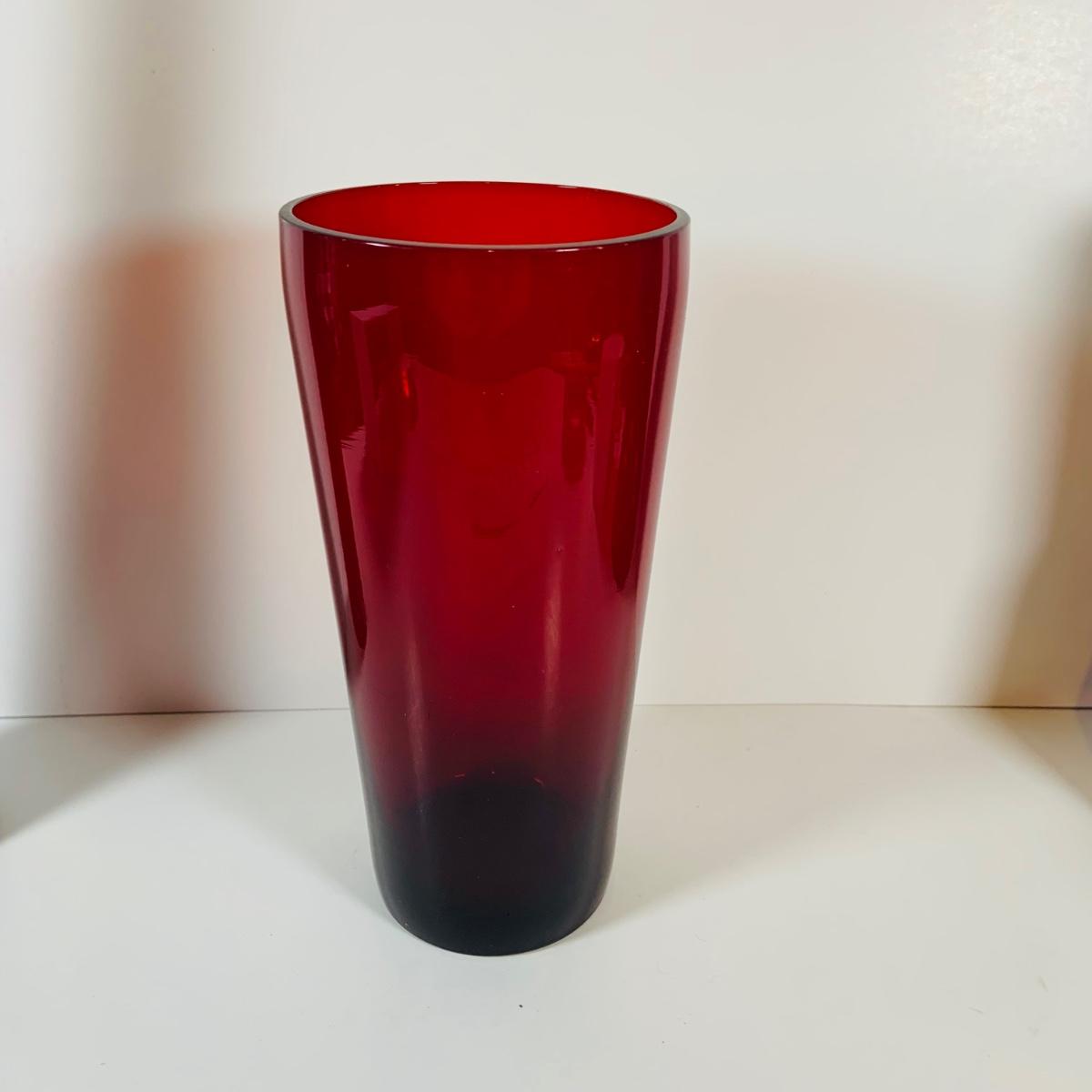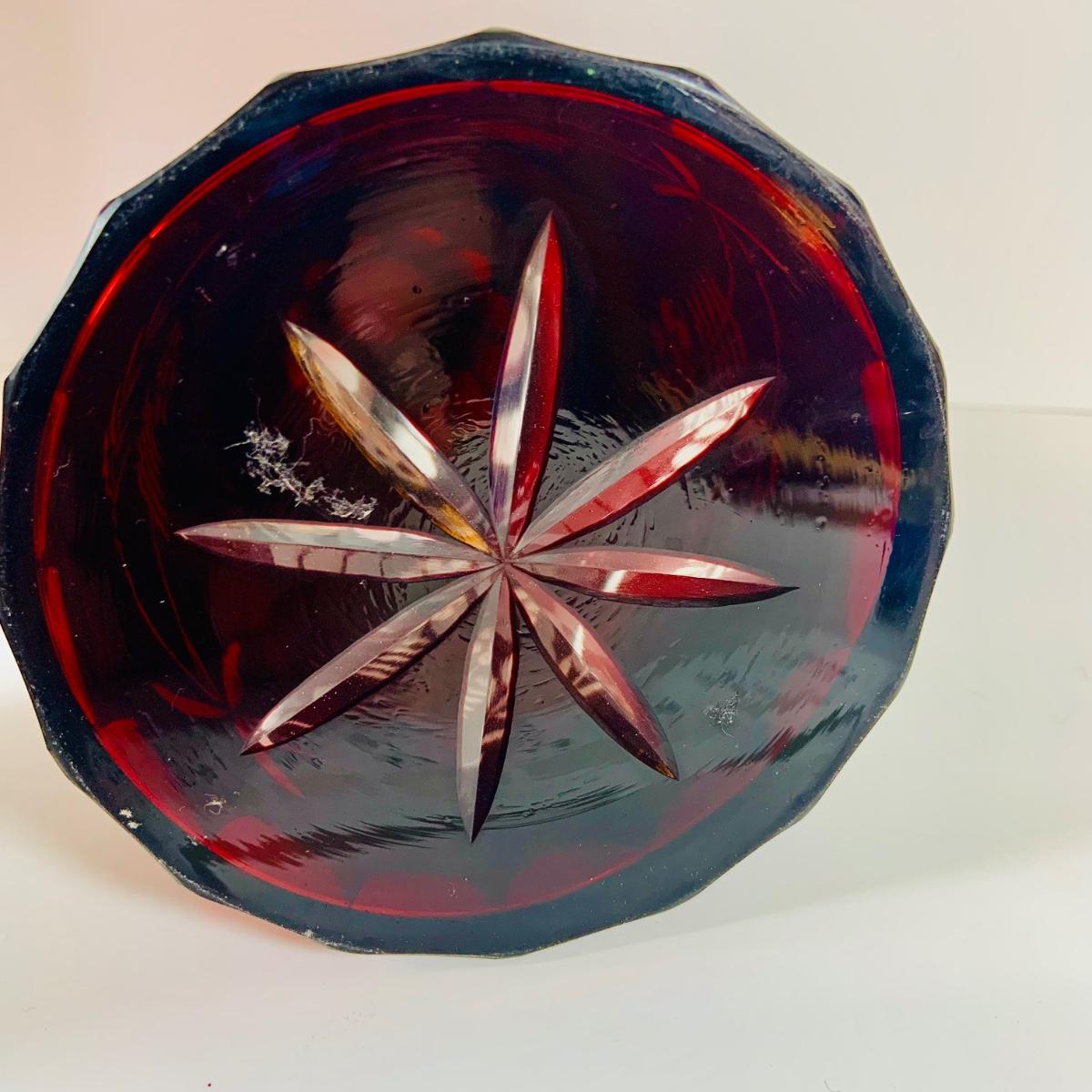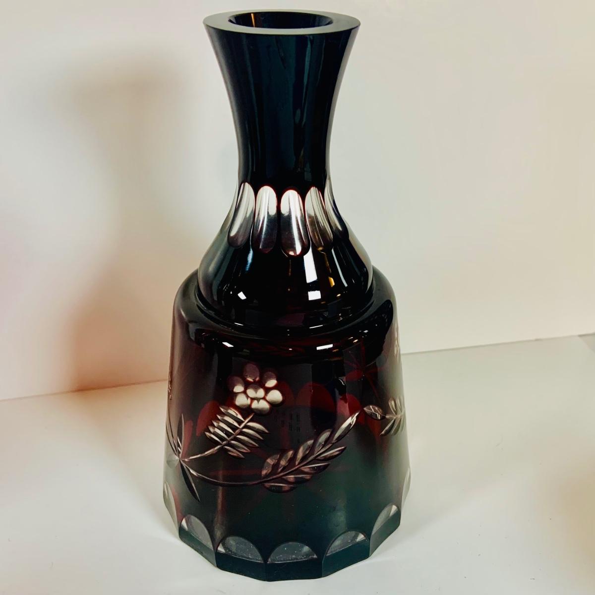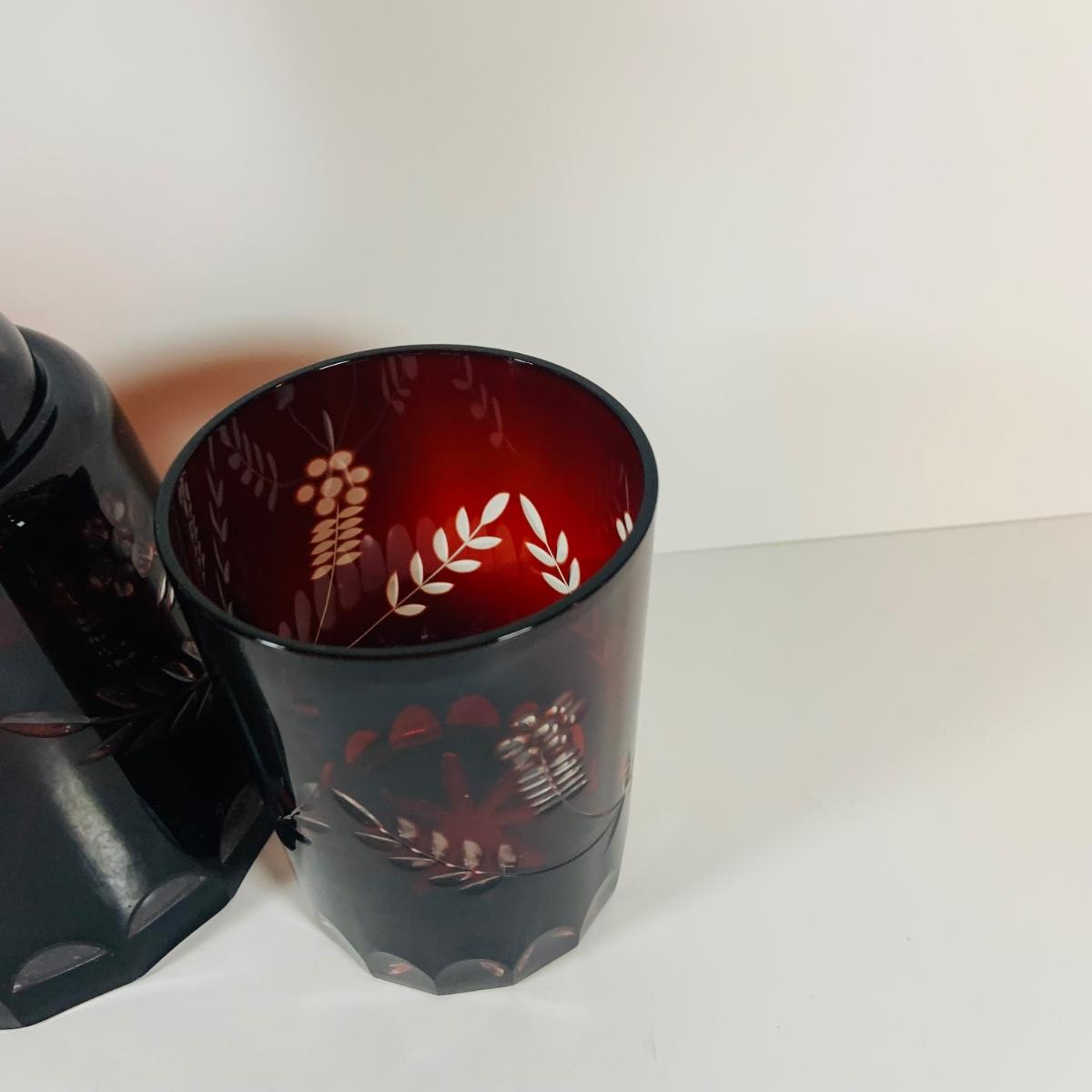 Lot 9: Bohemian Czech Amethyst Cut Glass Decanter and Tumbler and Red Art Glass Vases
