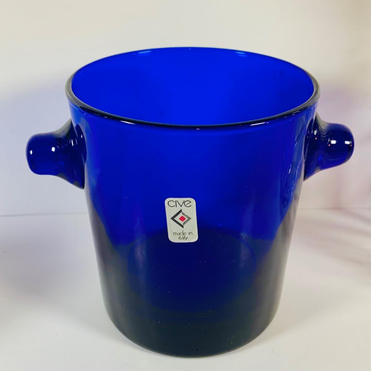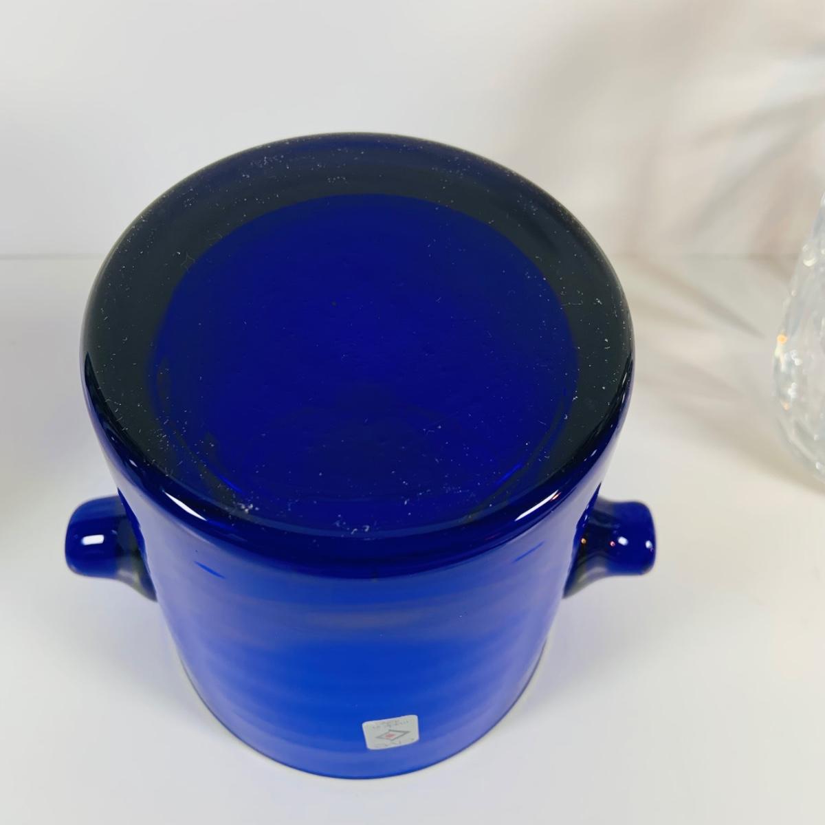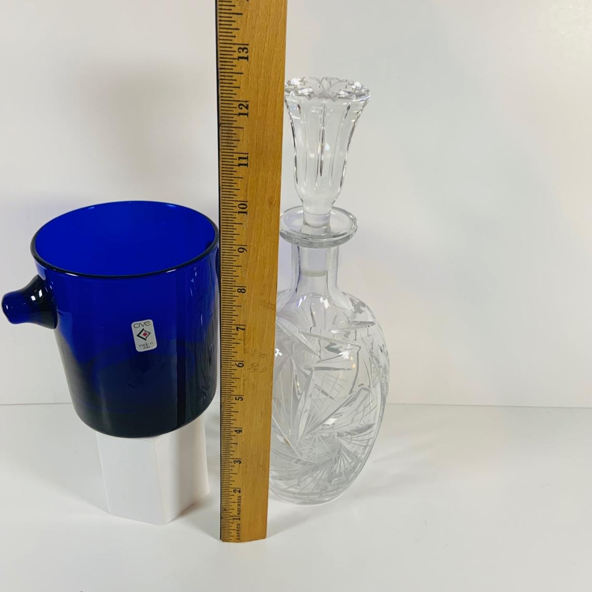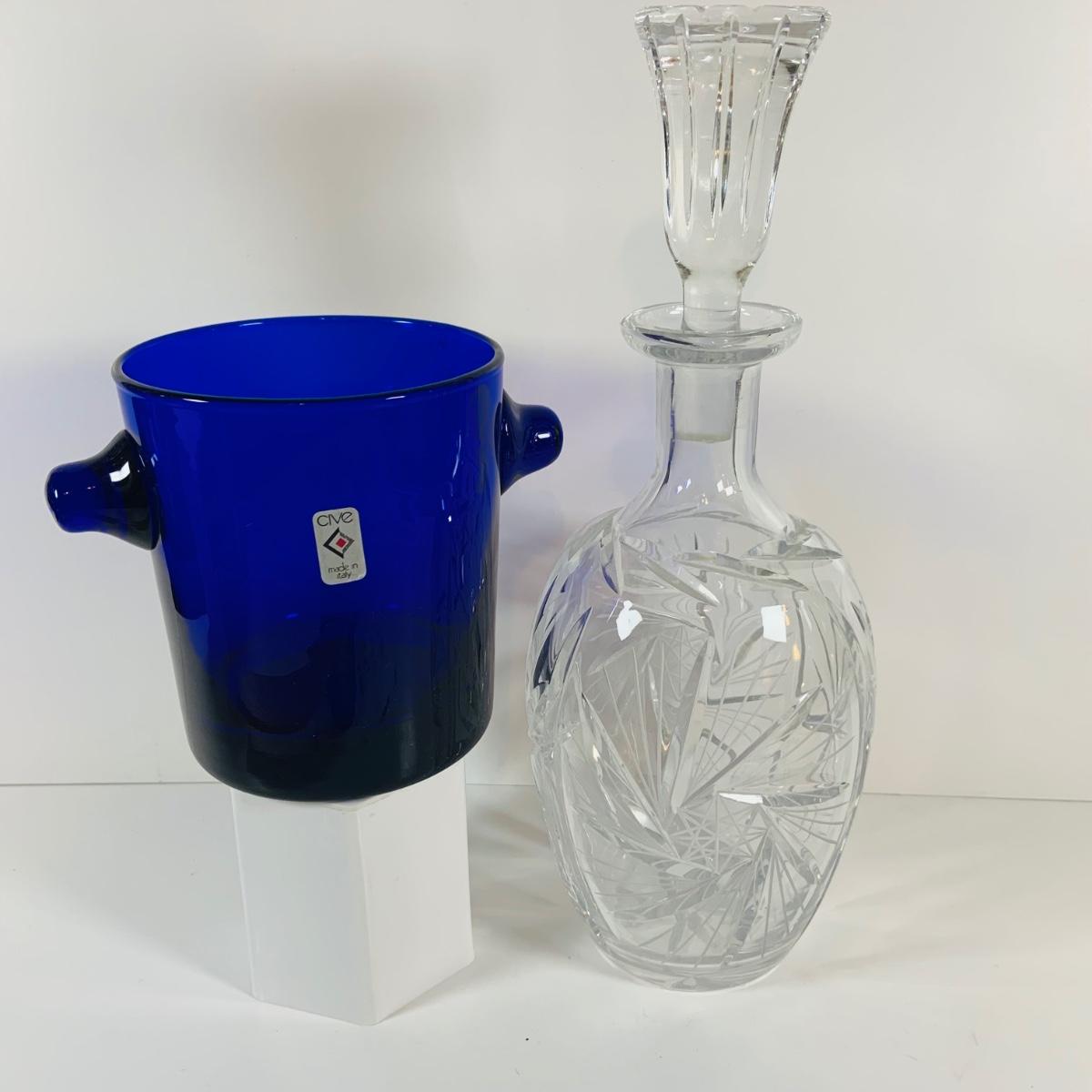 LOT 10: Cobalt Blue Italian Made Glass Ice Bucket by Clive and Crystal Cut Glass Decanter with Stopper