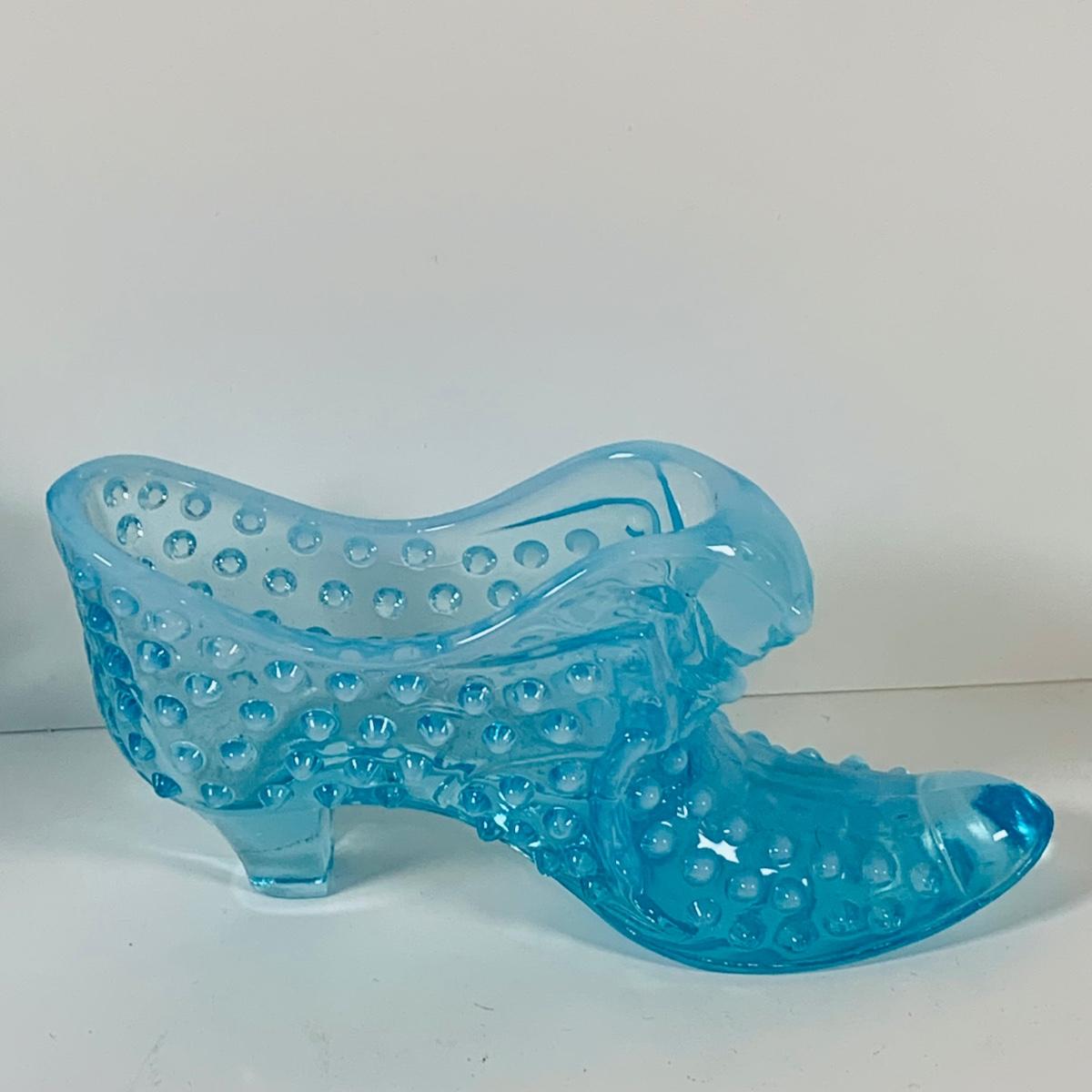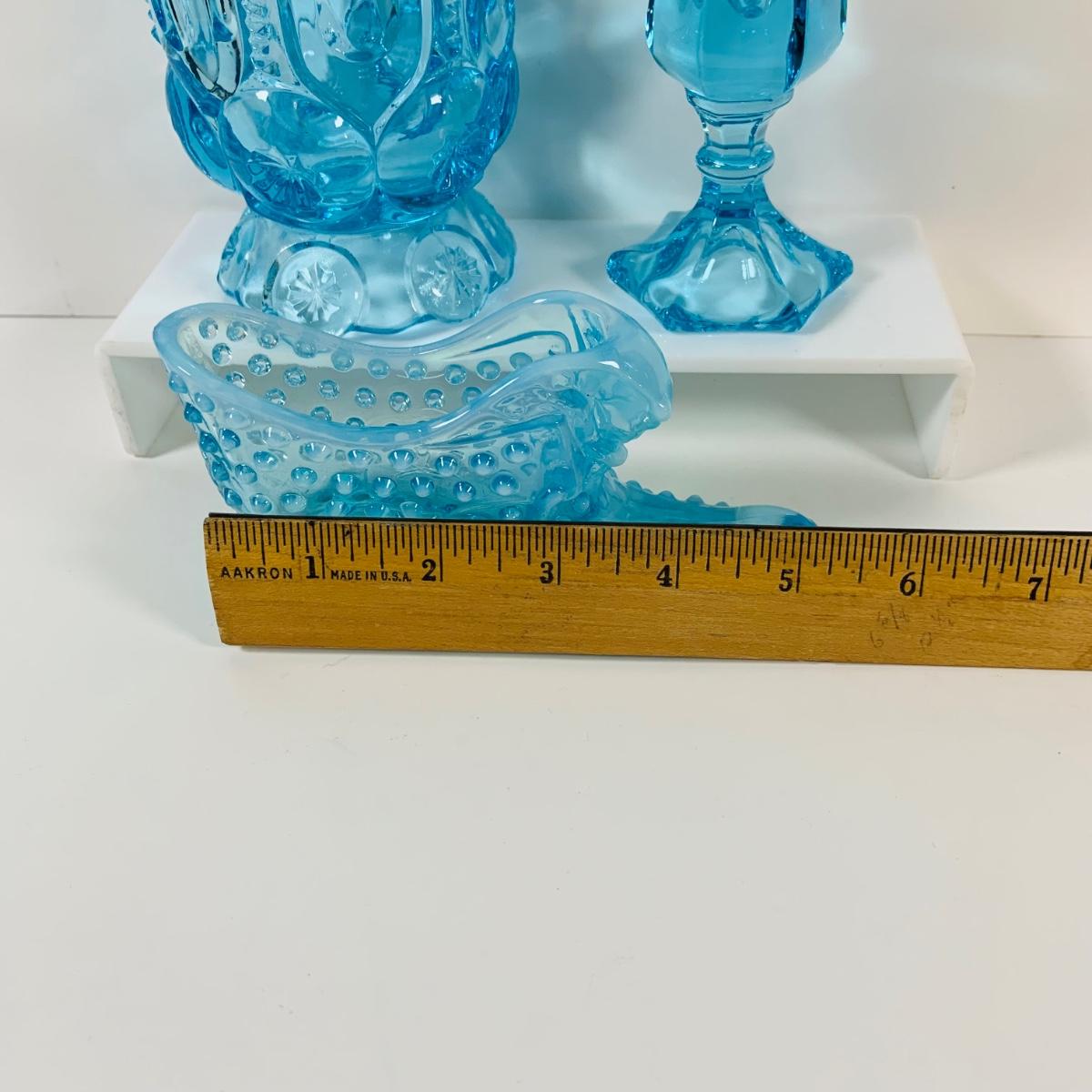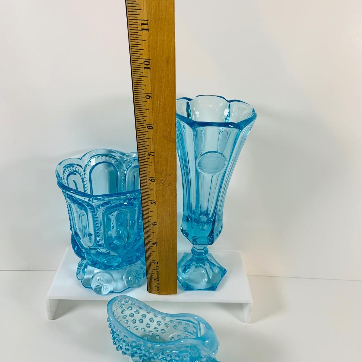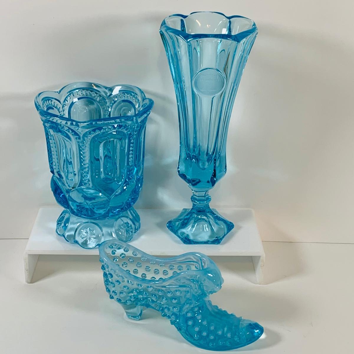LOT 12: Fostoria Coin Blue Vase, Moon and Stars Footed Vase and Hobnail Glass Shoe