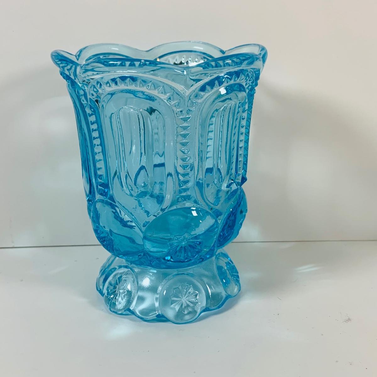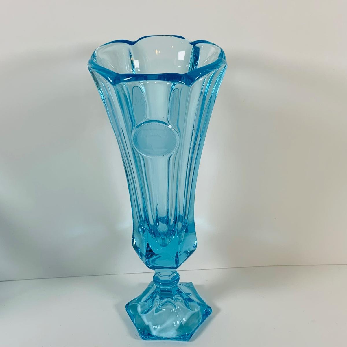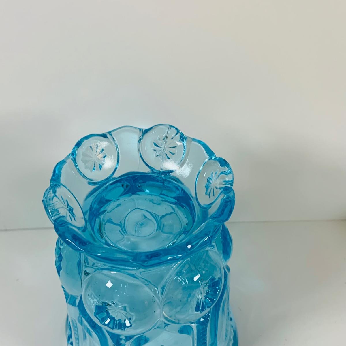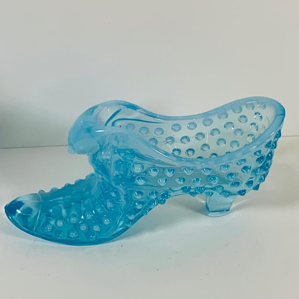 LOT 12: Fostoria Coin Blue Vase, Moon and Stars Footed Vase and Hobnail Glass Shoe