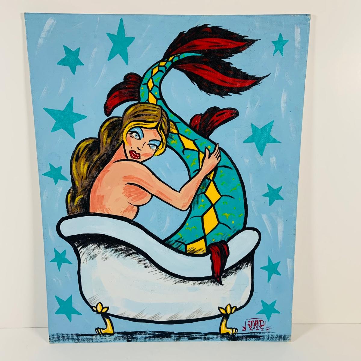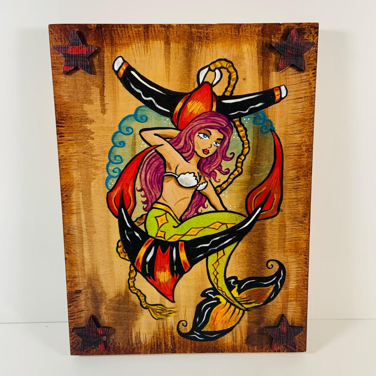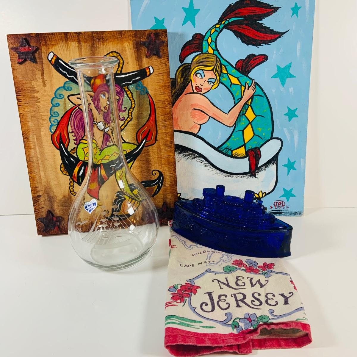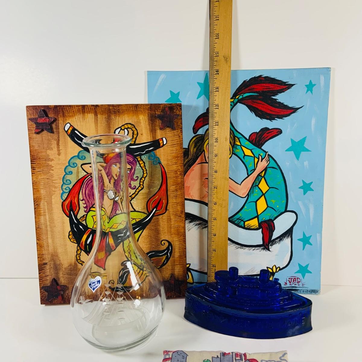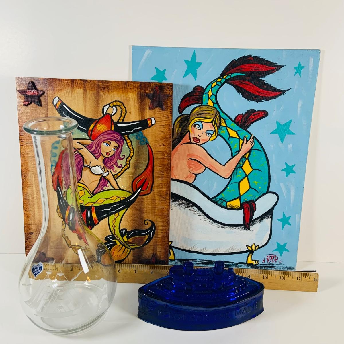 LOT 25: Mermaid Art by James Dampier, Javit Crystal Decanter with Etched Sailboat, Glass Boat Candy Dish